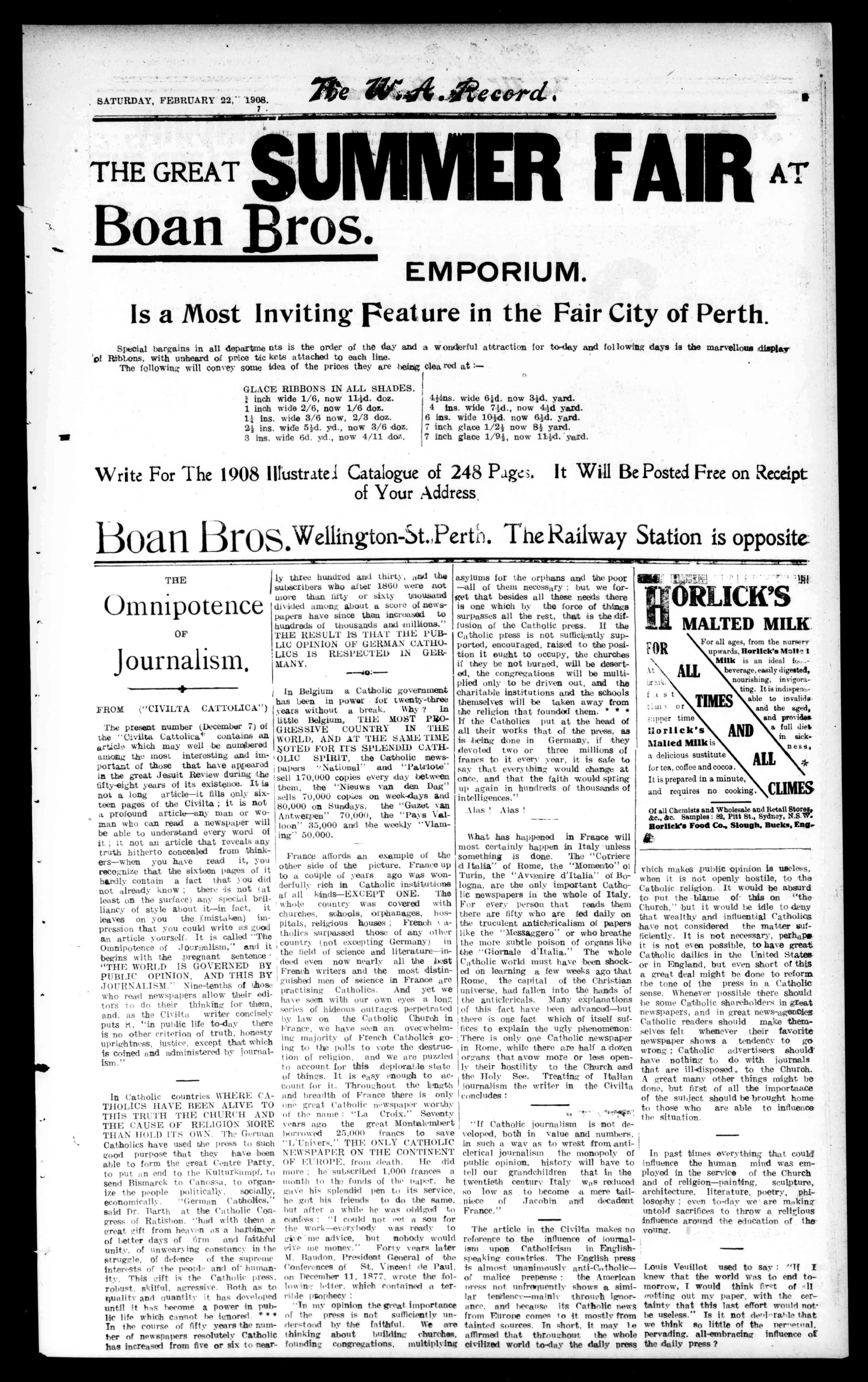Mb, *fiePolk (Afloatatthodelticpab ALITTLEBolesPAINFULBURN. miei onTuesdaynight-thelitatavailableopportunity,theIrishmenof AMOTHER'SPRAIsEFOR%A11-Perth,showedtheirappreciationof the"QueenofIrishSong"-Miss Narelle-byareceptionunearalelled inattendanceandunecatalitalinenthusiasm.TheClubroomsweremost artisticallydecorated,thetordant colorofErin,,predotainating111,_walls Tsangcoveredoverwithlovelyemblematicscrols.TheimmenseMillard Room,thevisitorsroom,cardroom. LibraryandReadingRoom,the StrangersRoomandbalconies-all werepackedwithaneagerandimpetuouscrowdwhohadassembledto readerhonortothelendingIrish Soprano,andthefirstinterpreterof IrishMusic,ontheelusicelstageat thepresenttime. IVehaveseen meetingsatthatClubthatdemanded ouradmiration,butuntilTuesday nightwedidnotandCouldnot.imaginewhattheintensityofIrishimthesiastitmeant,antiwecouldnot eventhenrealisewhatalargenamberofpeoplewishedtoIs,Irishin orderto!citeinthegleeciliated:eau, andtoberecognisedasasupp,,rt,,r andadmirerofthegreatIrishnee stress. afterthereceptitnpropercotton, dthetoastofthedising'ui.Itd guestwasproposedbytheChairman Air.Maxwill,andsupportedbythe Mayor,Mr.Molloy.Thedriftofthe speecheswasasamatterofcourse, eulogistic.Thespeakershadgood matter-asplendidsubject-anunique opportunity.Aniiteriliieaesenthlagt waspreparedtoell.,r sentence totheechoandthespealersexpressedthemsehiisdaintily,cleverly,and volublyandtheinthenseauienee lustilycheered'.Songswererendered remarkablemoreforeffectthanfor theexpressionandsentimentalitythat wouldbehonoredandapshatieedon suchanoccasion.MissWig2;ett,sang hersongswithgreattasteendexpr'scion,andwasconelitnertedby theDiva.Soalsodidtheothers. Therewasnotmuchlashmusig rendered.Wethinkhoweverthaton suchoccasionsit,werebetterathousand;huestohaveIrishsongs,!note-liesnrsalad'srenderedbyaCelt withasoul-movingvoice.anda 'sympatheticexpression,thanallthe songson'Eternity'BrightEyes'and 'Love,"thatcouldberenderedfor ye.Wedonotspeakdeprecatingly, !penes,weknowthedifficultyoffindin_!; singerswholoveIrishmusic, andion.twvehiethhermefaoyre heonlpeYrhaoterfserielawn opinorentirelydisposedofbythosewho knowthecircumstancesbetterthen wedo..rustbeforeMr.Telbotrepliedtothetoastofthedistintruishedguest,Mr.T.F.Quinlanmadea fewremarksinthecourseofwhich hereferredtotheverygene,rousmannerinwhichtheGovernmentendCity