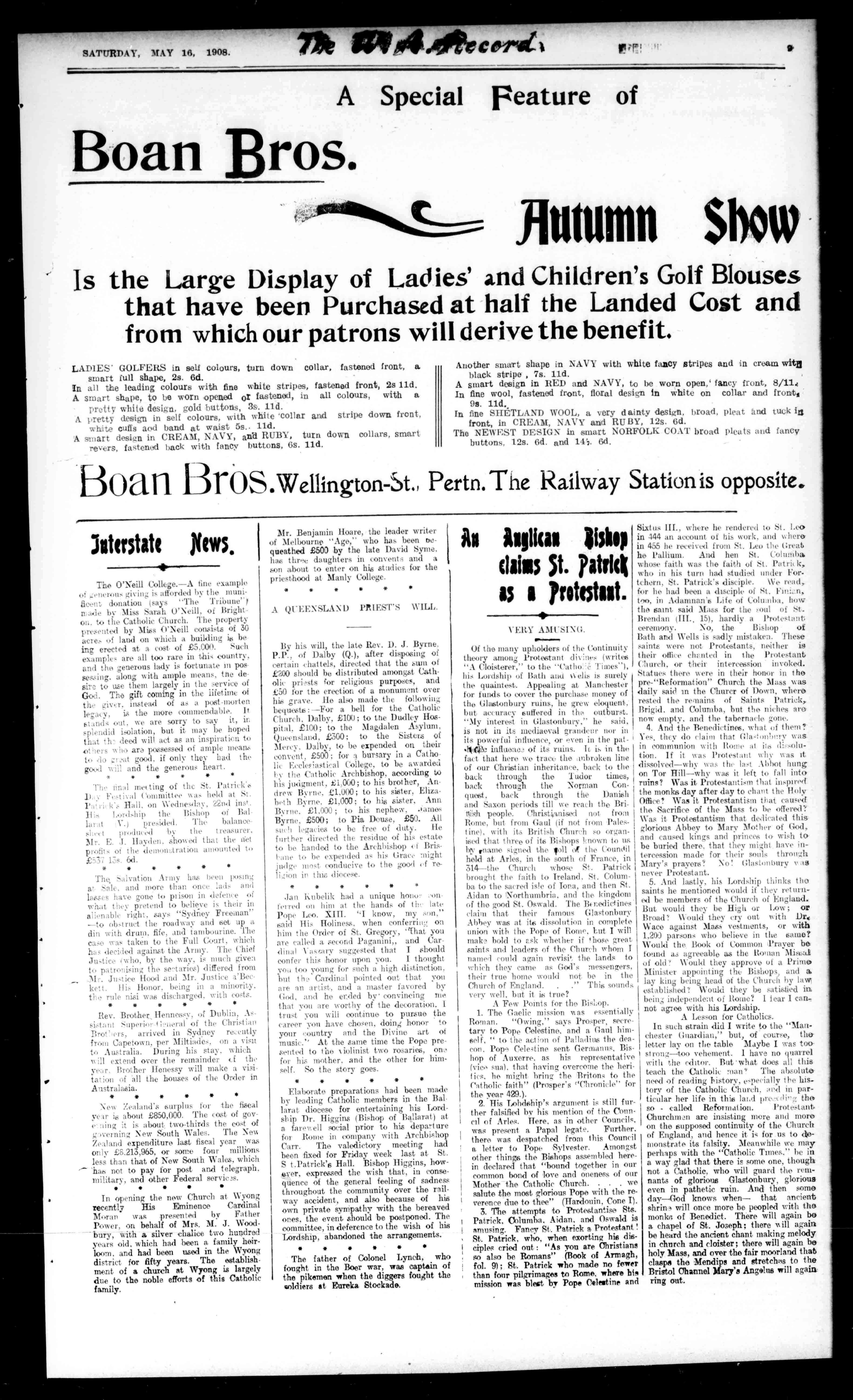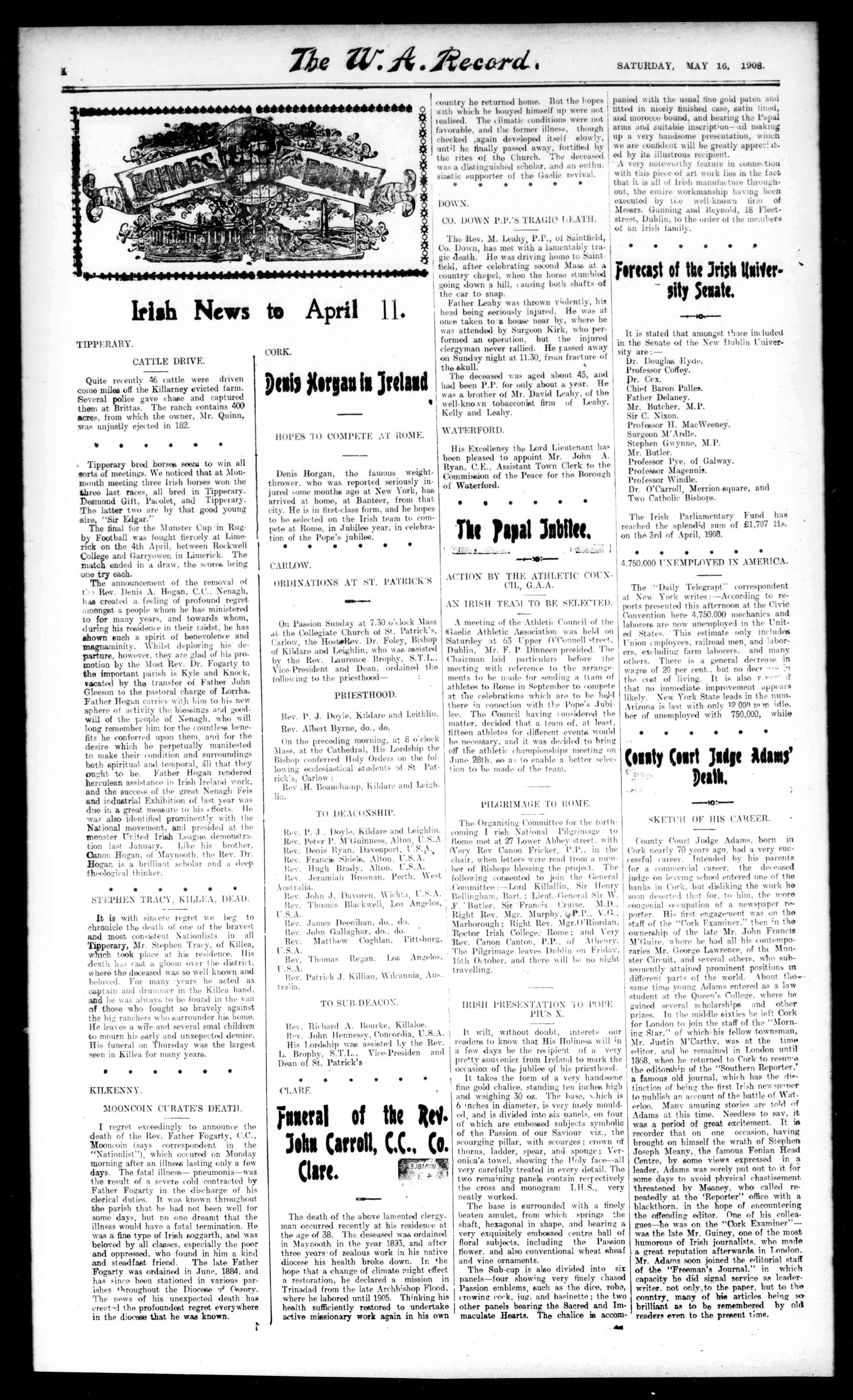 ThefinalfurtheMunsterCupinRugbyFootballwasfoughtfiercelyatLimerickonthe4thApril,betweenRockwell CollegeandGarryoweninLimerick.The snatchendedinadraw,thescoresbeing onetryeach. Theannouncementoftheremovalof Rev.DenisA.Hogan,C.CNenagh, hascreateda,feelingofprofoundregret emongstapeoplewhomhehasministered toformanyyears,andtowardswhom, duringhisresidenceintheirmidst.hehas shownsuchaspiritofbenevolenceand magnaminity.1Vhilstdeploringhisdeparture,however,theyaregladofhispro. motionbytheMostRev.Dr.Fogartyto theimportantparishisKyleandKnock, vacatedbythetransferofFatherJohn GleesontothepastoralchargeofLorrha. FatherHogancarrieswithhinttohisnew sphereofactivitytheblessingsandgoodwillofthepeopleofNenagh,whowill longrememberhimforthecountlessbenefitsheconferreduponthem,andforthe desirewhichheperpetuallymanifested tomaketheirconditionandsurroundings bothspiritualandtemporal,tillthatthey oughttobe.FatherHoganrendered herculeanassistanceinIrishIrelandwork, andthesuccessofthegreatNenaghFeis andindustrialExhibitionoflastyearseas dueinagreatmeasuretohisefforts.Ile wasalsoidentifiedprominentlywiththe Nationalmovement,andpresidedatthe monsterUnitedIrishLeaguedemonstrationlastJanuary.Likehisbrother. CanonHogan,ofMaytatoth.theRev.Dr. Hoganisabrilliantscholarandadeep theologicalthinker.