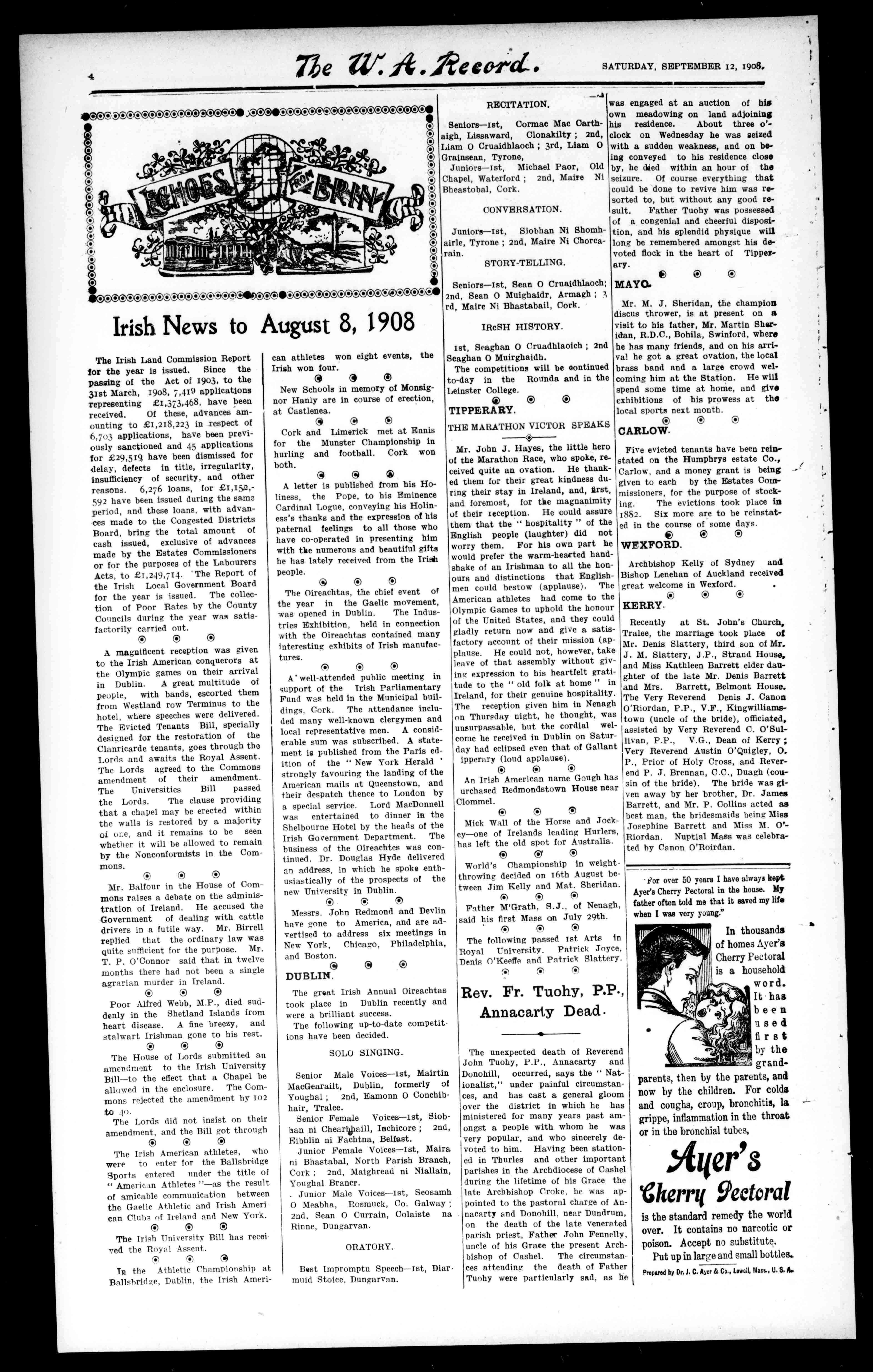Amagnificentreceptionwasgiven totheIrishAmericanconquerorsat theOlympicgamesontheirarrival inDublin. Agreatmultitudeof people,withbands,escortedthem fromWestlandrowTerminustothe hotel,wherespeechesweredelivered. TheEvictedTenantsBill,specially designedfurtherestorationofthe Clanricardetenants,goesthroughthe LordsandawaitstheRoyalAssent. TheLordsagreedtotheCommons amendmentoftheiramendment. TheUniversities Billpassed theLords. Theclauseproviding thatachapelmaybeerectedwithin thewallsisrestoredbyamajority ofor-e,anditremainstobeseen whetheritwillbeallowedtoremain bytheNonconformistsintheCommons. 0