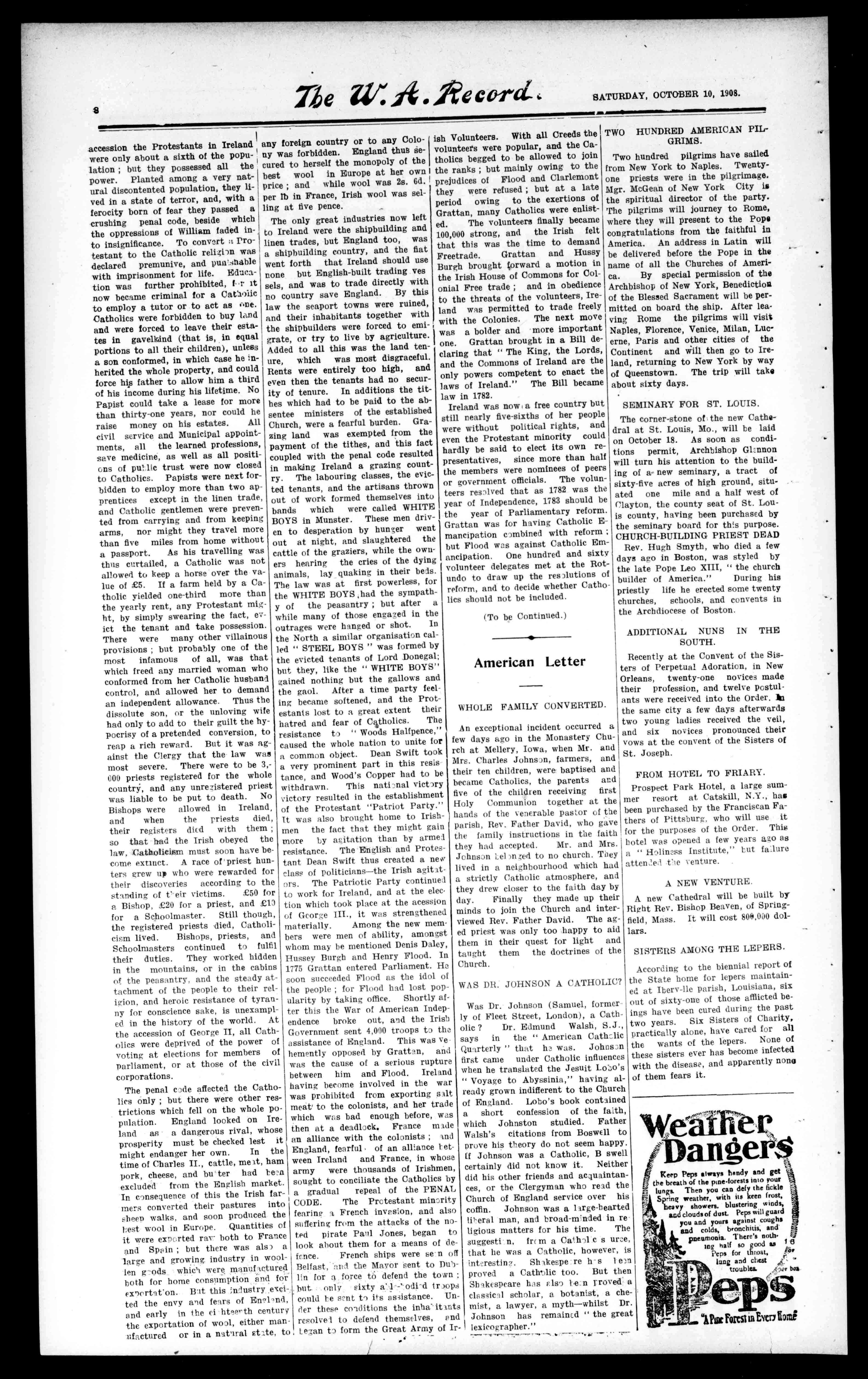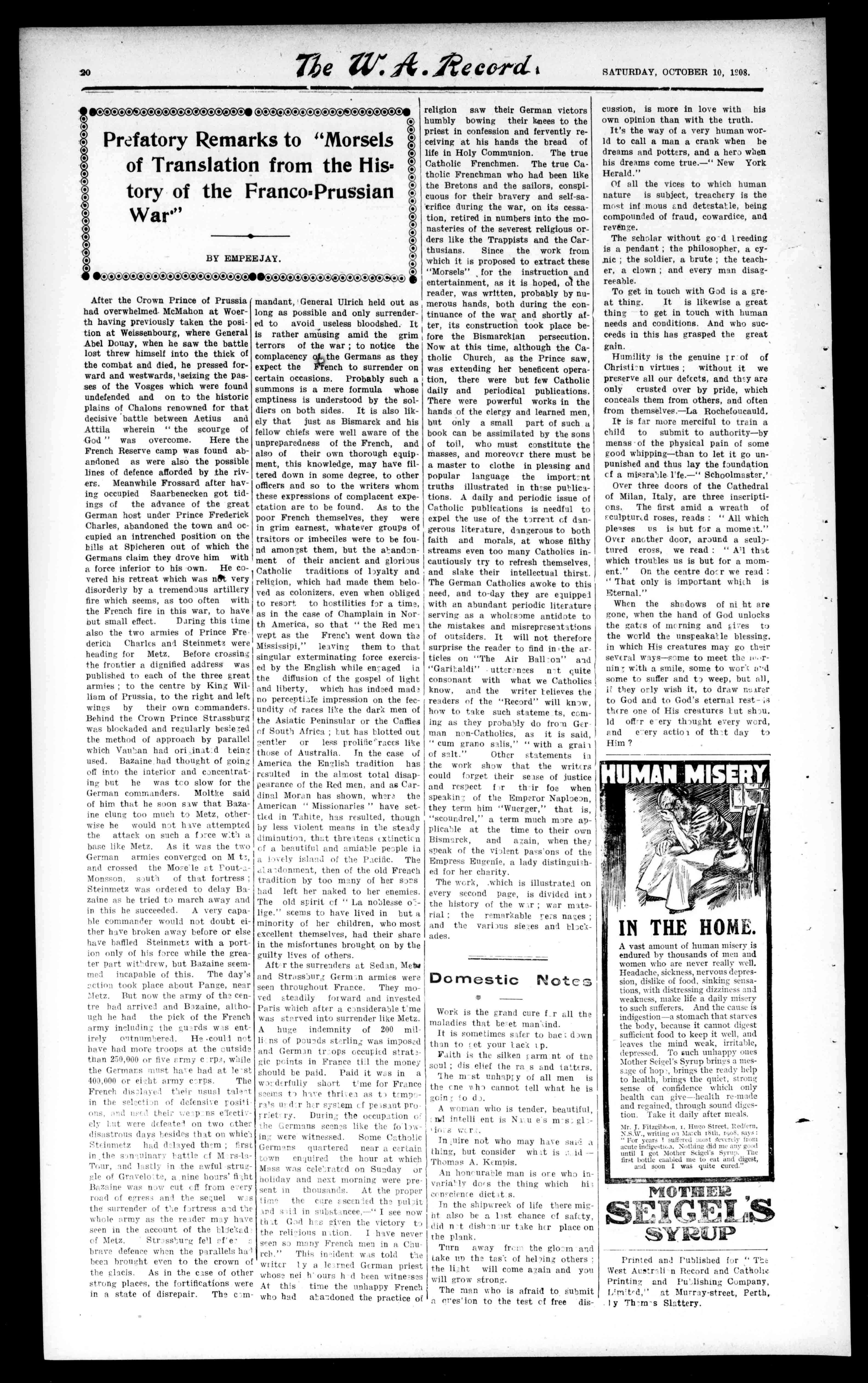 religionsawtheirGermanvictors humblybowingtheirkneestothe priestinconfessionandferventlyreceivingathishandsthebreadof lifeinHolyCommunion.Thetrue CatholicFrenchmen.ThetrueCatholicFrenchmanwhohadbeenlike theBretonsandthesailors,conspicuousfortheirbraveryandself-sacrificeduringthewar,onitscessation,retiredinnumbersintothemonasteriesoftheseverestreligiousordersliketheTrappistsandtheCarthusians.Sincetheworkfrom whichitisproposedtoextractthese "Morsels"fortheinstructionand entertainment,asitishoped,o'tthe reader,waswritten,probablybynumeroushands,bothduringthecontinuanceofthewarandshortlyafter,itsconstructiontookplacebeforetheBismarckianpersecution. Nowatthistime,althoughtheCatholicChurch,asthePrincesaw, wasextendingherbeneficentoperation,therewerebutfewCatholic dailyandperiodicalpublications. Therewerepowerfulworksinthe handsoftheclergyandlearnedmen, butonlyasmallpartofsucha bookcanbeassimilatedbythesons oftoil,whomustconstitutethe masses,andmoreovertheremustbe amastertoclotheinpleasingand popularlanguagetheimportant truthsillustratedinthosepublications.Adailyandperiodicissueof Catholicpublicationsisneedfulto expeltheuseofthetorrentcfdangerousliterature,dangeroustoboth faithandmorals,atwhosefilthy streamseventoomanyCatholicsincautiouslytrytorefreshthemselves, andslaketheirintellectualthirst. TheGermanCatholicsawoketothis need,andto-daytheyareeluippei withanabundantperiodicliterature servingasawholesomeantidoteto themistakesandmisrepresentations ofoutsiders.Itwillnottherefore surprisethereadertofindin,thearticleson"TheAirBall-on"and "Garibaldi"utter-sneesntquite consonantwithwhatweCatholics know,andthewritertelievesthe readersofthe"Record"willknow, howtotakesuchstatemets,comingastheyprobablydofromGermannon-Catholics,asitissaid, "cumgranosells,""withagrai ofsalt." OtherstatementsiA theworkshowthatthewriters couldfar-gettheirseiseofjustice andrespectfrth-irfoewhen speakingoftheEmperorNaploeon, theytermhim"Wuerger,"thatis, "scoundrel,"atermmuchmoreapplicableatthetimetotheirown Bismarck,andagain,whenthey speakoftheviolentPaes'onsofthe EmpressEugenie,aladydistinguishedforhercharity.