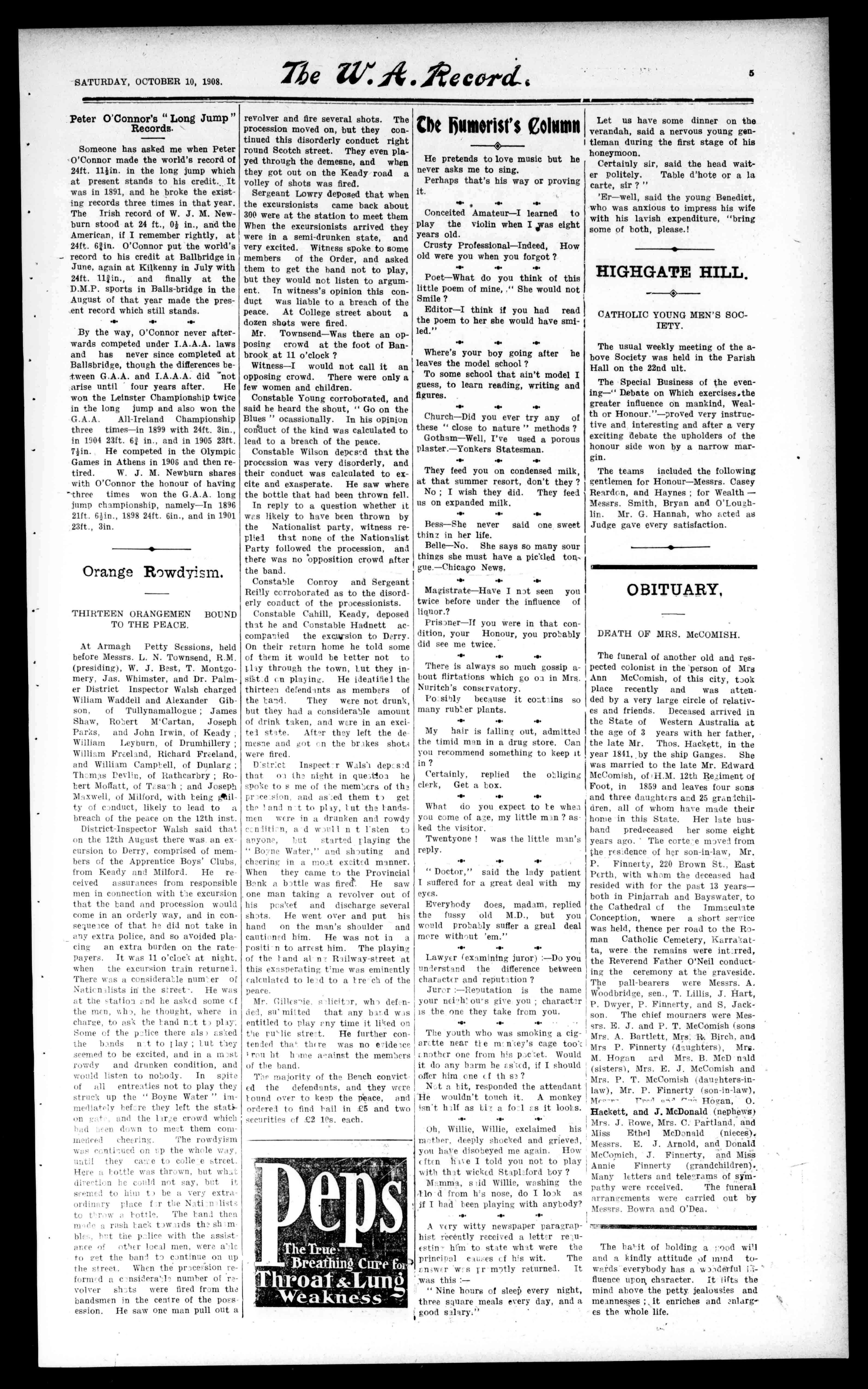 AtArmaghPettySessions,held beforeMessrs.L.N.Townsend,R.M. (presiding),W.J.Best,T.Montgomery,Jas.Whimster,andDr.PalmerDistrictInspectorWalshcharged WiliamWaddellandAlexanderGibson,ofTullynamallogueJames Shaw,RobertM'Cartan,Joseph Parks,andJohnIrwin,ofKeady Leyburn,ofDrurnhillery WilliamFreeland,RichardFreeland, andWilliamCampbell,ofDunlarg ThemasDevlin,ofRathcarbry;RobertMoffatt,ofTesa-handJoseph Maxwell,ofMilford,withbeingAiltyofconduct,likelytoleadtoa breachofthepeaceonthe12thinst. District-InspectorWalshsaidthat onthe12thAugusttherewasanexcursiontoDerry,comprisedofmembersoftheApprenticeBoys'Clubs, fromKeadyandMilford.Hereceivedassurancesfromresponsible meninconnectionwithteeexcursion thatthebandandprocessionwould comeinanorderlyway,andinconsequeiceofthathadidnottakein anyextrapolice,andsoavoidedPlacinganextraburdenontheratePayers.Itwas11o'clockatnight, whentheexcursiontrainreturned. Therewasaconsiderablenum':erof Naticnolistsinthestreet-.Hewas attheetationendheaskedsomecf themen,eh),hethought,wherein charee,toaskthebandnetti Someofthepolicethereals)asked thebandsnttoIlaybutthey seemedtobeexcited,andinamost rowdyanddrunkencondition,and wouldlistentonobody.Inspite ofallentreatiesnottoplaythey struckupthe"BoyneWater"immediatelybeforetheyleftthestateongetandthe1ireecrowdwhich hadBeendowntomeetthemcommencedcheering. Therowdyism waseentieuedonlipthewholeway, untiltheycaes-etocolicestreet. Hereabottlewasthrown,butvi-het direetionhecouldnotsay,butit seemedtohimtrbeaveryextraordinaryplacefirtheNati:n,lists tot'-owabottle.Thebandthen molearashtacktoldsthesh Wee,hatthevlicewiththeassistanceofotherlocalmen,werea':le tonetthebandtocontinueonup thestreet.Whentheproces-sionreformedac'nsideraSlenumberof*revolvershotswerefiredfromthe bandsmeninthecentreofthepossession.Hesawonemanpullouta