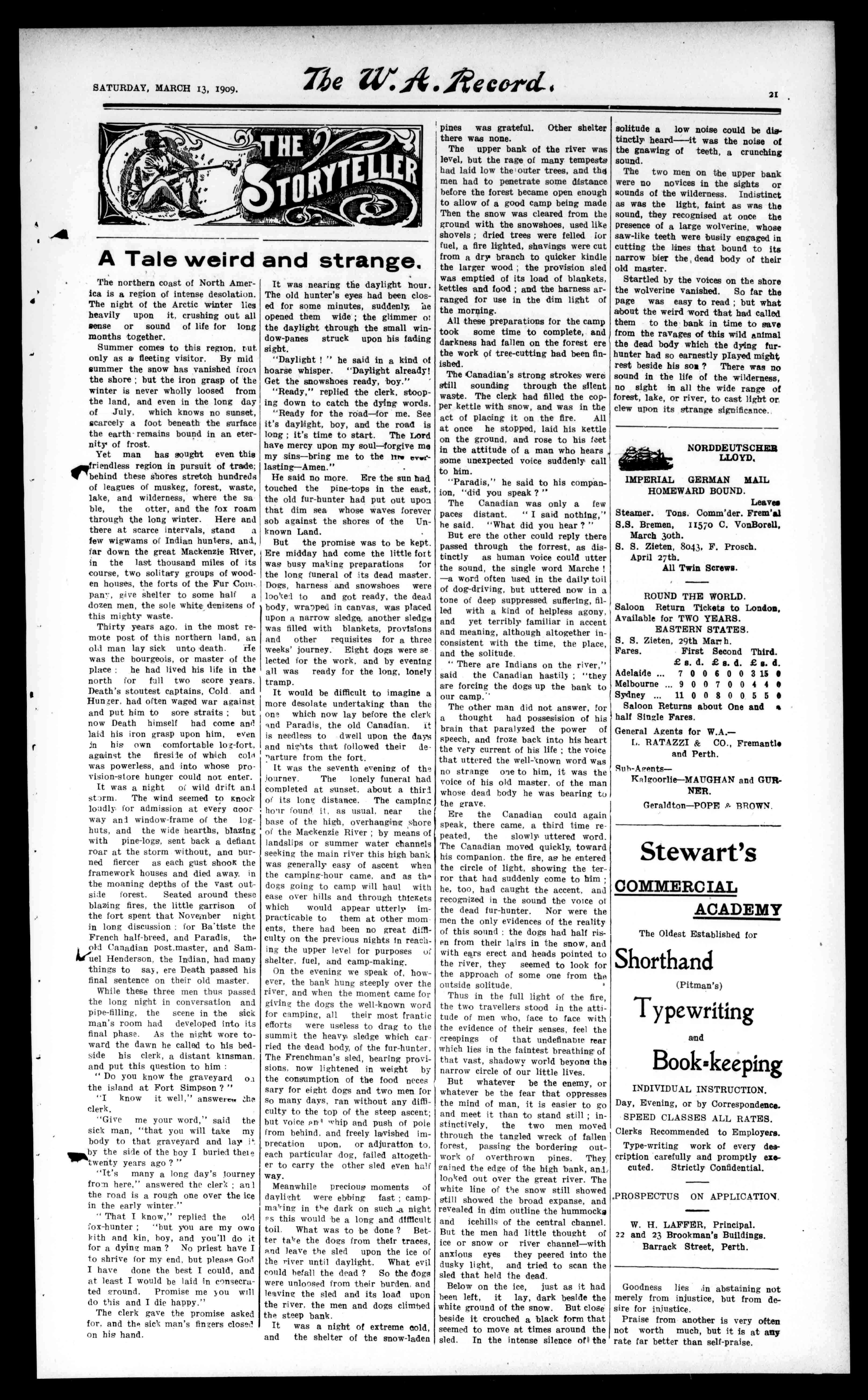ATaleweirdandstrange. ThenortherncoastofNorthAmericaisaregionofintensedesolation. ThenightoftheArctic'winterlies heavilyuponit,crushingoutall senseorsoundoflifeforlong monthstogether.
