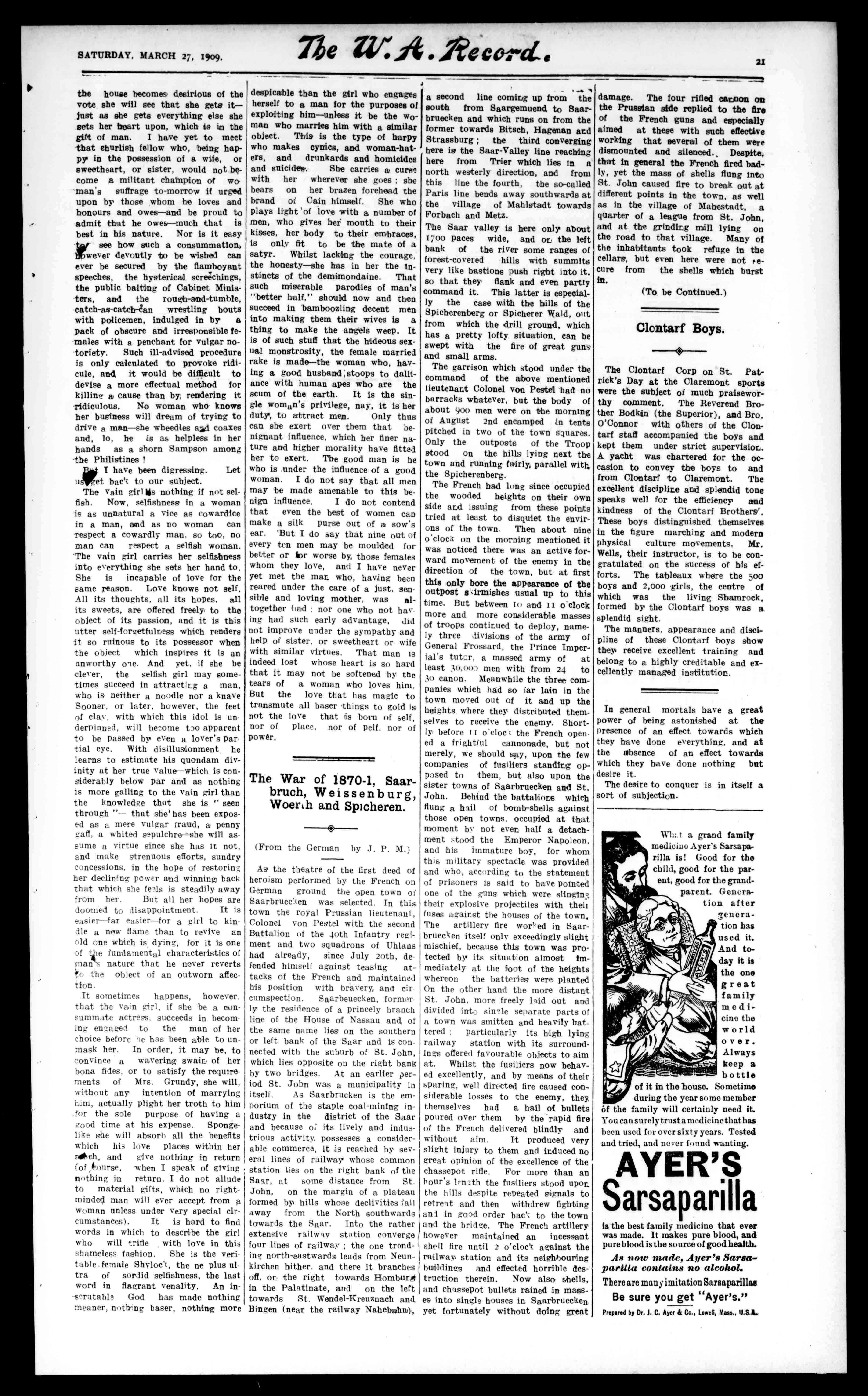 ClontarfBoys. -4-- TheClontarfCorponSt.Patrick'sDayattheClaremontsports werethesubjectofmuchpraiseworthycomment.TheReverendBrotherBodkin(theSuperior),andBro. O'ConnorwithothersoftheClontarfstaffaccompaniedtheboysand keptthemunderstrictsupervision. Ayachtwascharteredfortheoccasiontoconveytheboystoand fromClontarftoClaremont.The excellentdisciplineandsplendidtone speakswellfortheefficiencyand kindnessoftheClontarfBrothers'. Theseboysdistinguishedthemselves inthefiguremarchingandmodern physicalculturemovements.Mr. Wells,theirinstructor,istobecongratulatedonthesuccessofhisefforts.Thetableauxwherethesoo boysand2,000girls,thecentreof whichwasthelivingShamrock, formedbytheClontarfboyswasa splendidsight.