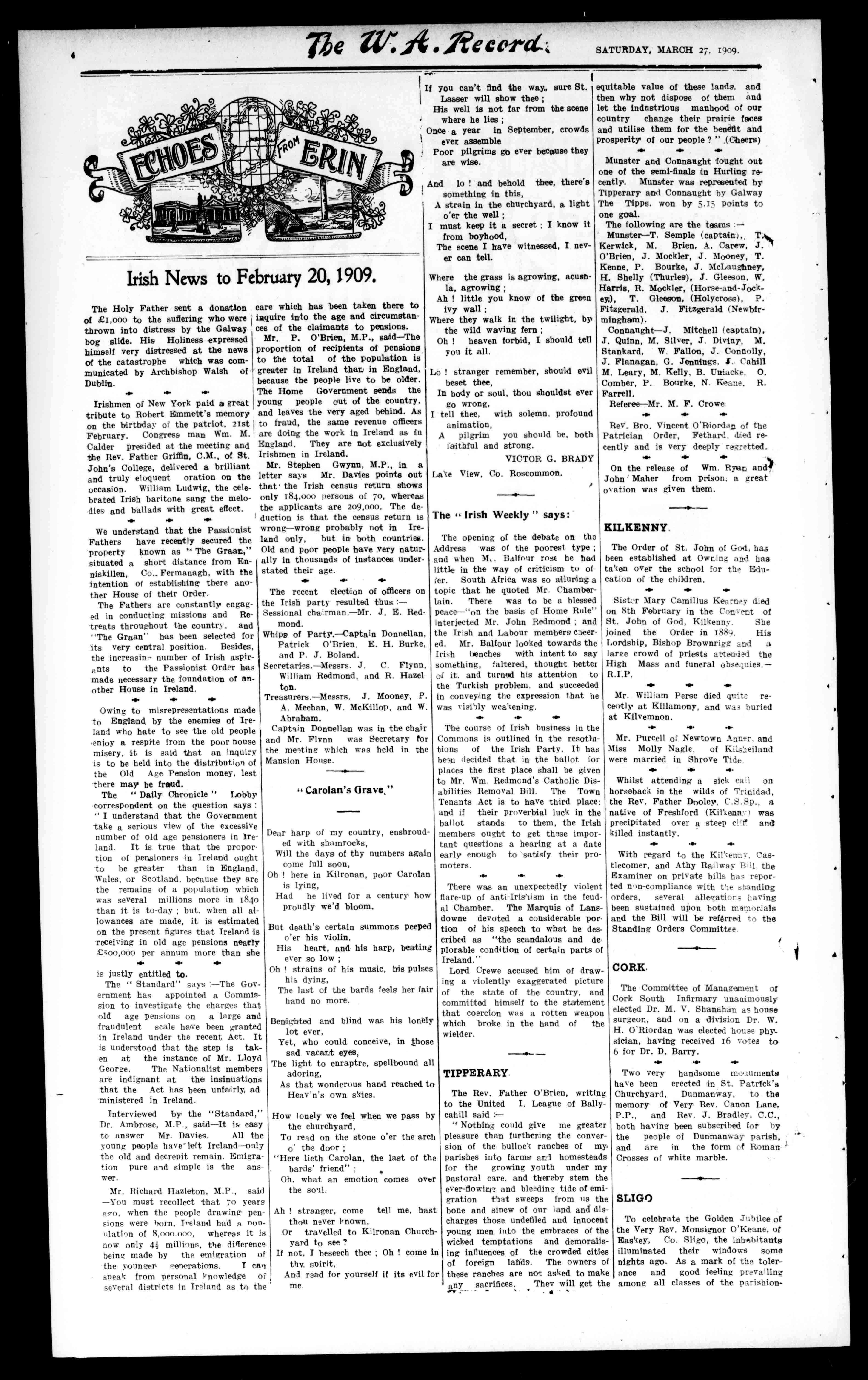 Mr.P.O'Brien,M.P.,said-The proportionofrecipientsofpensions tothetotalofthePopulationis greaterinIrelandthaninEngland, becausethepeoplelivetobeolder. TheHomeGovernmentsendsthe youngpeopleoutofthecountry, thrownintodistressbytheGalway bogslide.HisHolinessexpressed himselfverydistressedatthenews ofthecatastrophewhichwascommunicatedbyArchbishopWalshof Dublin.