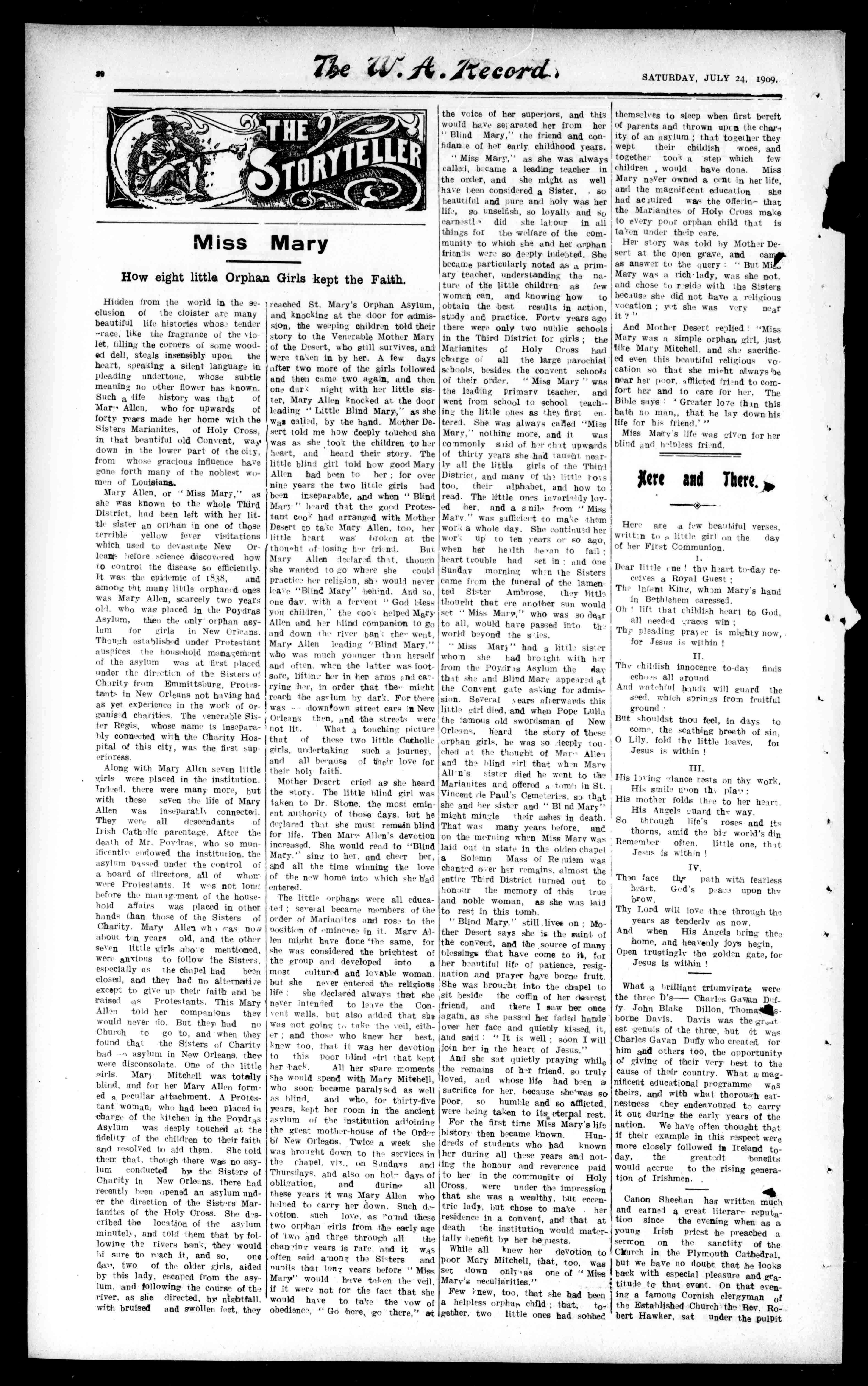 MaryAllen,or"MissMary,''as shewasknowntothewholeThird District,hadbeenleftwithherlittlesisteranorphaninoneofthose terribleyellowfevervisitations whichusedtodevastateNewOrleadstieforesciencediscoveredhow tocontrolthediseasesoefficiently. Itwastheepidemicof1838, and amongthtmanylittleorphanedones wasMaryAllen,scarcelytwoyears old,whowasplacedinthePoydras Asylum,theetheonlyorphanasy- lumforgirlsinNewOrleans. ThoughestahlistedunderProtestant auspicesthehouseholdmanagement oftheasylumwasatfirstplaced underthedirectionoftheSistersof CharityfromEmmittseurg,ProtestantsinNewOrleansnothavinghad asyetexperienceintheworkoforgeniedcharities.ThevenerableSisterRegis,whosenameisinsepara- blyconnectedwiththeCharityHos- pitalofthiscity,wasthefirstsup-