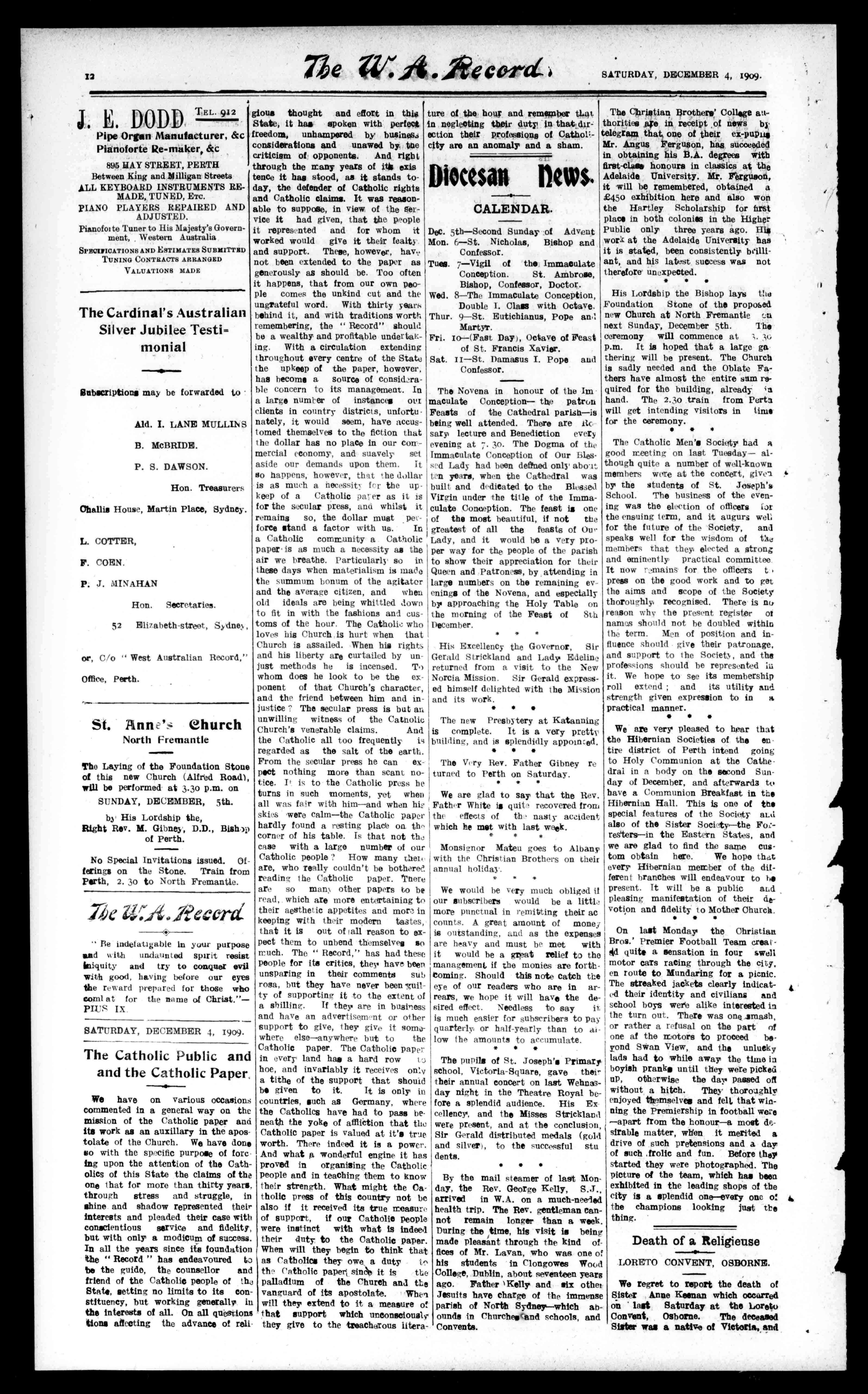OnthefollowingWednesdayeveninga"Moc'eElection,"washeld, thisIeingtheSyllabusItemforthe evening,andwascarriedoutwithoutahitch.Itwasdecidedthat thecandidates(Messrs.'fully, A. Goerke,G.Kerr,andK.Bone), shouldstandforMayorofVictoria Park."Thecandidatesspoke'gig. orouslyinsupportoftheircandida tura,anditwassoonforeseenthat thecontestwouldbeanexcitingone. Afterthe"ratepayers"hadexcised tilervotes,andthelathrcounted. theReturning-Officer(Mr.J.Pres ton),declaredMr.J.Tulleelected withMessrs.K.Bone,A.Goerke, andG.Kerrfollowingintheorder named.Thecandidatesreturning thankstothe"ratepayers." Me. G.Kerrproposedavoteofthanks totheReturning-Officerandtheexcitementwasover. OnthefollowingafternoontheSociety.'sCricketXIjourneyedtoClow tarf,whereamatch-hadbeenar ratedagainsttheOrphanageteam. Thevisitorswerewelcomedbythe Rev.Bro.O'Connor,whoconducted hemtothespaciousgrounds,where somehundredorsoyoungladswere indulgingingamesofvariouskinds. Thecrick'etmatchlasteduntillatein. theafternoon,andresultedin a driwngame.TheClontarflads showedsurprisinglygoodform,and werefarbetterexponentsofthe gamethanwasexpected.Afterthe game,thevisitorswatchedthelads atvariousgames,andsports,in whichmanyofthemexcelled. An adjournmentwasmadetothebuildingswherethedifferentdepartments wereshowntothevisitors.After 4heDormatries,Dining-toom,Chapel. Infirmitary,&c.,hadbeeninspected anadjournmentwasmadeforafternoontea,generously.providedbythe Brothers.Attheconclusion,Mr.G Kerr(President),secondedby Mr. K.Bone(Secretary),movedahear ty'voteofthankstotheRev,bre O'Connorforhiskindnessduringt afternoon.Bro.O'Connor,inthank ingthevisitorsexpressedthehope thathewouldseethemattheOrp hanageagain,atnodistantdate, sayingthatthevisitwasareal treattotheladsandarenewalet itwouldbelookedforwardtowith delightontheirpart. Theelectriclightplant,garden,its wasinspectedafterwhichthevisitors. leftforhomehavinggreatlyenjoyedtheirday'souting. Wednesdaythe24thwasan"Ath letioNight,"themenitersindulging insportsandexercisesofvarious kinds.Agoodattendanceofmentberswaspresent. TheSyllabusItemofWed. toe 24thisa"Debate"-subjecttobe fixed.Allmembersarerequestedto bepresentasthisisthelastsue jectforwhichcompetitionforthe. Society'llmedaltakesplace.