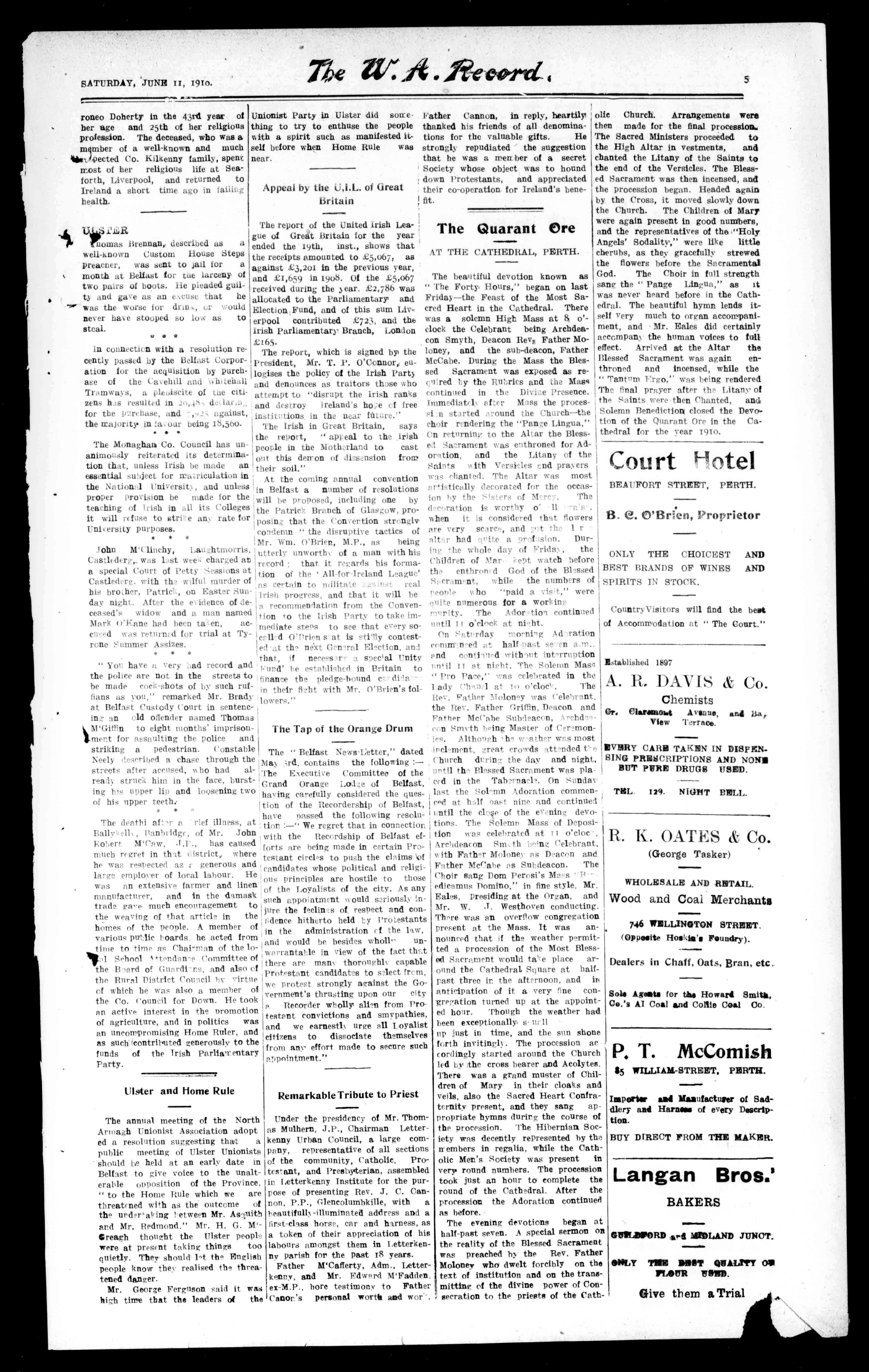 and£1,659in1908.Ofthe£5,067Thebeautifuldevotionknownas receivedduringtheyear.£2,786was"TheFortyHours,"beganonlast allocatedtotheParliamentary,andFriday-theFeastoftheMostSaElectioneFund,andofthissumLiv-credHeartintheCathedral.There erPoolcontributed£723,andthewasasolemnHighMassat8to'irishParliamentaryBranch,LondonclocktheCelebrantbeingArchdea£i65. conSmyth,DeaconRevsFatherMoiraconnectionwitharesolutionre-TherePort,whichissignedbytheLoney,andthesub-deacon,Father centlypassedbytheBelfastCorpor-President,Mr.T.1'.O'Connor,'eu-McCabe.DuringtheMasstheBlesationfortheacquisitionbyporch-logisesthepolicyoftheIrishPartysadSacramentwasexposedasreaceofthetasehillandtehicehallanddenouncesastraitorsthosewhocilfredbytheRubricsandtheMass Trrmways,apleaisciteofcuecitizenshasresultedin dellaiea fortheperehase,and against, themajorityinfaourbeing16,56o. a TheMonaghan.Co.Councilhasunanimouslyreiterateditsdeterminationthat,unlessIrishbemadean essentialsubjectformatriculationin theNationalUniversityandunless properProvisionbemadeforthe teachingofIrishinallitsColleges itwillrefusetoetre'eanyratefor Universitypurposes.