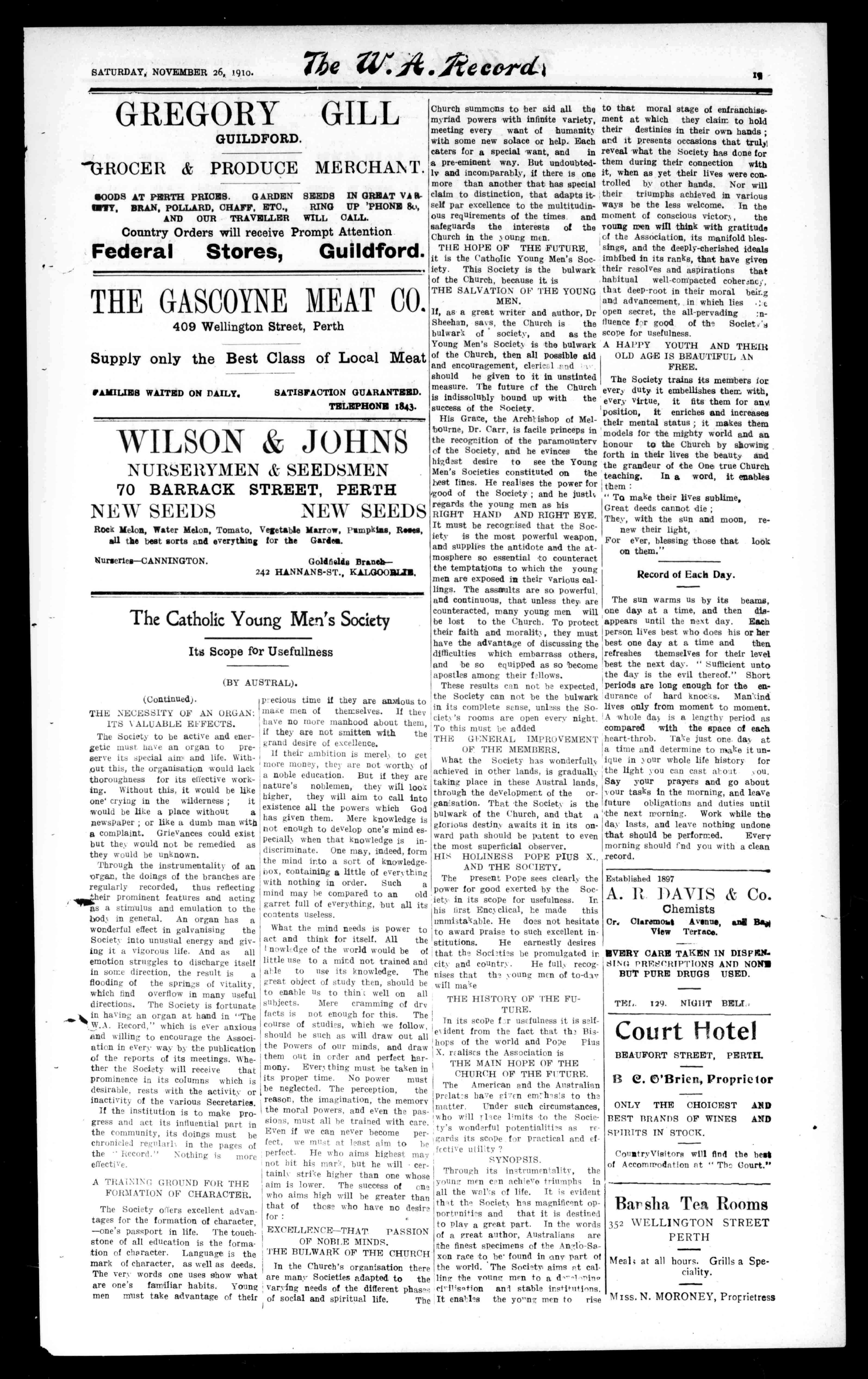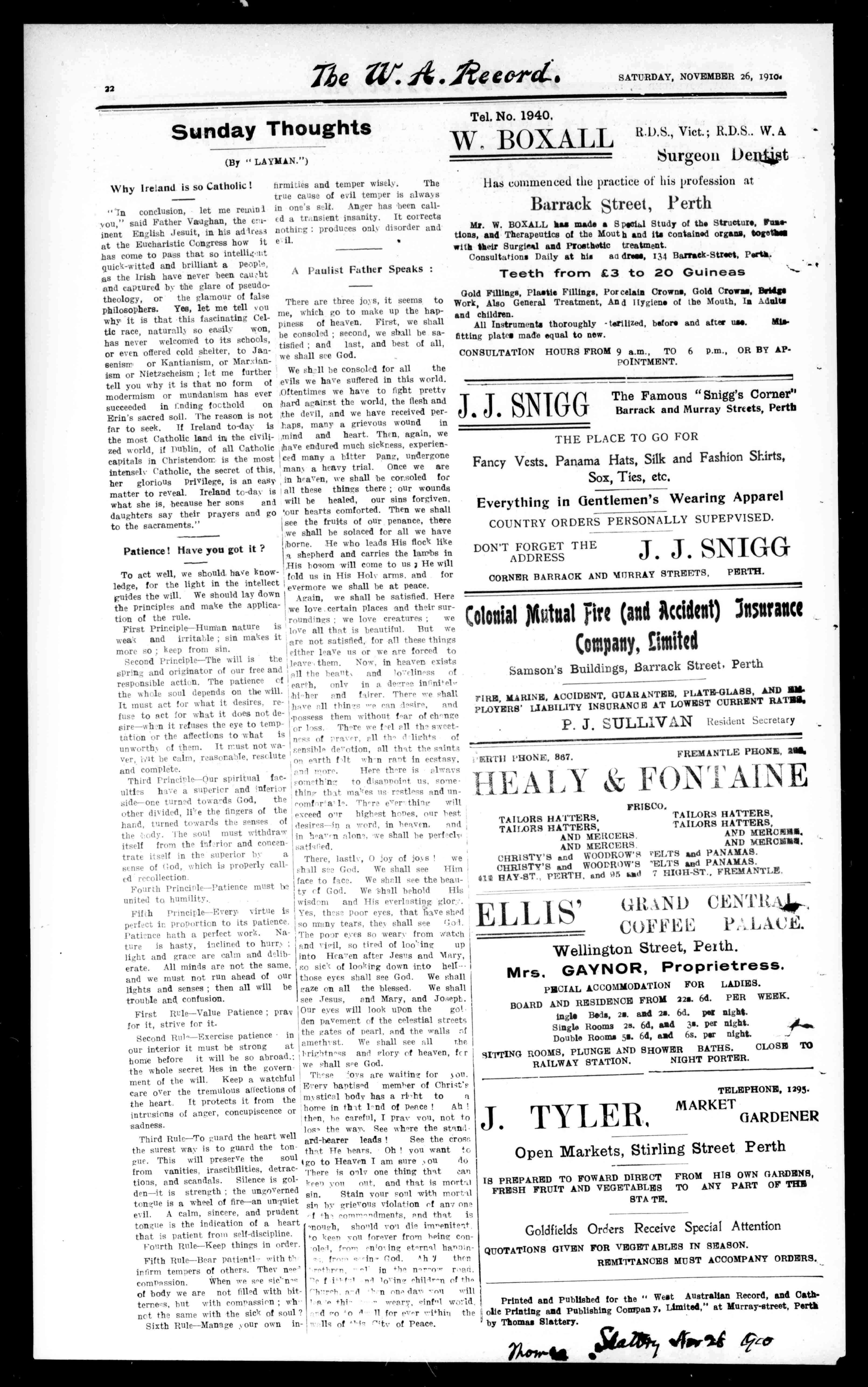 deliberatelycutoutofhislifeall domesticandworldlyinterests, so thathemightbefreetorenderthe maximumservicetohumanity.They dnotforgetthattheSoggarth Aroonwasthepoorman'sfearless championagainstoPPressioninthe Mr.HughMahonontheoccasiondarkdaysofPersecutionthrough ofopeningaBazaaratBrunswick,whichourforefatherspassed.That recently,paidamarkedtributetoheguidedthem,consoledanddefenthepriesthood. dcdthemsithselfishaffectionand dauntlesscouragethathadnever Here,saidMr.Mahon,asinever,beensurpassed.(LoudApplause). Partofthecontinent,onefindsen-Thetiethatgrewoutofthisselfduringmonumentsonthezealofthesacrificeandheroismwasasstrong Priesthoodandthevitality f hto-dayasever.Ineveryemergency faithintheheartsofthepeople.ofl'fe,inallitsinevitabletrials consideringtheyouthofthiscoon-'andmisfortunes,Catholicsfeelthat tryandtheslenderresourcesofthethepriestisstilltheirbestfriend, Catholicpopulation,thepriestmustandthatthe'.canlooktohimfor beregardedasthemiracle-workerof(-silencewhichisnevertaintedhs theage.Hehasstuddedthelandself-interest.InthishappyandconwithChurches,colleges,convents,fidentialrelationshipwouldbefound sdhools,hospitals,andrefuges-allsomeexplanationofthegreatthings inlessthanthreegenerations.(Ap-whichhadbeenaccomplishedforthe plause).Wereheaskedforthese-ChurchinAustralia.Itexplained cretoftheseachievements,hewouldthecheerfulreadinesswithwhichthe sayitlay-inthepriest'sdisregardlaityalwa%srespondedtothecads ofself,inhissingle-mindeddevotionmadeuponthem. tohisnoblemission.Thepeoplefelt thatthePriesthadvoluntarily'andHis-Grace,theArchbishopof'Wel-