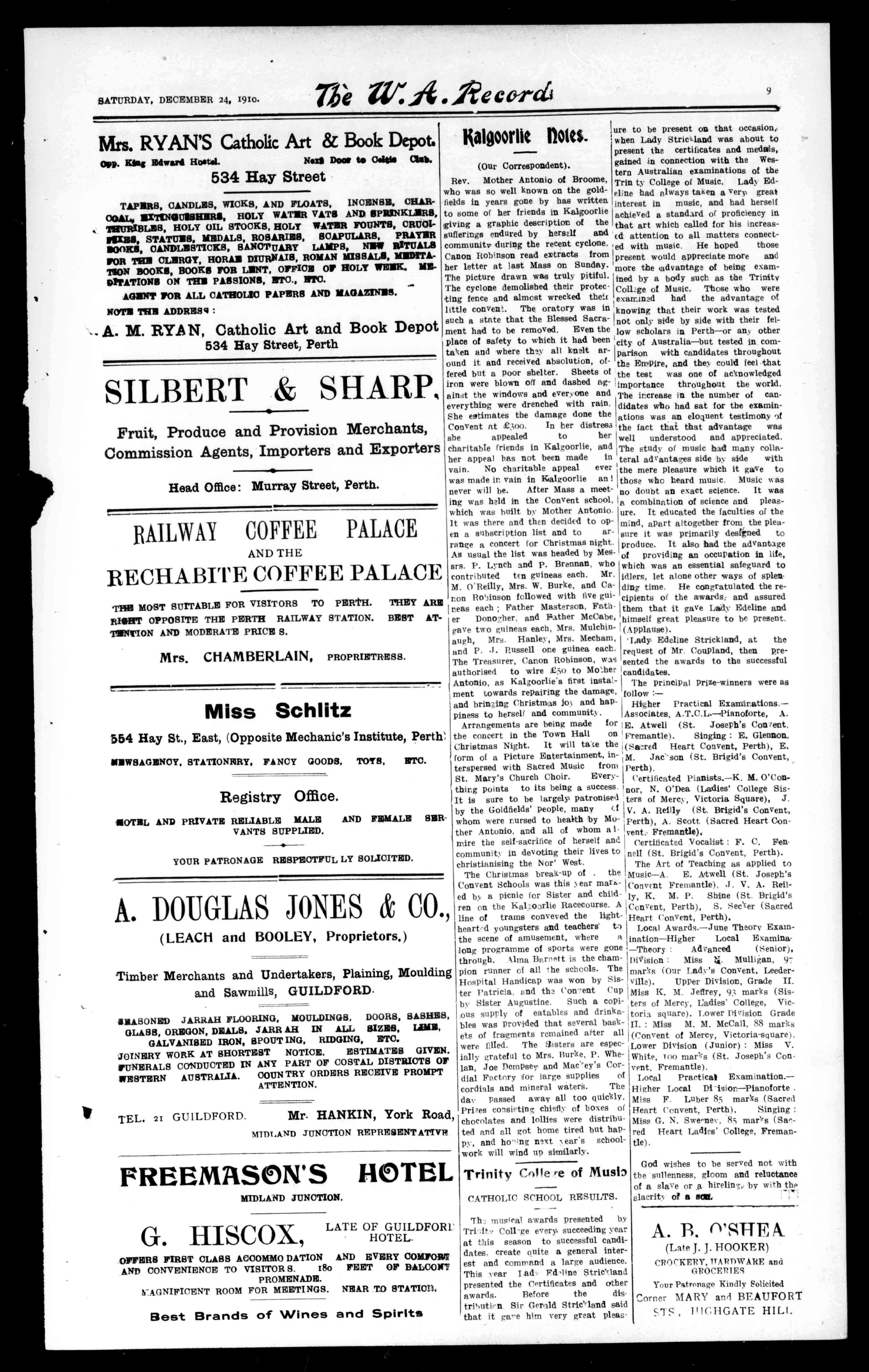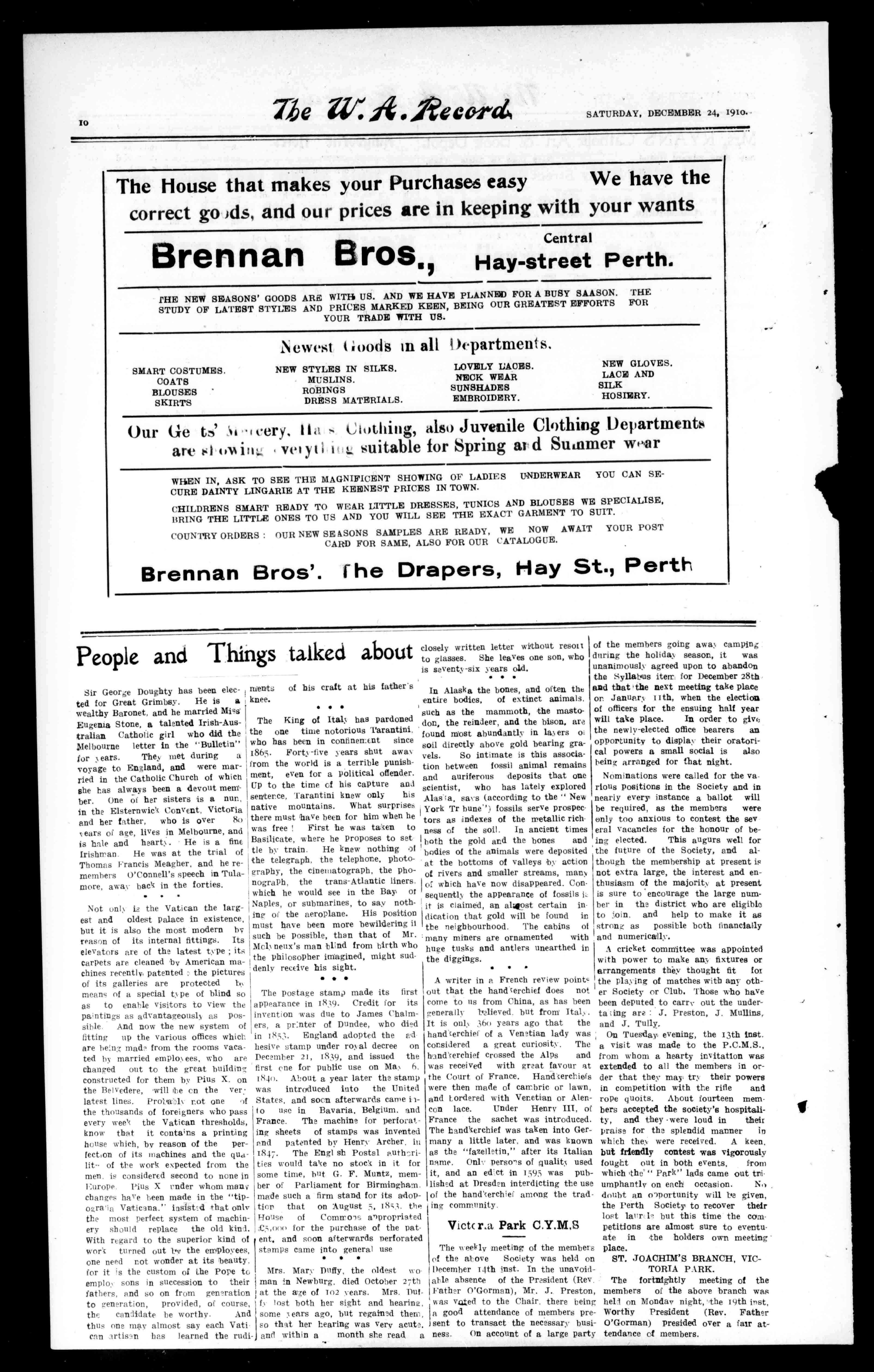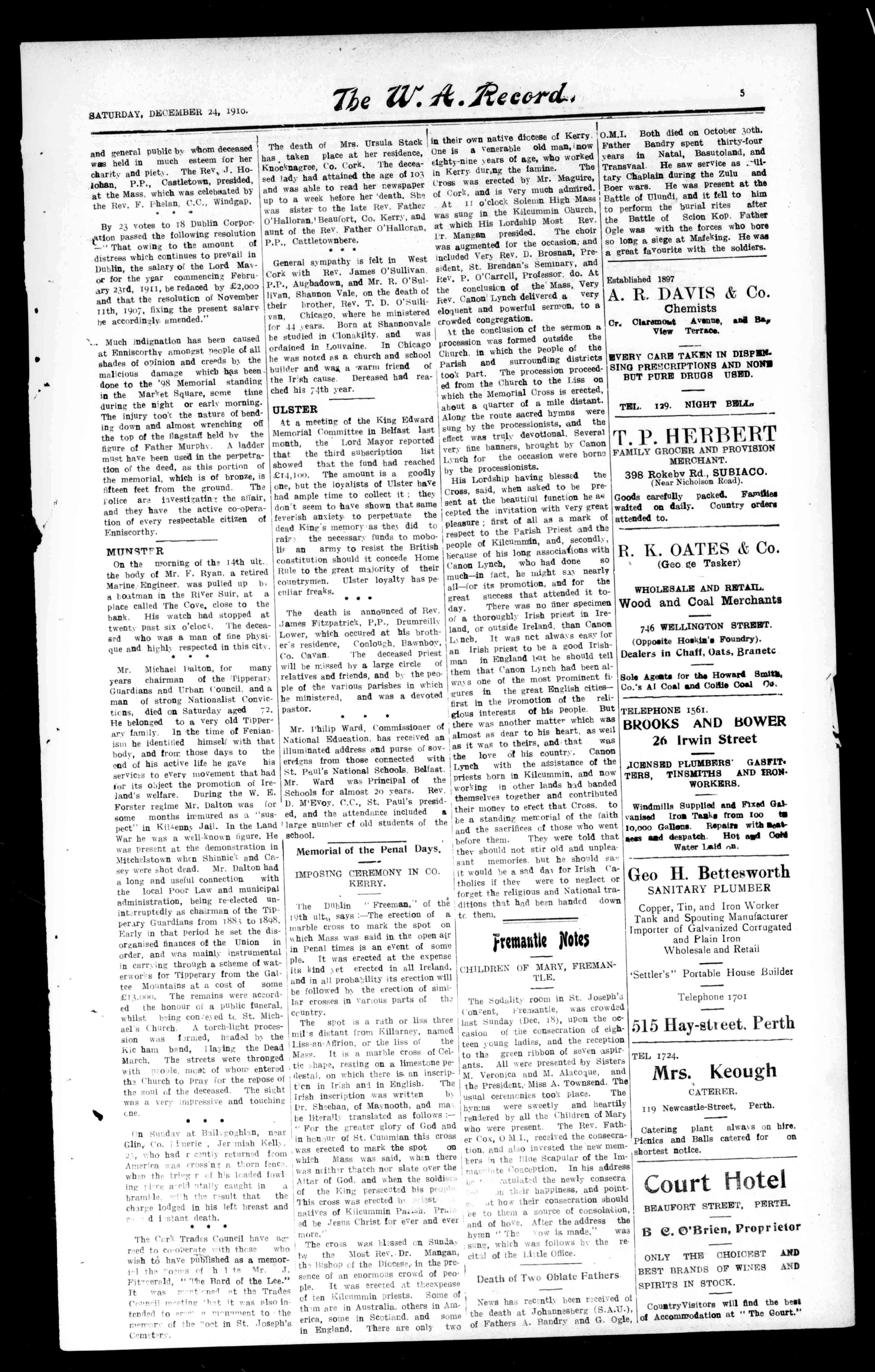 TheSodalityroominSt.Joseph';; ('onrent,Fremantle,wascrowded lastSunday(Dec.18),upontheoccasionoftileconsecrationofeighteenyoungladies,andthereception itothegreenribbonofsevenaspirants.AllwerepresentedlbySisters M.VeronicaandM.Alacoeue,and thePresident,.MissA.Townsend.The usualceremoniestookplace. The hymnsweresweetlyandheartily renderedbyalltheChildrenofMary whowerepresent.TheRev.FatherCox,UMI.,receivedtheconsecration.andalsoinvestedthenewmemeersaitheClueScapularofthe1mmac-::tteconcePtion.Inhisaddress eatulatedthenewlyconsecra iuth,ithappiness,andpointethowtheirconsecrationshould tietothetaasourceofconsolation, andofhove.Aftertheaddressthe hymn"The owismade,"was sung,whichwasfollowslatherecitedoftheLialeOffice.