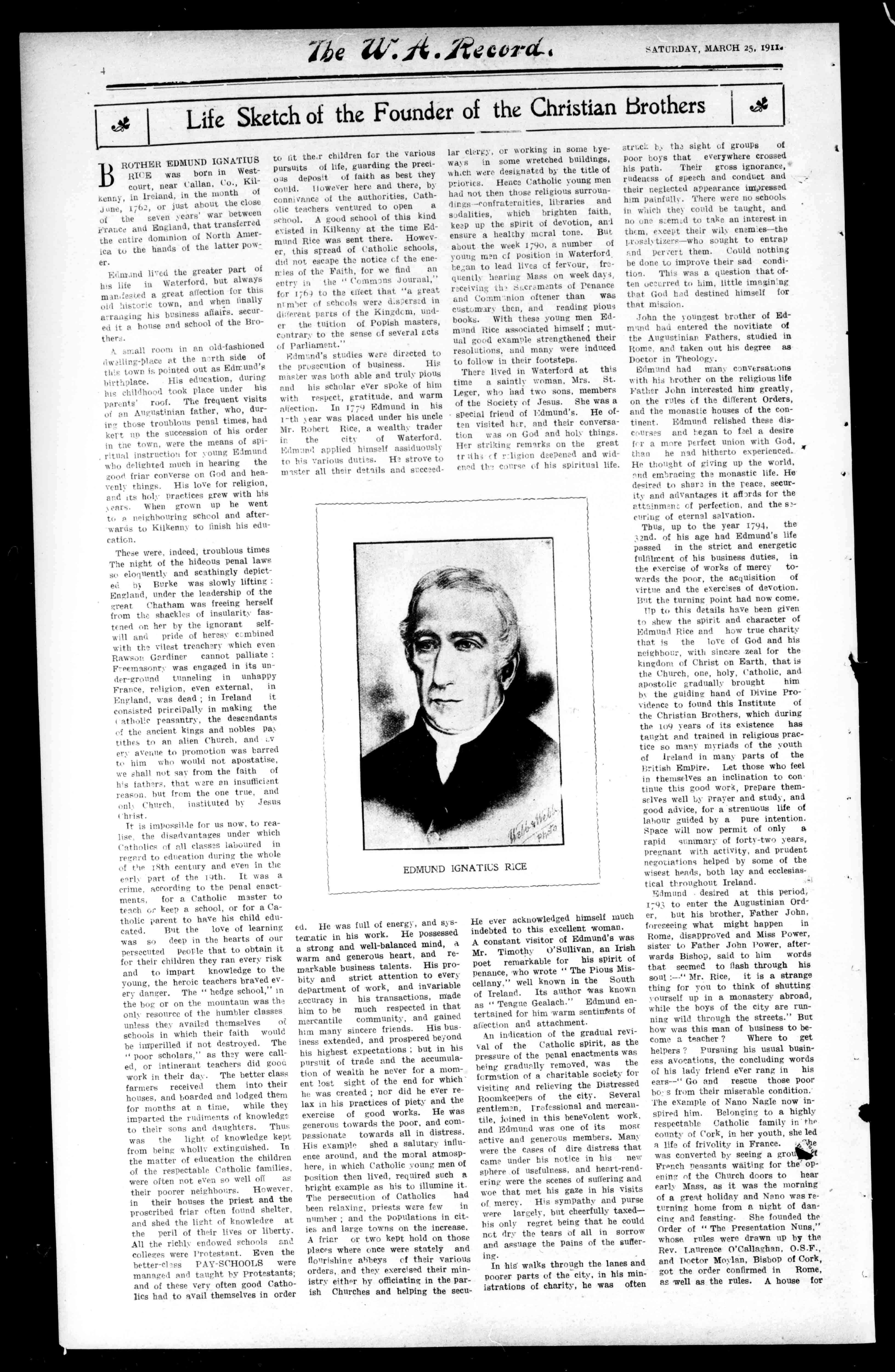 Thus,uptotheyear1794,the ?and.ofhisagehadEdmund'slife passedinthestrictandenergetic fulfilmentofhisbusinessduties,in theexerciseofworksofmercytowardsthepoor,theacquisitionof virtueandtheexercisesofdevotion. Buttheturningpointhadnowcome, Uptothisdetailshavebeengiven to:thewthespiritandcharacterof EdmundRiceandhowtruecharity thatistheloveofGodandhis neighbour,withsincerezealforthe kingdomofChristonEarth,thatis theChurch,one,holy,Catholic,and apostolicgraduallybrought him b'theguidinghandofDivineProvidencetofoundthisInstitute of theChristianBrothers,whichduring the109yearsofitsexistencehas taughtandtrainedinreligiouspracticesomanymyriadsoftheyouth ofIrelandinmanePartsofthe BritishEmpire.Letthosewhofeel inthemselvesaninclinationtocon tinuethisgoodwork,preparethemselveswellbyPrayerandstudy,and goodadvice,forastrenuouslifeof labourguidedbyaPureintention. Spacewillnowpermitofonlya rapidsummaryofforty-twoyears, Pregnantwithactivity,andprudent negotiationshelpedbysomeofthe wisestheads,bothlayandecclesiasticalthroughoutIreland.