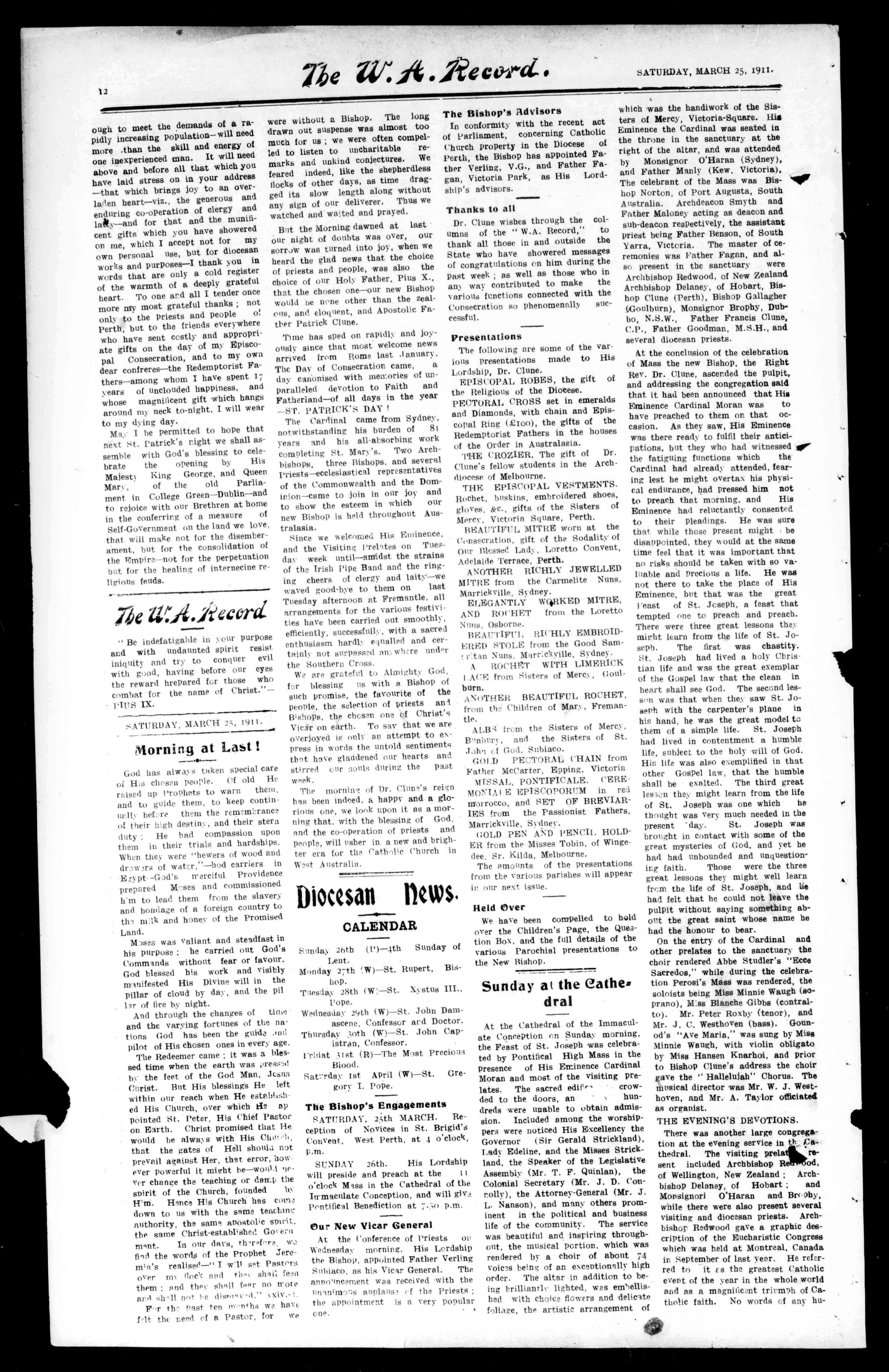 Dr.elune'sConsecration AHISTORICDAYFORWESTAUSTRALIA SpectacularDisplayofLiturgicalSplendour T.PATRICK'SDAY,1911,hascedyearsandphesicalinfirmities,dictines,Dominicans,Passionists, Scome and gone ; itpreventedthevisitofArchbishopRedemptorists,Oblates,Sacred lsrought us ournewO'Reilly,whoseworkinthepriest-Heart.Fathers. Bishop,authorised,consecrated,andhoodwasalmostpurelyWesternAus- Theroutefollowedbytheprocesdeputedtotakehisthroneinthetralian,cameDr.Norton,BishopofsionfromtheBishop'sPalacewas CathedraloftheImmaculateConcep-PortAugustaandfromVictoria,aroundtheCathedralgrounds-outtion,anditleavesbehinditremem-therearrivedseveralprominentcler-sidetheenclosure-totheMurrayprances,holy,solemn,andsublime.lea.Norwasyesterday'sceremon-streetgates,andthencethroughthe Weanxiouslylookedforwardtothe- ialpurelymetropolitaninitsrepre-groundsandintotheCathedral.As greatdaybecausewelookeduponitsentativecharacter.Fromthegold-itpassedalongtheschoolchildren, asfraughtwithimportantissuesforfieldsandfromthenorthcamecler-intheirdistinctiveSt.Patrick'sDay theCatholicChurchinWestAust-tealandpublicrepresentatives,andCostumes,rangedoneachside,who ralia;thankGod,wecannowlookthesolemnceremonialwaswithcon-numberedabout1,000.unitedin backuponitwithgratitudeandsat-solar,judicial,governmental,andsingingthehymn,"HailtheGloriisfaction,ashavingmorethanfulfil-civicrepresentatives,bothaState,ousSt.Patrick," ledourmostsanguineexpectations,andaCommonwealthfunction. ThebannersPreParedfortheocAllclassesofthecommunitywish- ItwasahappyideatofixthecasionandbornebytheChildrenof eduswell,joinedinourcelebrationsdateoftheConsecrationofBishopMaryandtheschoolchildrenhad andshowedbywordandactthatclimeonSt.Patrick'sDay.Itisappropriateinscriptions theyhadagenerousshareintheJoythedayaboveallotherholidays, "AdMultosAnnos." thatfilledourhearts.The"Press"whichIrishmen,whoarethebulwark "GodBlessOurCardinal." waswithusrightthroughthetwooftheCatholicChurchintheBrit-"St.PatrickandSt.Brigid. dailypaperssenttheirrepresenta-ish-speakingworld,delighttohon- PrayforUs." tivestoallourgatherings,showedour.Itappealsmostnaturallyand "GodSaveIreland-" -leuseveryconsiderationandgavefullforcefullybothtotheirpatrioticand BesidesthePrelatesmentioned,the reportsofourceremonies.TheoP-theirreligiousinstinctsandimPul-visitingPriestswhotookpartin eninglinesofthereportinSatur-ses.Itis,moreover,thedayoftheprocessionwere:-VeryRev.Fr. day's"West.Australian,"arewor-thePatronsaintofCardinalMoran,Hannon,C.SS.R.; PriorBannon, thyofquotation:- andofthenewBishopofPerth.The4).p.,AdelaideRev.J.Walsh,and "risnearlyaquarterofacen-episcopalprocession,withitscrowdsRev.GeraldDoyle,Ballarat;Fathtut'sinceWesternAustraliafirstofenthusiasticspectators,thecon-erManly,Kew,MelbourneFather welcomedCardinalMoranasasecretionceremonyintheCathedral,Denson,SouthYarra,Melbourne PrinceoftheCatholicChurchanditswithitsclose-packedaudienceofre-FatherMcCarter.spring,Melbourie; headinAustralasia,andtheoccas-verentanddevoutbeholdersthetheRev.J.Cusack,Gordons,Vicionwasthen,asitwasyesterday,banquetwhichfollowedinhonouroftoiletheRev.J.Cusack.St.KiltheconsecrationofaBishopoftheCardinalandthetrulynationalda,EastMelbourneandFather Perth.HisEminenceisamanofdisplayofFridaynight'sconcert,de-Goodman,M.S.H. commandingintellect,aswellasec-monstratednotonlythereligious TheIlenedictines,includedFather clesiasticalinfluence;andthoughhisandpatrioticfervourofCatholics,castanares,thePriorandcompany devotiontothelandofhisnativityandIrishmen,butappreciationandofPriestsfromNewNorcia. hasbeen,andis.unquestionable,recognitionoftheirsignificanceand TheDiocesanRegularswereVery deepandabiding,hehasunmistak-ValuesbythegeneralcommunityofRev.C.('ox,4).M.I.,andFr.S.J. ablydemonstratedhisprofoundatdiversnationalitiesandreligiousbe-Flynn,J.Wheeler,.T.Smith,J.MctachmenttoAustralia,asthelandliefs." callion,J.Neville,ofthesameinofhisadoption. PerthisasfarThePrecessiontotheConsecration stitute.