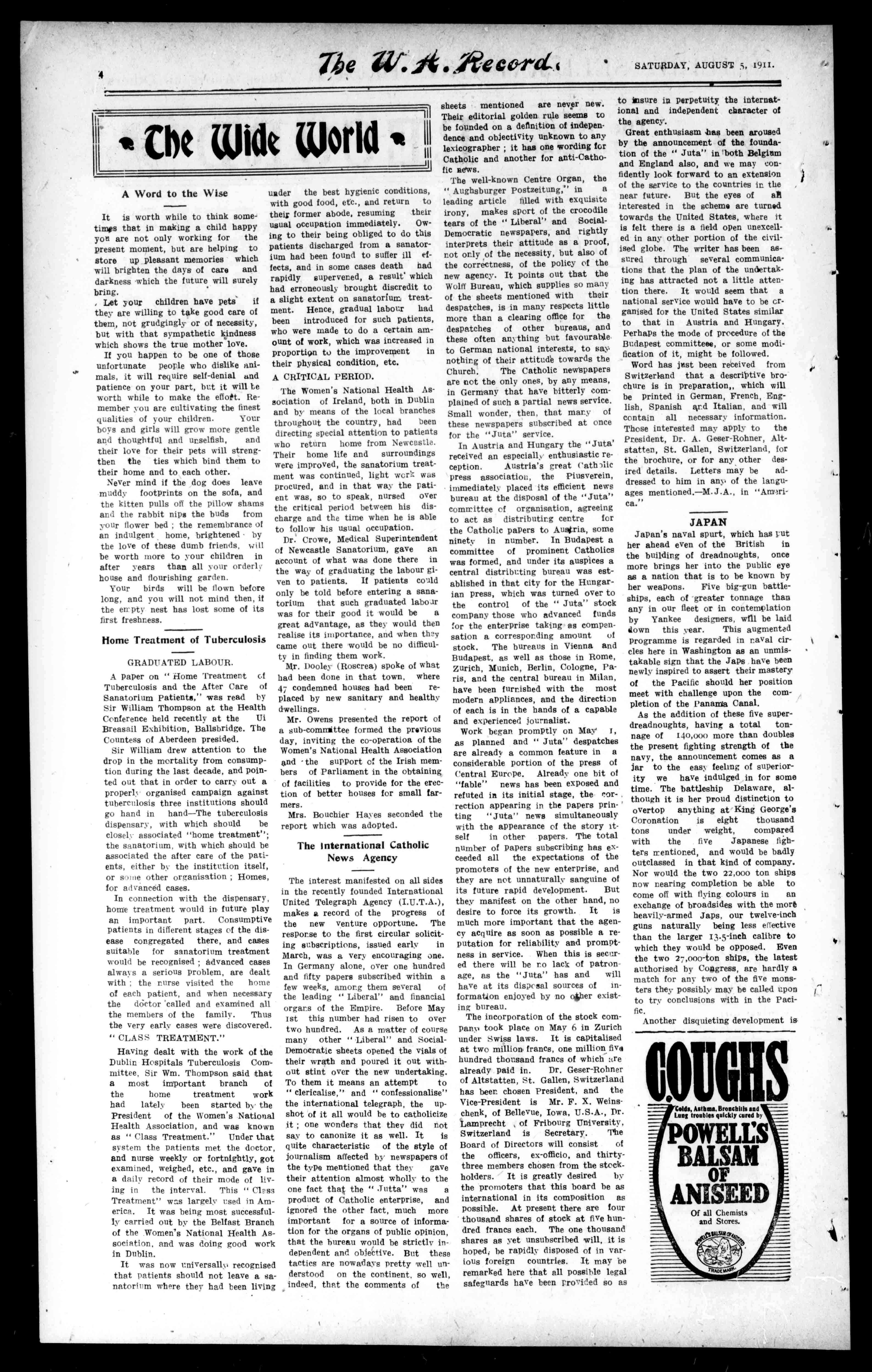 Thewell-knownCentreOrgan,the "AughsburgerPostzeitung,"in a leadingarticletilledwithexquisite irony,makessportofthecrocodile tearsofthe"Liberal"andSocialDemocraticnewspapers,andrightly interpretstheirattitudeasaproof, notonlyofthenecessity,butalsoof thecorrectness,ofthepolicyofthe newagency.Itpointsoutthatthe WulffBureau,whichsuppliessomany ofthesheetsmentionedwiththeir despatches,isinmanyrespectslittle morethanaclearingofficeforthe despatchesofotherbureaus,and theseoftenanythingbutfavourable toGermannationalinterests,tosay nothingoftheirattitudetowardsthe Church. TheCatholicnewspapers arenottheonlyones,byanymeans, inGermanythathavebitterlycomplainedofsuchapartialnewsservice. Smallwonder,then,thatmanyof thesenewspaperssubscribedatonce forthe"Juta"service.
