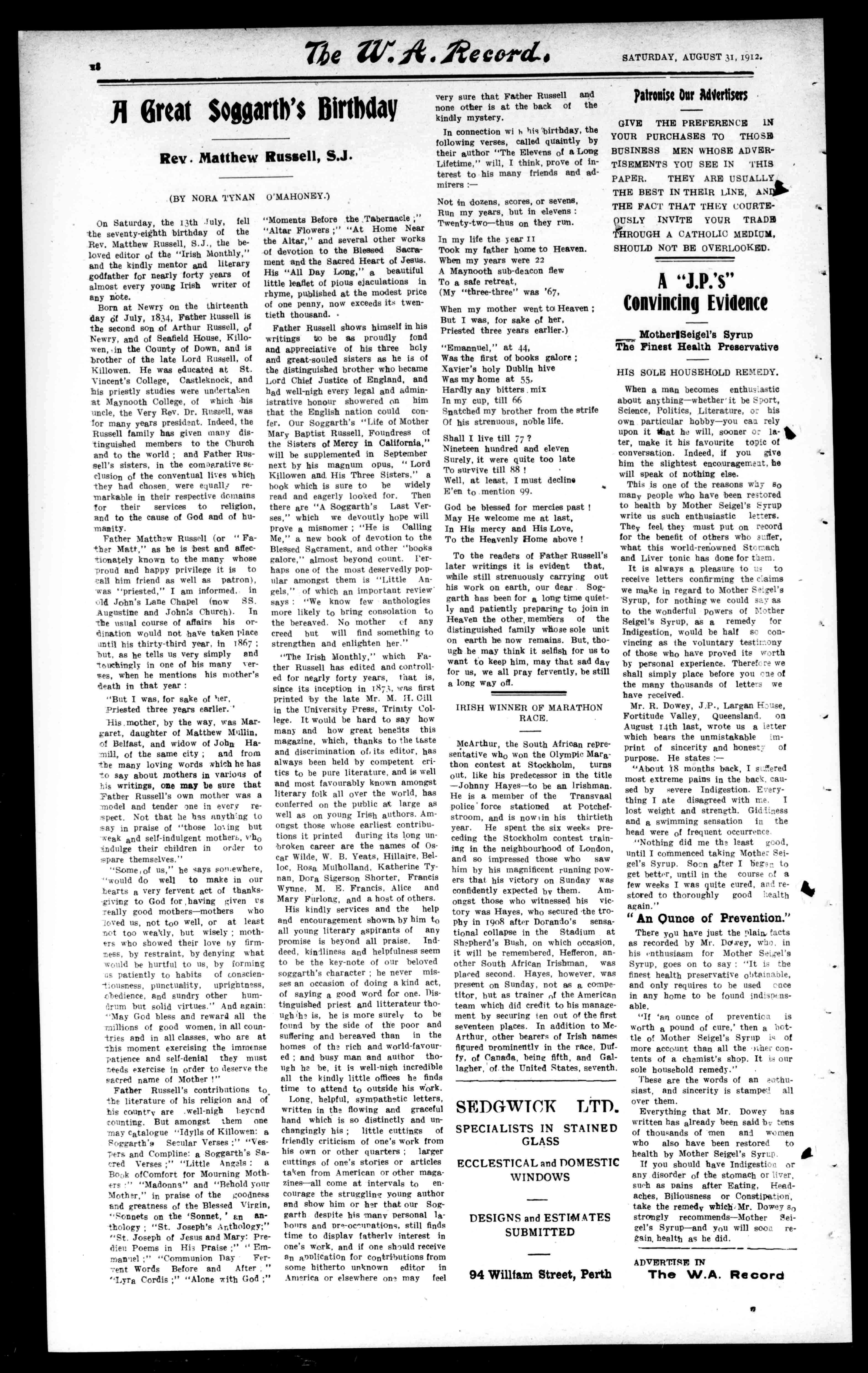 Proprietress ALargeconsignmentofNewGoodsjustevened:-Statuary,Rosaries,BrassCandlesticks,StationsoftheCross,Crucifixes,Hymn Books,Floats,Incense,CharcoalTapers,andallChurchandCatholic SchoolRequisites.AllIrish,English,andAmericanNewspapers,and Magazinesinstock.AgentsforallInterstatePapersandMagazines. GoodMagazinesforthehomecircle-AveMariaandCatholicFireside. COUNTRYORDERSRECEIVEPROMPTATTENTION.