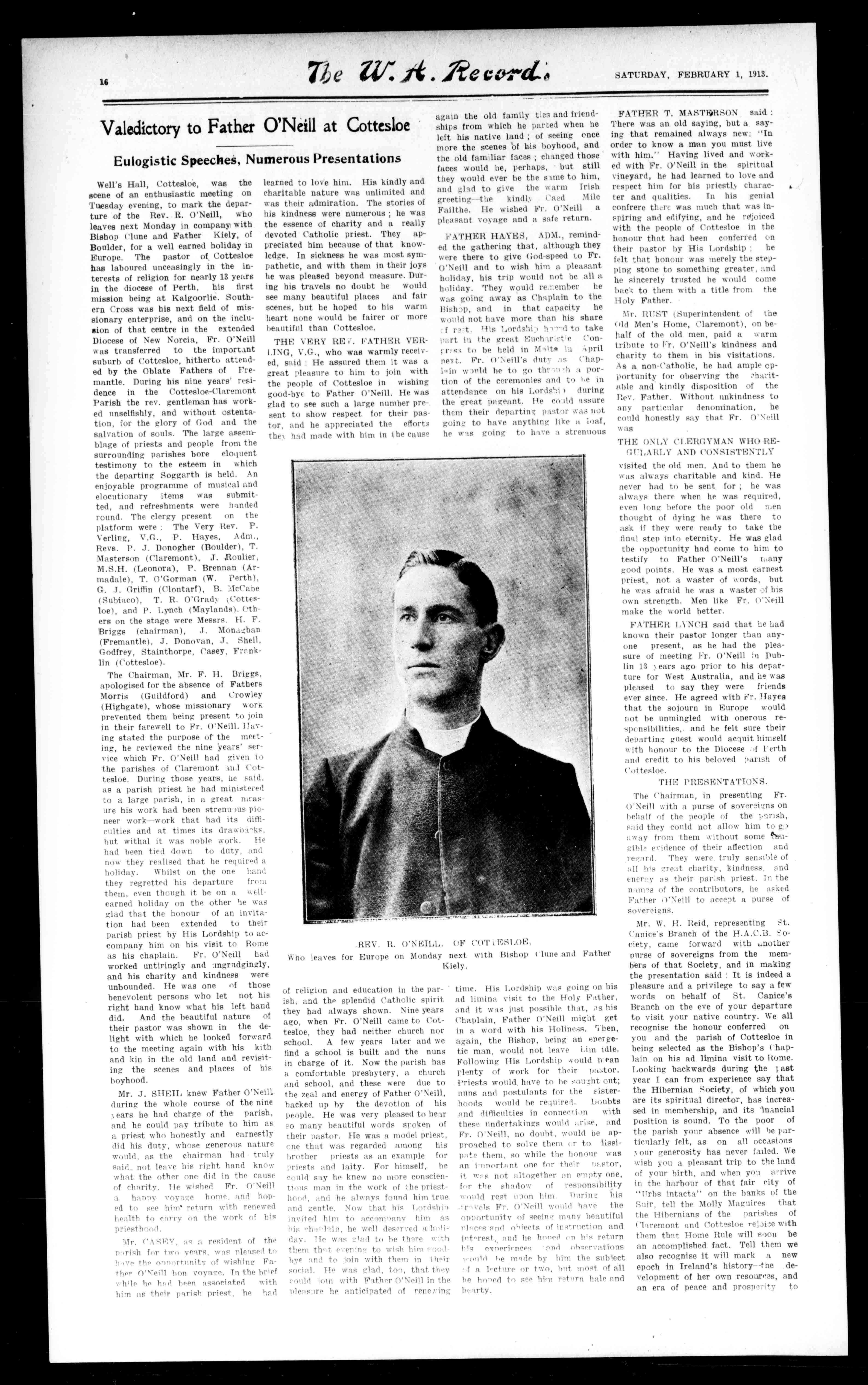 Inreply,HisLordshipdweltupon someofhisassociationswithJarrandaleasaMissionaryPriestinthe past.Hewaspleasedtohearthat therewerehopesofabrightand Prosperousneweraintheoldplace, whichwasoncethecentreofaparishintheDioceseofPerth.Hewas happyandpleasedtobeabletotell themthathewasrestoringJarrahdaletoitsformerecclesiasticalpositionandgivingthemaresident Priest.Heunderstoodthattheir Priesthadastrongdesireandan unshakendeterminationtojoina ReligiousOrderhuthehopedthat hewouldcontinuethemuch-needed Apostolicworkinwhichhewasat presentengaged,andhe+rustedthat thepeopleofJarrand-lrrn4thesurroundingdistrictswoillec,-o-erate withhintand-roiled' `ore-
