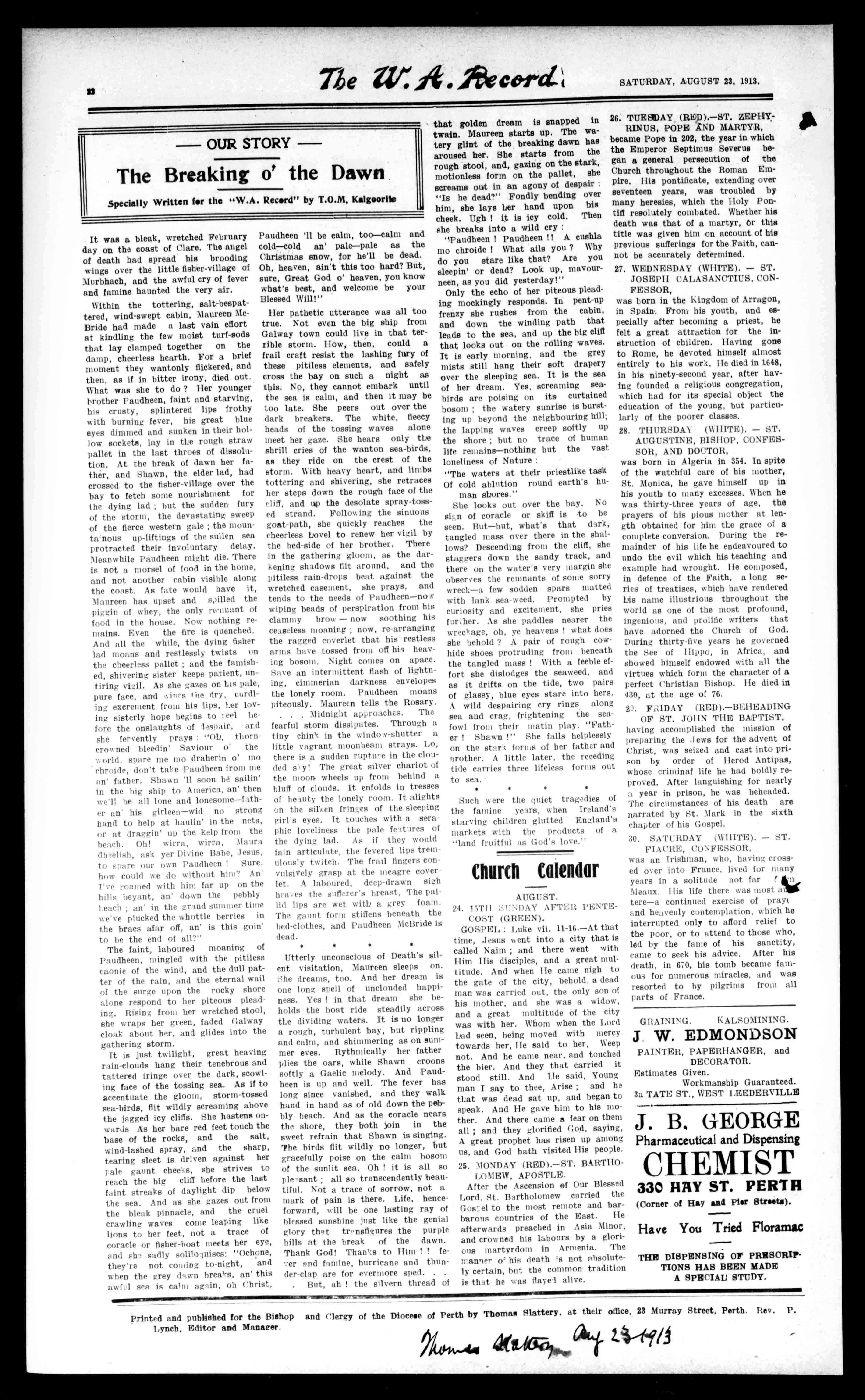 PrintedandpublishedfortheBishopandClergyoftheDioceseofPerthbyThemesSlattery,attheiroffice,23MurrayStreet,Perth.Bev.P. Lynch,EditorandManager. igoidms.14i34-0