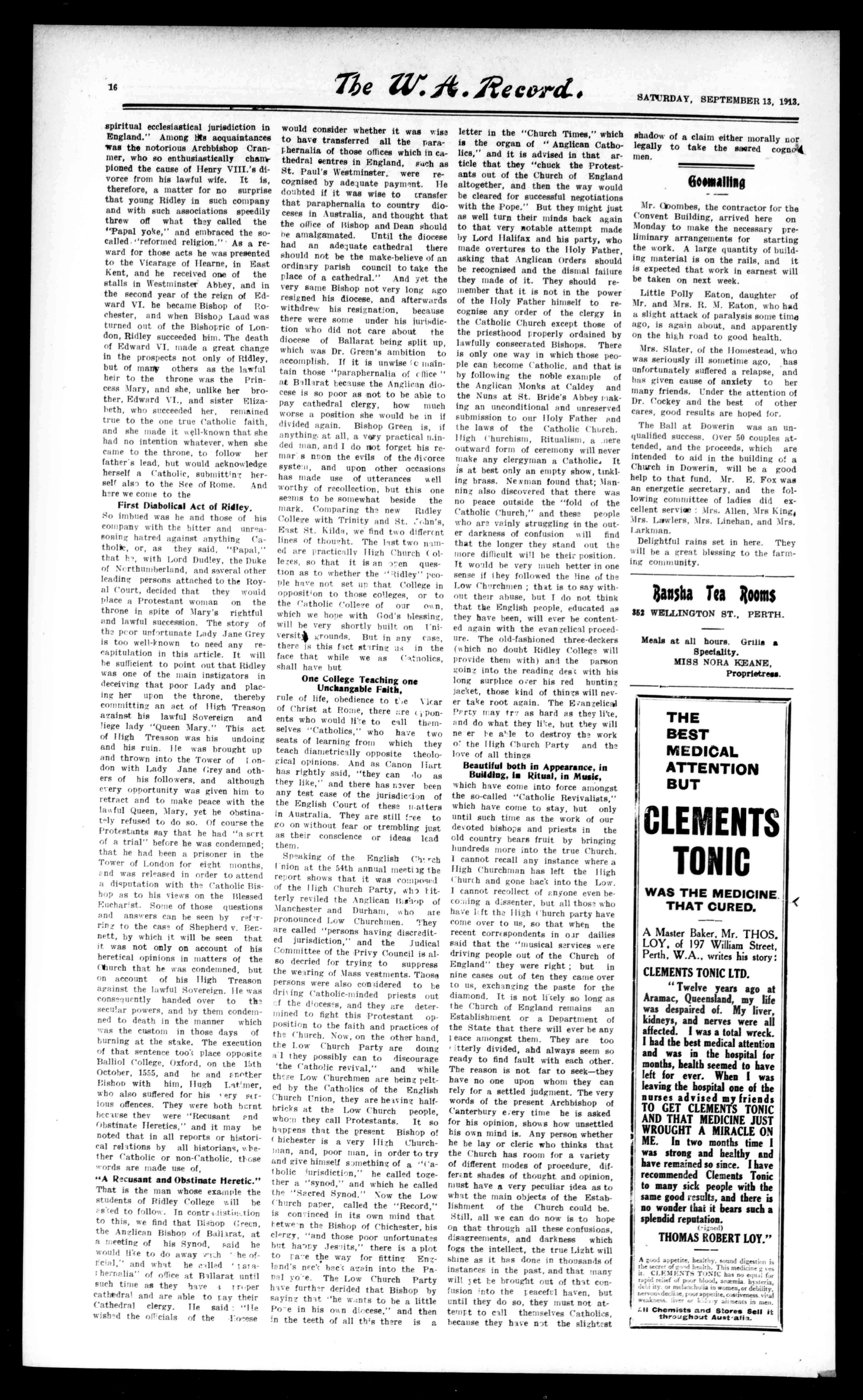 Thatthereisonlyonegenuine fore,ofChristianity,andthatthat isnoneotherthanthemuch-abused CatholicChurch,isathesisevident toanymanwhoapproachesitwith anunbiassedmind.ThattheCatholicChurchistheleavenoftheAustraliannation,factsgoalongway to!wove.Thatthemultitudinous, antieverincreasing,Christiansects donotcarryconsistencybeyondthe regionofexpediency,isaproposition thatwillnoteasilyhearthetentof examination.Theyaregoingwitha vengeance-rushingdownthebroad streamofprivatejudgmentthat peersitselfintothewideseaofreligiousindifference.