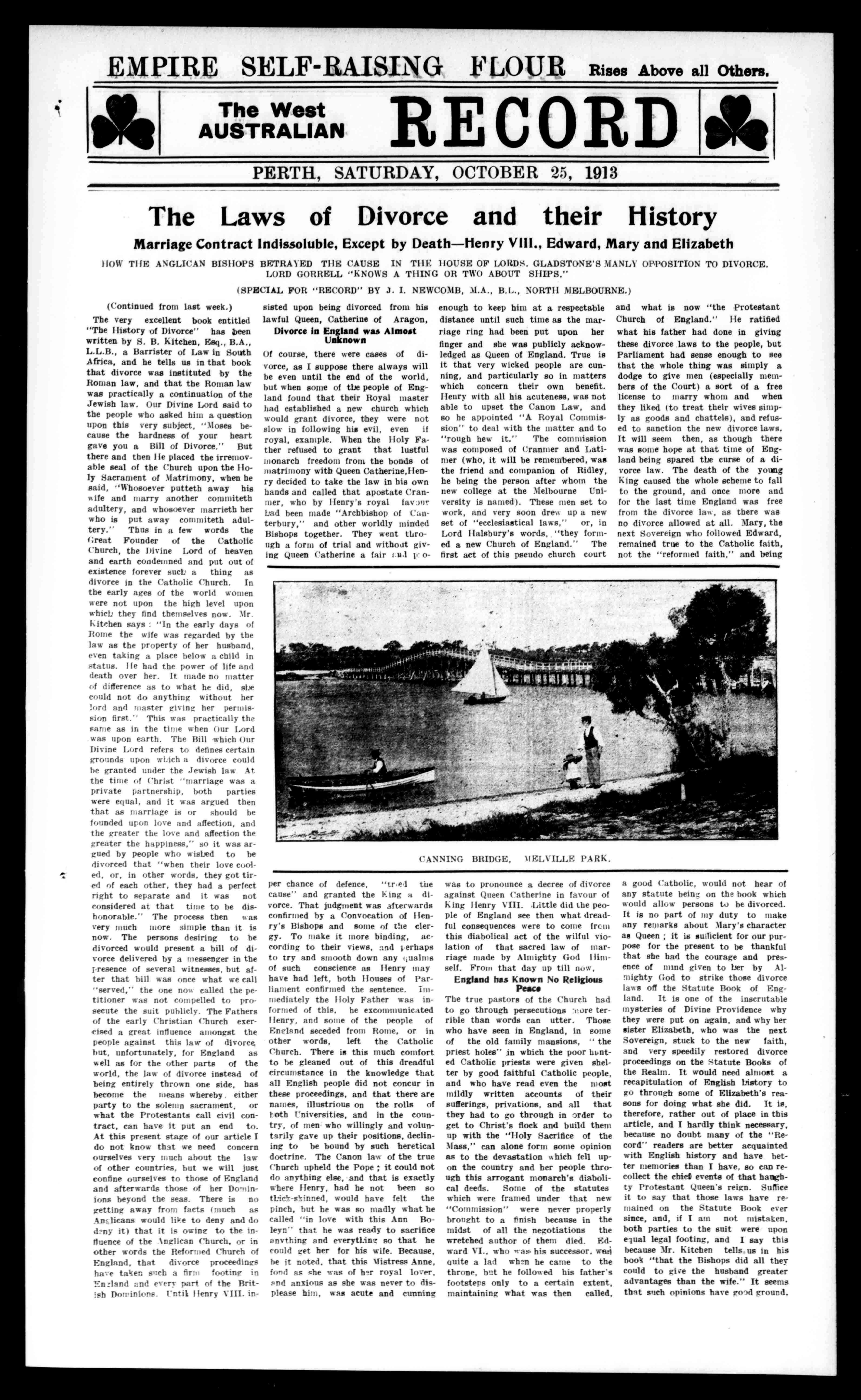 becausein1857theDivorceBill whichwasintroducedintotheImperialParliamentwastheoutcomeof verywidediscontentwiththetreatmentofsuitorsintheEcclesiastical Courts.Bythatitisunderstood thatuntilthattimetheseoivorces wereonlygrantedbytheProtestant ChurchCourtsthroughParliament. NetbyLaw,butbyMutualConsent In1853aRoyalCommissionwasappointedtoinquireintothewhole question,andtheydecided,after hearingevidence,thatthe"marriage betweentwopersonscouldnotbe dissolvedbytheCourts,"orInother words,thatthesecularpowershad norightwhatevertointerferewith anythingecclesiastical,butbya strangecontradictiontheysaidthat they"couldhedissolvedbymutual consentoftheparties."Inallcases whereeitheroneofthepartyhad beenguiltyofmisconduct,theyhad toapproachParliamentandget"a privateActofParliament"foreach particularcasebeforetheycouldobtainthedesiredrelief.Atthattime anewofficerwasappointedtointervene,andwascalled"TheI;ing's Proctor."WestillhavesuchanofficerinourDivorceCourts,toarevent asfaraspossibleanycollusionbetweenthepartiesseekingadivorce foranyreasonexceptalegalone. WhentheBillwasbeforetheHouse ofLogsin1867theBishopofOxford,Dr.Wilberforce,wasroostanionstoputtheburdenmoreheavily uponthewifethanithadthenexist ed.Iamrathersurprisedatthis, havingknownHisLordshipinmy veryearlymanhood,andalways foundhimsuchakind-heartedfellowandabloodrelationofthegreat Wilberforcewholiberatedther.egro slaves,thatImustconfesstogreat sur,:risewhenIreadthesewordsin Mr.kitchen'shook,butIcertainly amnotpreparedtosaythatMr. Kitchenisnotcorrect.Stillitonly showshowmistakenyoungpeople canbeintheirestimateof theirelderswhomtheylookupto gridin- 7-)tos tt thewholeofthitdebate notoneChurchofEnglandBishop intheHouseofLordstriedtoprove, orevenii.adeasimpleassertion, thatmarriagewasindissoluble.CertainlytheBishopofExeterdidtry togetanopinionfromtheIlouseby sayingthat''theEmperorconstantinerefusedtogiveadecreeofdivorcetoanywifeunlessadultery wasprovedagainstoneoftheparties,andaddedwhathisLordship evidentlythoughtwasacon:incing argumentagainstdivorce,'Beesese itwasaCatholicinstitutionarolnot al'rotestantone."TheNish.'!,of St.Davidsaidthathewouldinject totheBillbecauseChristIli:nself hadnotmadeanylawsatall."But ifthatleshohidrememberedthat Christdidgivetwogreat"tei.laand[Lents,hewouldhardlyhave1..ade suchanonsemdcalremark.Thefirst coe.:eandeenv.asweallknow.isto loveGod,andthesecond7,)love oerneigh'oT.Probably,:1thesaid Bishophadanyconscienceatallour DivineLord'swordswouldhaveappealedtohiii.Itwillthuseseen thattheAnzlicanchurcLfellowed strictlytheruleofherselfishfounder.Henry allowingperfectfreedoeiinthedissolvingofthe .erriaget'e.e,,notherdeflees thithi-eeweeo-ertheAnglican ('herhofrecentyear=,isitsattitad,.towardsthisgreatquestionof divorce.votoneofherBish.rpsor Clerzyhasyetdaredtopublicly statethatheloo'sII'on,7r",);ii' oneoftheSacramentsinstitutedby Christ.Todosowouldnecessarily abonehdivorce.Somehavezoneso farastosayupontheirowninitiativethattheywillnotallowany cleryreanintheirdiocesetoremarryaglilty-partytoadivorce. TheyhavenotthelawoftheChurchtosupportthereinthose views,hutoneBishopwithwhomI waspersonallyacanainted.Dr.liarmer.thepresentAnglicanBishopof Rochester,saidatameetingofhis clergythathe"fullyintendedtoinhibitanyclergymanunderhis.lurisdictionwhocelebratedamarriage betweenpersonswhohadbeendivorced."and'nordertoemphasisethat decision.theBishopopenedhisGlad-