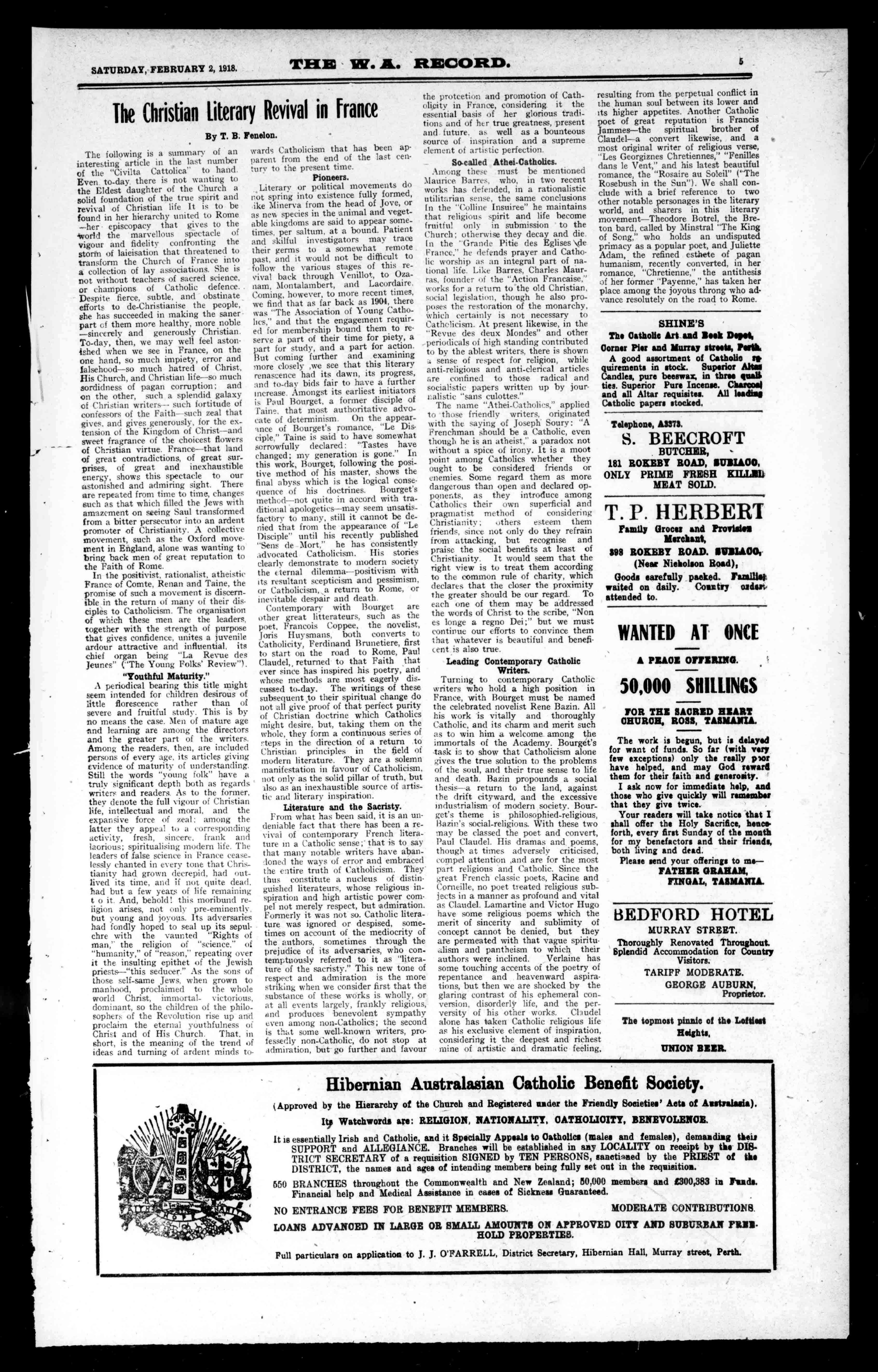 50,000WRINGS FORTHESACREDHEART CHURCH.ROSS,TASMANIA. Theworkisbegun,butisdelayed forwantoffunds.Sofar(withvery fewexceptions)onlythereallypun havehelped,andmayGodreward themfortheirfaithandgenerosity. Iasknowforimmediatehelp,and thosewhogivequicklywillremember thattheygivetwice. YourreaderswilltakenoticethatI shalloffertheHolySacrifice,henceforth,everyfirstSundayofthemonth formybenefactorsandtheirfriends, bothlivinganddead. PleasesendyourofferingstomeFATHERGRAHAM, FINGAL,TASMANLL. BEDFORDHOTEL MURRAYSTREET. ThoroughlyRenovatedThroughout.