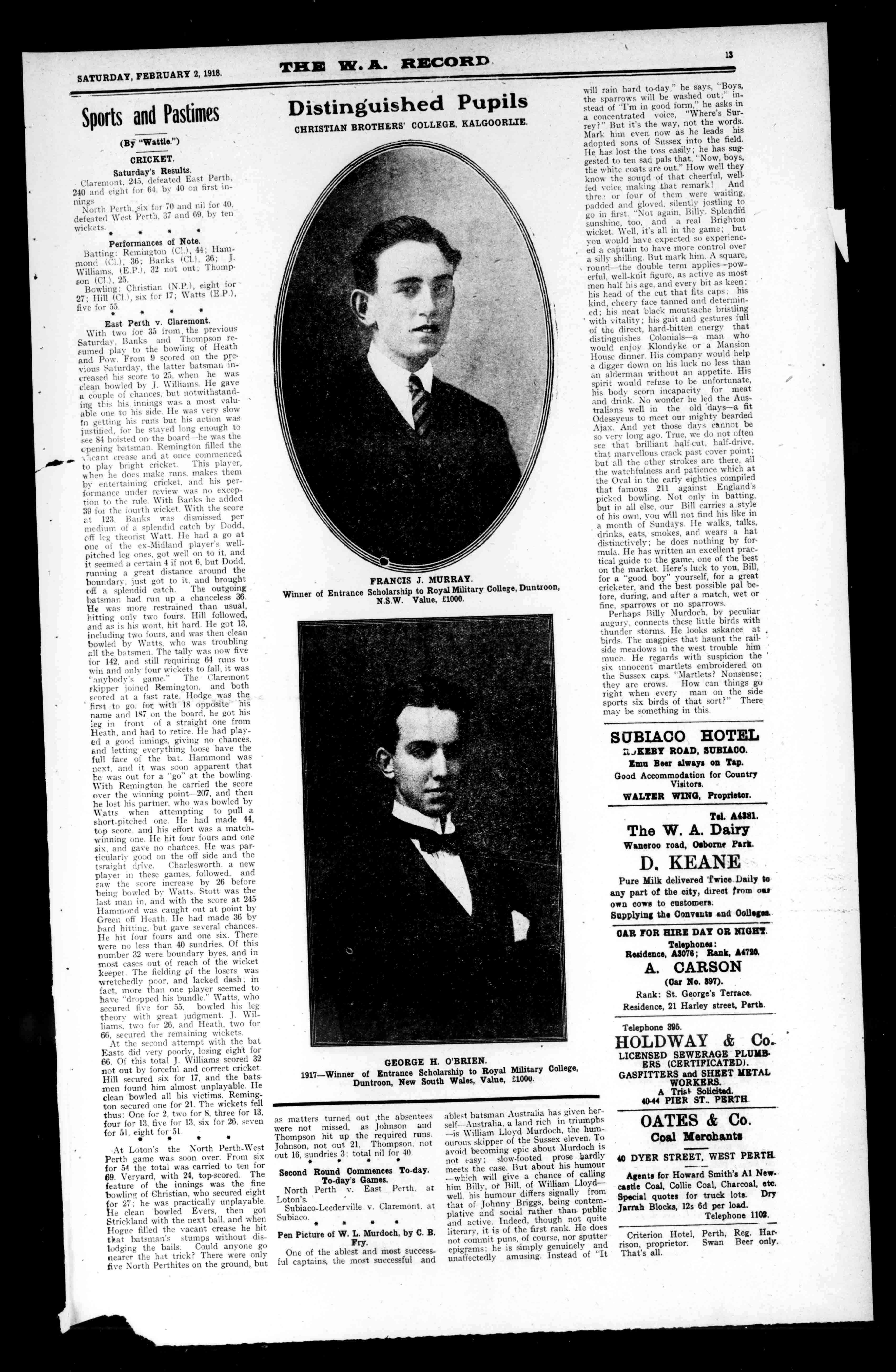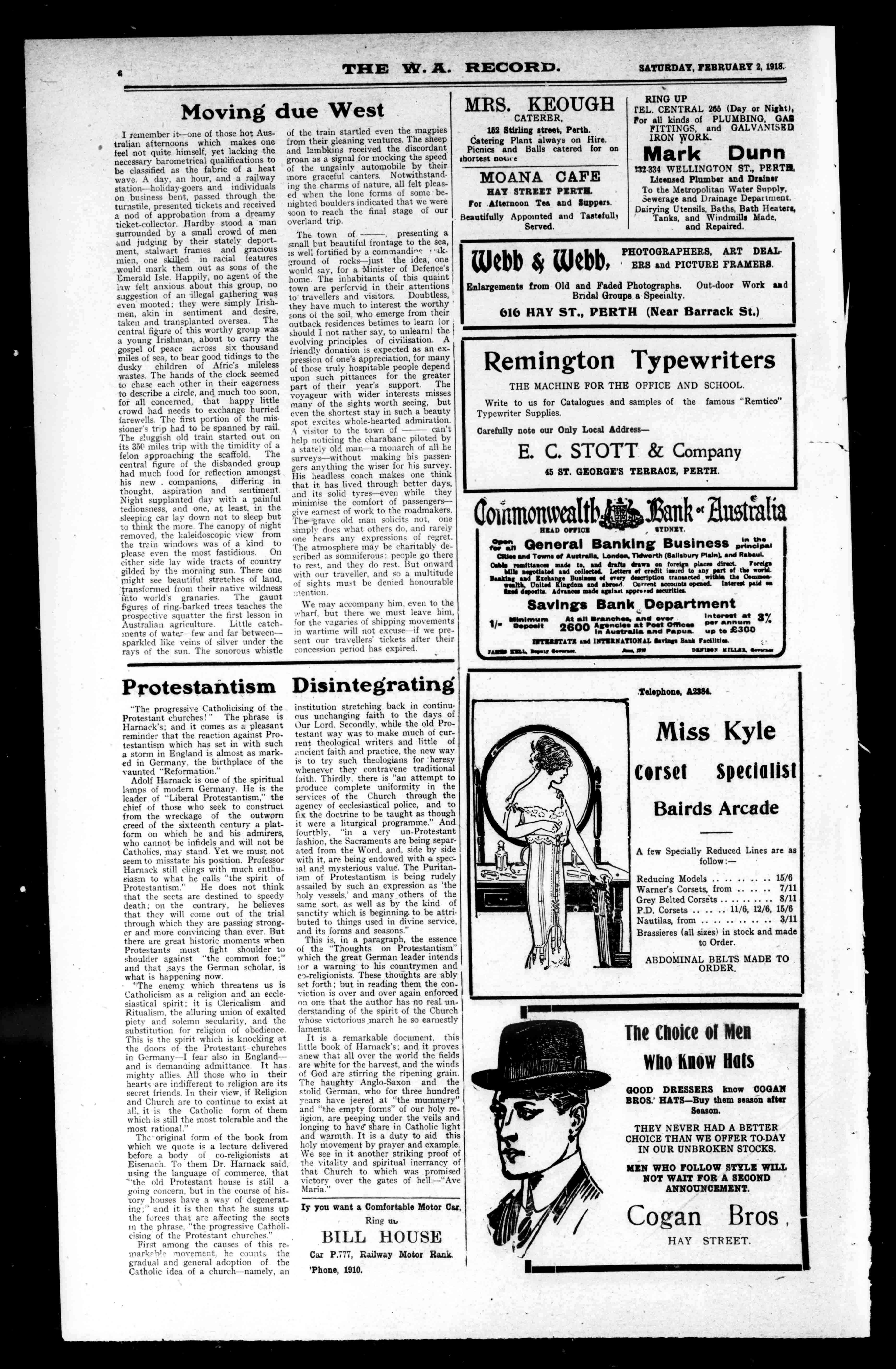 1910, MRS.KEOUGH CATERER, 162Stirlingstreet,Perth. CateringPlantalwaysonHire. PicnicsandBallscateredforon shortestluxee MOANACAFE HAYSTREET ForAfternoonTeaandSuppers. BeautifullyAppointedand'Tastefully Served. RINGUP TEL.CENTRAL265(DayorNight), ForallkindsofPLUMBING,GAS FITTINGS,andGALVANISED IRONWORK. MarkDunn `32334WELLINGTONST.,PERTH, LicensedPlumberandDrainer TotheMetropolitanWaterSupply. SewerageandDrainageDepaiuncut. DsiiryingUtensils,Baths,BathHeaters, Tanks,andWindmillsMade, andRepaired. Webb4Webb, 1 PHOTOGRAPHERS, ART DEALERSandPICTUREFRAMERS. EnlargementsfromOldandFadedPhotographs.Out-doorWorkaid BridalGroupsaSpecialty. 616HAYST.,PERTH(NearBarrackSt.) RemingtonTypewriters THEMACHINEFORTHEOFFICEANDSCHOOL. WritetousforCataloguesandsamplesofthefamous"Remtico" TypewriterSupplies. CarefullynoteourOnlyLocalAddressE.C.STOTT&Company 45ST.GEORGE'STERRACE,PERTH. Colitmontvadtb HEADorrice SYDNEY IzirrnGeneralBankingBusiness,,:4'27,... CitiesandTowneofAustralia,London,Tldworth(SalisburyPlain),andRabaul. Oalabremittancesmadeto,saddrift.drawsonforeignplacesdirect. foreign binsaegotiatedsadbollectad.Lettersofcreditissuedtoanyparteftheworld. IlanklagLadExchangeBushingsofeverydescriptiontransactedwithinth.COMONOwirith,UnitedKingdomanddreadCurrantaccountsopened.latereatpaidoh Inddspoilta.Advancesmadeagalutappresdmantle' SavingsBankDepartment liellsslenur Atalllaranerhoo,andover 2600AganclooatPostOfflosis InAustraliaandPapua_ Intervalatsly perannum""'/e upto£300 IIITIU1TAT1sadisrrsatartomatSavingsHankfa:11We. sari,MILL.Dupl.Illovenr Jam%Ave DIII,1011114Y!UALOwner Telephone,412384. MissKyle CorsetSpecialist BairdsArcade AfewSpeciallyReducedLinesareas follow:ReducingModels 15/6 Warner'sCorsets,from 7/11 GreyBeltedCorsets 8/11 P.D.Corsets 11/6,12/6,15/6 Nautilas,from 3/11 Brassieres(allsizes)instockandmade toOrder. ABDOMINALBELTSMADETO ORDER. TheChoiceofMen WhoKnowHats GOODDRESSERSknowCOGAN BROS.'HATS-Buythemseasonafter Season. THEYNEVERHADABETTER CHOICETHANWEOFFERTO-DAY INOURUNBROKENSTOCKS. MENWHOFOLLOWSTYLEWILL NOTWAITFORASECOND ANNOUNCEMENT. CoganBros HAYSTREET.
