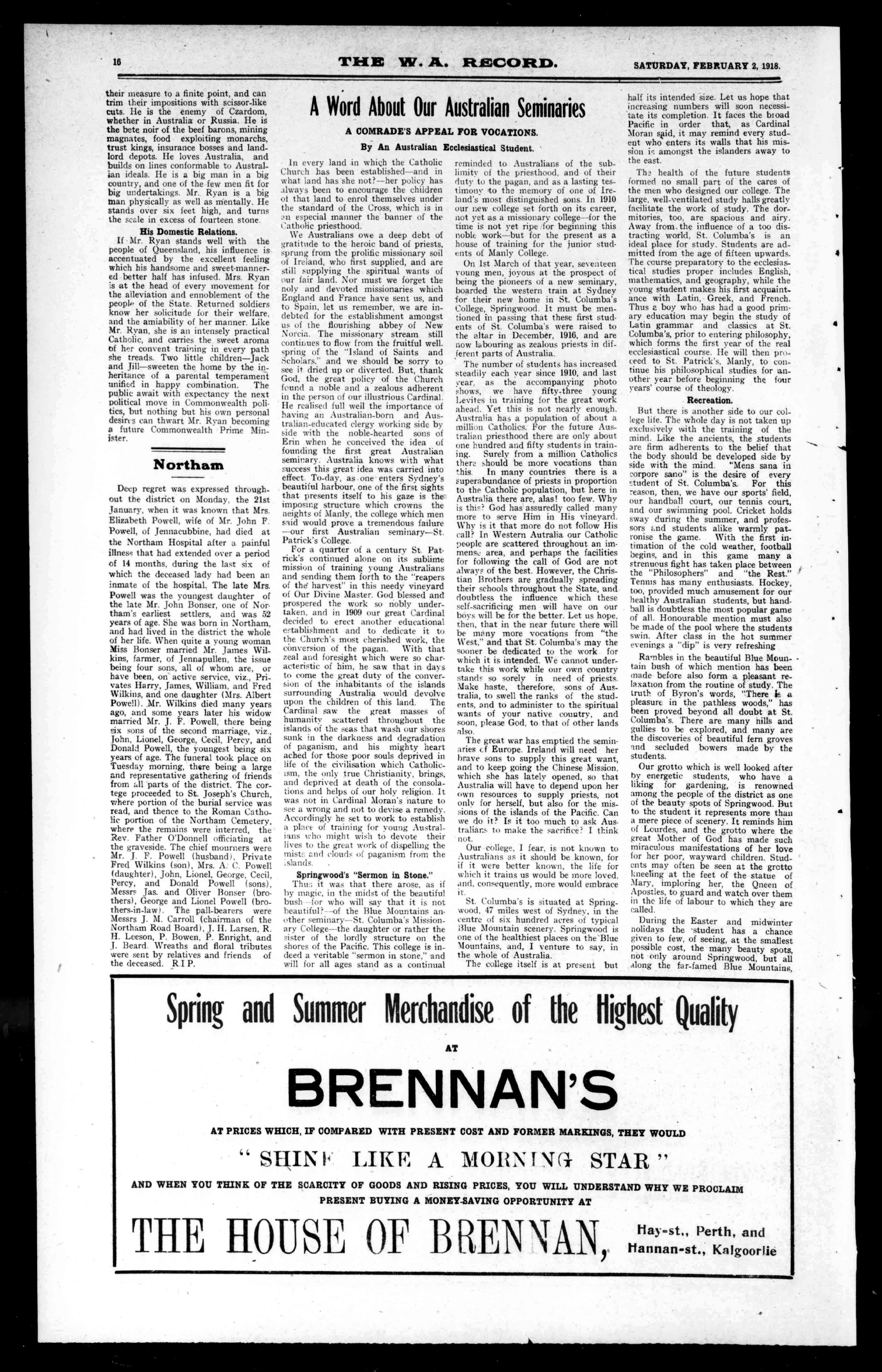 Allthis,Ithink,presentsabyno meansunpleasantpictureofthestudentdaysofthefuturepriest,andwe mustneedsbeforciblyremindedofthe wordsofOurDivineLord:"Myyoke issweet,andMyburdenlight." And,then,forwhatagloriouslifewe arepreparing!"WhatprofoundphilosophersourCatholicreligiousare!" saysCanonSheehan."Theygiveupnothingtogaineverything.Evenifthere werenoimmortality,theyarethe wisestofmortals."Besides,whata gloriousdestinyawaitsourChurchin Australia!InWesternAustraliathe tinyseedofourFaithwasfirstplanted, notwithoutmuchlabourandsuffering, bythezealousandself-sacrificingDr. Brady,ourfirstBishop.Now,indeed, that-seedhasgrownintoabeautiful tree.Butwemustnotstophere.We mustspreadthebranchesofthattree intoeverynookandcornerofour State.Aplentifulsupplyofpriestsis theonlymeansofdoingthis.