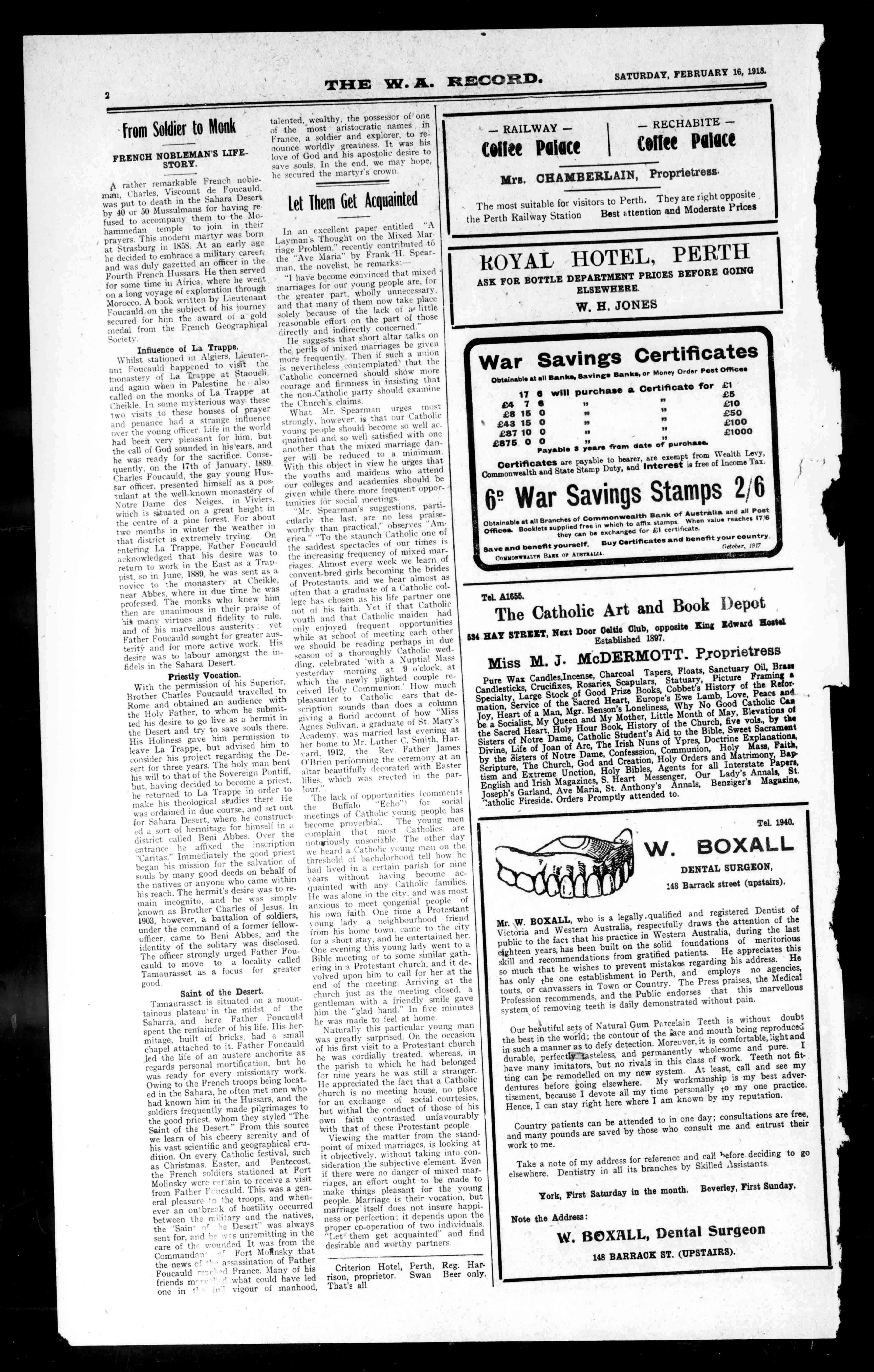 Foucauld 'dFrance.Manyofhis CriterionHotel,Perth,Reg.Hai, friendsm-'rtwhatcouldhaveledrison,proprietor.SwanBeeronly. oneint' vigourofmanhood,That'sall. -RAILWAYCollieNiece -RECHABITECoffeeHIM Mrs.CHAMBERLAIN,Proprietress. ThemostsuitableforvisitorstoPerth.Theyarerightopposite thePerthRailwayStationBestattentionandModeratePrices ROYALHOTEL,PERTH ASKFORBOTTLEDEPARTMENTPRICESBEFOREGOING ELSEWHERE. W.H.JONES 1 WarSavingsCertificates ObtainableatallBanks,SavingsBanks,orMoneyOrderPostOffices 176willpurchase £476 PI £13150 £43150 if £87100 £87500 Payable3yearsfrom aCertificatefor£1 £5 £10 £50 £100 £1000 11, tf dateofpurchase. Certificatesarepayabletobearer,areexemptfromWealthLevy, CommonwealthandStateStampDuty,andInterestisfreeofIncomeTax. 6°WarSavingsStamps2/6 ObtainableatallBranchesofCommonwealthBankofAustraliaandallPost Offices.Bookletssuppliedfreeinwhichtoaffixstamps.Whenvaluereaches17:6 theycanbeexchangedforf.:1certificate. Saveandbenefityourself.BuyCertificatesandbenefityourcountry rOlillOWW1ALTR nPAt'llTRALIk nefoher,!fir Tel.A16515, TheCatholicArtandBookDepot 634HAYSTRIZT,NextDoorCelticClub,oppositeKing&leadHotel Established1897. MissM.J.McDERMOTT.Pjoprietress PureWaxCandles,Incense,CharcoalTapers,Floats,SanctuaryOil,Brans Candlesticks,Crucifixes,Rosaries,Scapulars,Statuary,PictureFraminga Specialty,LargeStockofGoodPrizeBooks,Cobbet'sHistoryoftheReformation,Serviceofthe'SacredHeart,Europe'sEweLamb,Love,Peaceand Joy,HeartofaMan,Mgr.Benson'sLoneliness,WhyNoGoodCatholicCan beaSocialist,MyQueenandMyMother,LittleMonthofMay,Elevationsof theSacredHeart,HolyHourBook,HistoryoftheChurch,fivevols.,bythe SistersofNotreDame,CatholicStudent'sAidtotheBible,SweetSacrament Divine,LifeofJoanofArc,TheIrishNunsofYpres,DoctrineExplanations, bythesistersofNotreDame,Confesssion,Communion,HolyMass,Faith, Scripture,TheChurch,