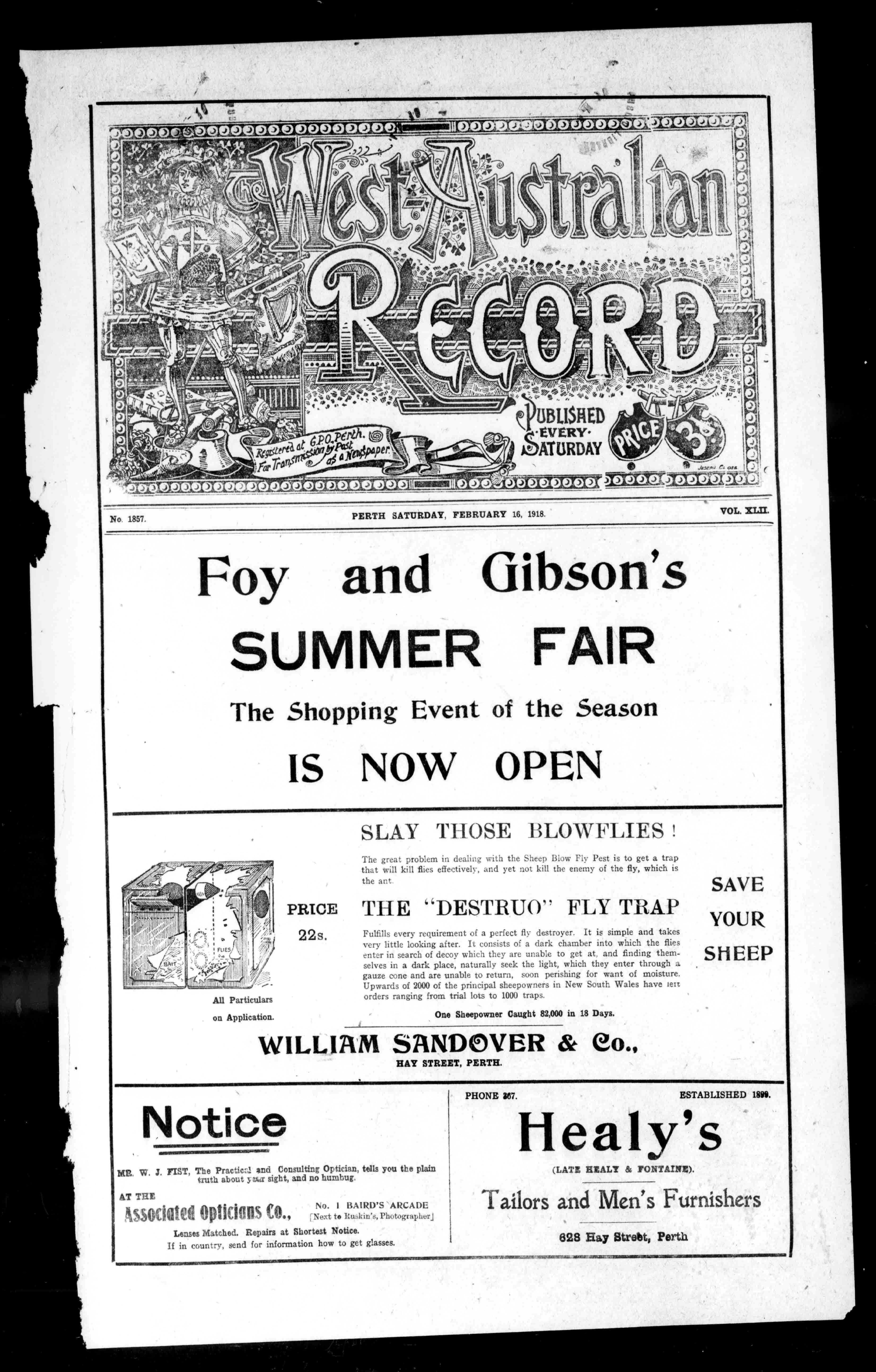 J.J.))..))313.) ) ) I 7T.5:Zila)rT.YrZ_)Wr ,, , Altes ,!? ig1/4 4$,#..e 44.e ,1;4 in . WHED SATURDAY )143pr Jaw.,e,cam VOL.XLII. No. 1857. PERTH SATURDAY, FEBRUARY 16, 1918. FoyandGibson's SUMMERFAIR TheShoppingEventoftheSeason ISNOWOPEN PRICE 22s. AllParticulars onApplication. Fulfillseveryrequirementofaperfectflydestroyer.Itissimpleandtakes verylittlelookingafter.Itconsistsofadarkchamberintowhichtheflies enterinsearchofdecoywhichtheyareunabletogetat.andfindingthemselvesinadarkplace,naturallyseekthelight,whichtheyenterthrougha gauzeconeandareunabletoreturn,soonperishingforwantofmoisture. Upwardsof2000oftheprincipalsheepownersinNewSouthWaleshavelent ordersrangingfromtriallotsto1000traps. OneSheepownerCaught82,000in18Days. WILLIAMSANDOVER&eo., HAY STREET,PERTH. SLAYTHOSEBLOWFLIES! ThegreatproblemindealingwiththeSheepBlowFlyPestistogetatrap thatwillkillflieseffectively,andyetnotkilltheenemyofthefly,whichis the ant. SAVE THE"DESTRUO"FLYTRAP YOUR SHEEP Notice MB.W.J.FIST,ThePractice:andConsultingOptician,tellsyoutheplain truthaboutInarsight,andnohumbug. ATTHE AssociatedopticiansCo., N tto IiBteAIRD'SARCADE skin's,Photographer.' LensesMatched.RepairsatShortestNotice. Ifincountry,sendforinformationhowtogetglasses. PHONE367. ESTABLISHED1899. Healy's (LATEHEALY & FONTAINE). TailorsandMen'sFurnishers 828HayBtrebt,Perth 11FICIEVIIMM114,111.111,1112MULMill.,111111.40101.,