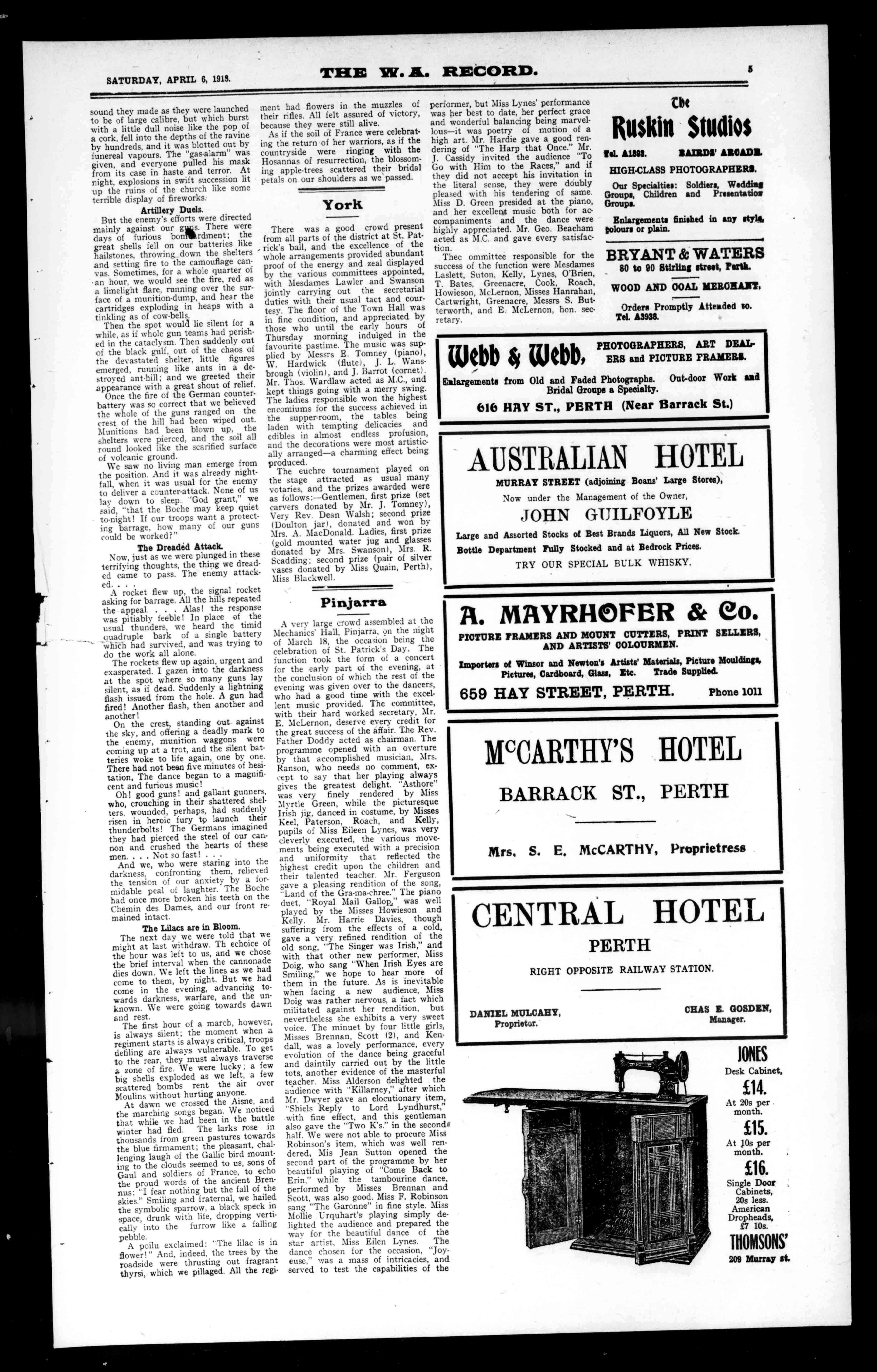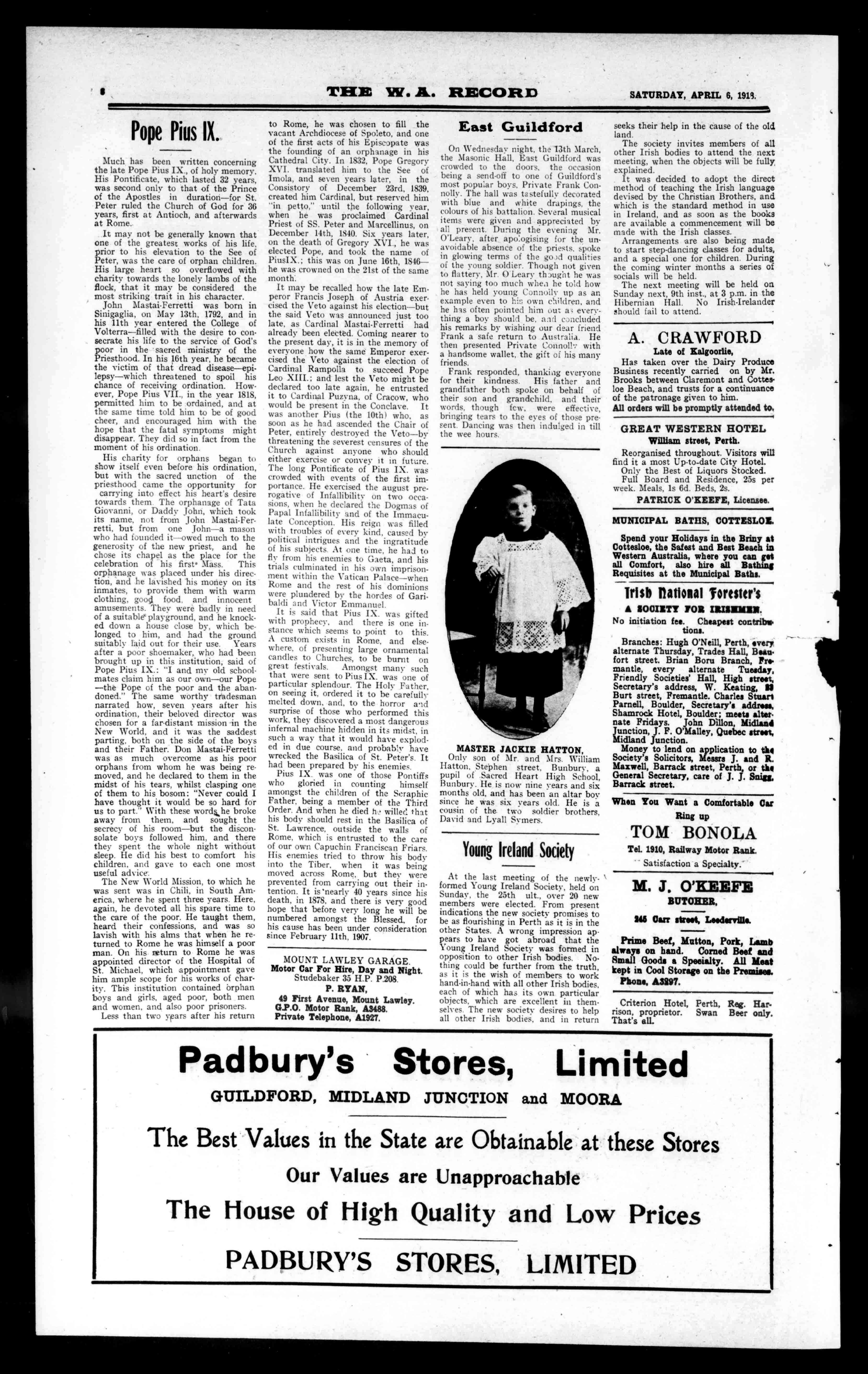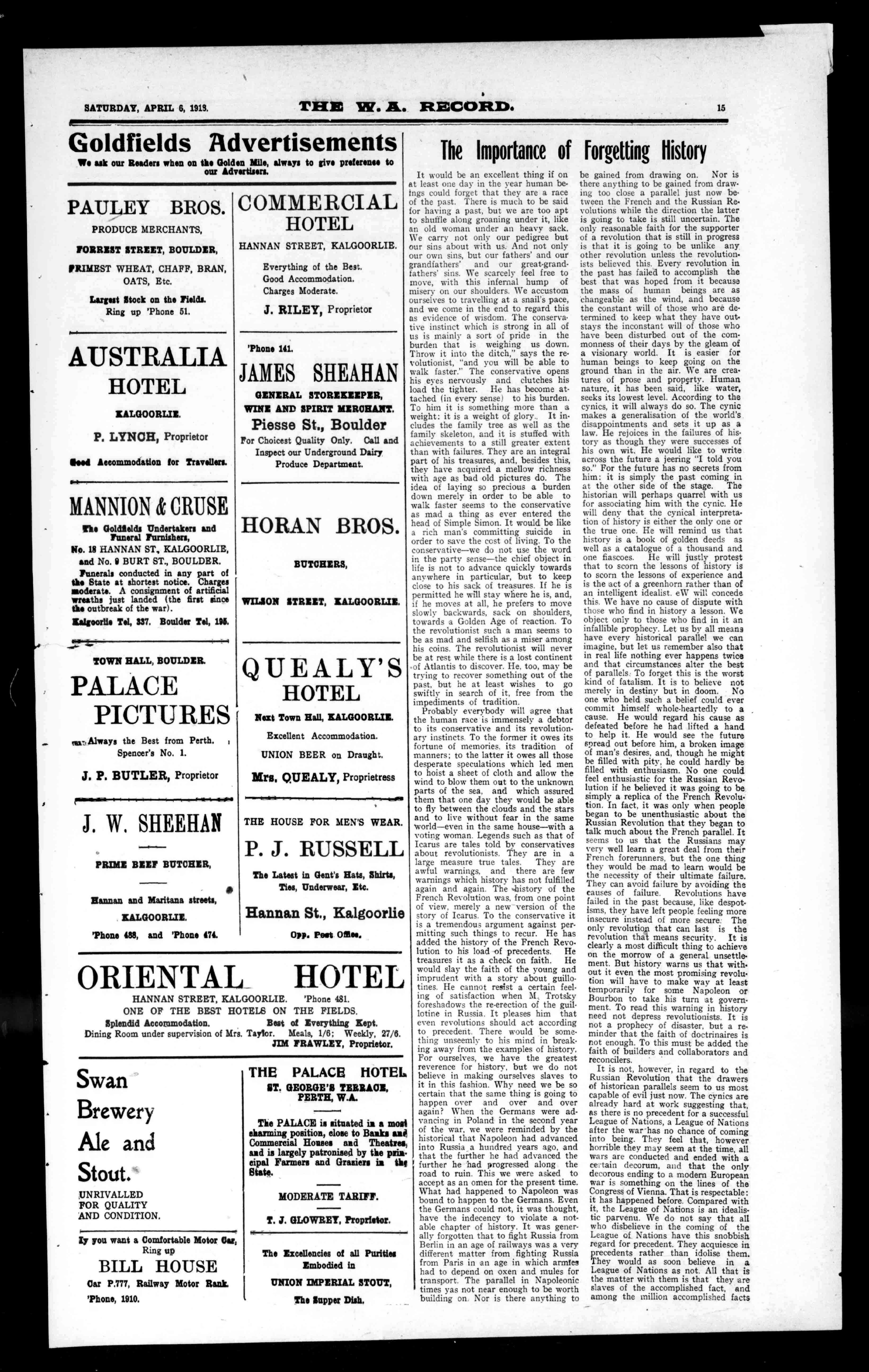 GLENORAN NO.10 SCOTLAND'SBEST PureMaltWhisky Assuppliedandercontractle W.A.HospitalsandG MedicalDepartment.AlsoItallwag DiningOarsandtheLoadingI$* andClubsthroughouttheState, BOLEAGIT!: Phil.Coyle MO1E'llONAMIZES. TheJ.J.BENDON SHOESTORES 130HIGHSTREET, FREMANTLE. PhoneBM. WHENINPERTHCALLOVERall TOWERHOTEL Charles-st.,WestPerth andyouroldfriendErniehandsout welcometoyouall. First-classResidentialHome. OnceaCustomer,Alwaysono. CleanlinessandAttention. E.McGRADE,Propristcr CriterionHotel,Perth,.leg.Har- rison,proprietor.SwanBeeronly. That'sall