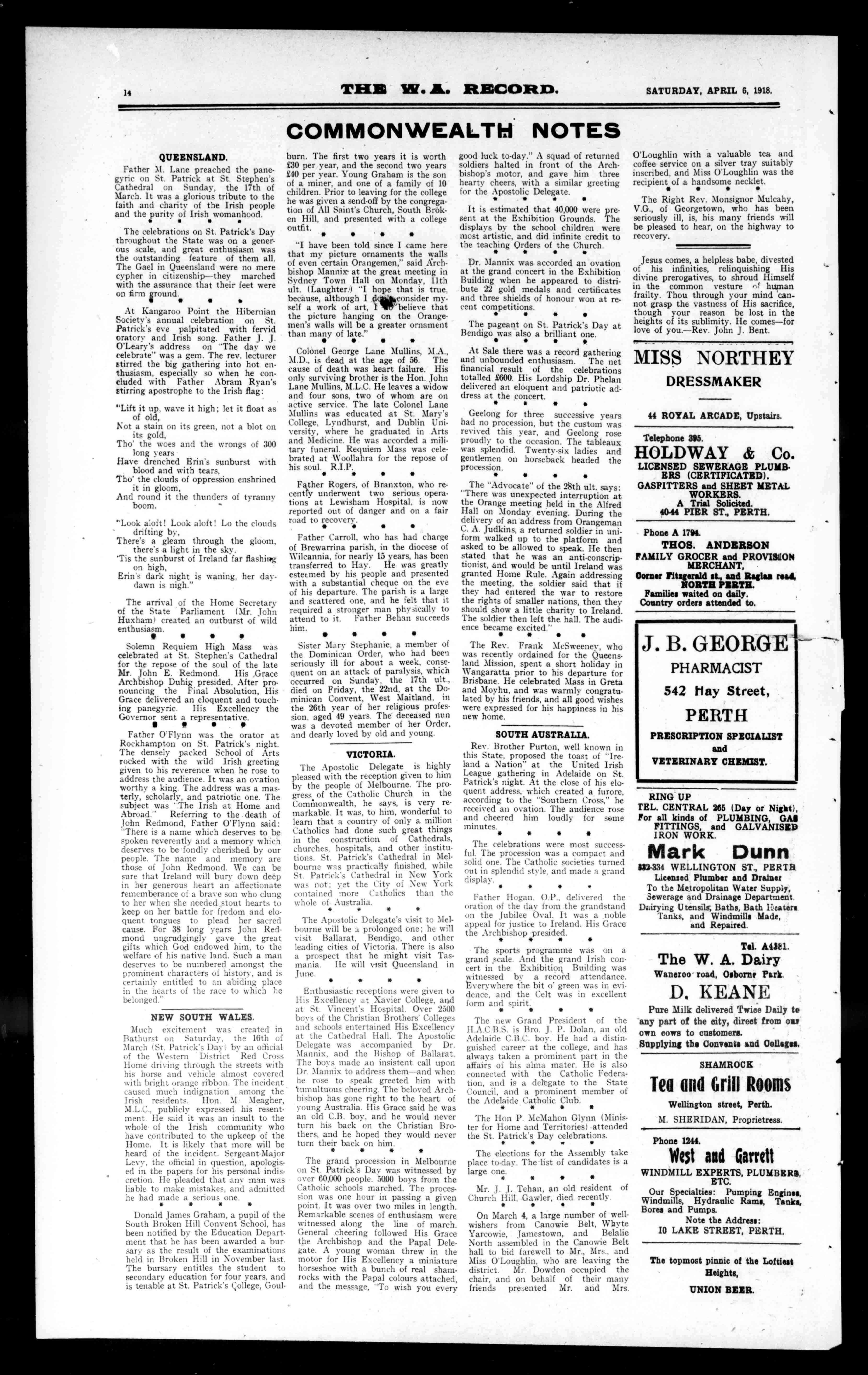 W.A.BoysintheUniversity. IforgottheChristianBrothers'CollegeoldboysattheMelbourneUniver-sitydinnerlastnightatSargeant's Cafe.BrotherMcCarthyipthechair. BrotherCulliganalsopresent.About 100present.W.A.boys:A.Fraser,B.A. (Law),E.J.Prendergast(Medicine), H.Cantor(Medicine),A.Masel,B.A. (Law),CyrilBryan(Medicine),G. Mayrhofer,B.A.(Medicine),M.Schenberg(Medicine),L.Flohm(Dentistry), M.Quealy(Dentistry),B.J.Hallion (Medicine).BrotherCulliganwascalled on,inviewofthelargeWestralianelement,tospeak.Heputupafighting speech.HegotaDr.Mannix-likerecep- tion.Itisagreatidea,andisgoingto beanannualaffair. About20or30Westralianpeople here.WearegoingtoformaW.A. Undergrads'Associationatonce.NextSundayArchbishopCattaneosings HighMass,andArchbishopMannix preaches.Wewillbethereat40a.m. tosecureaseat.