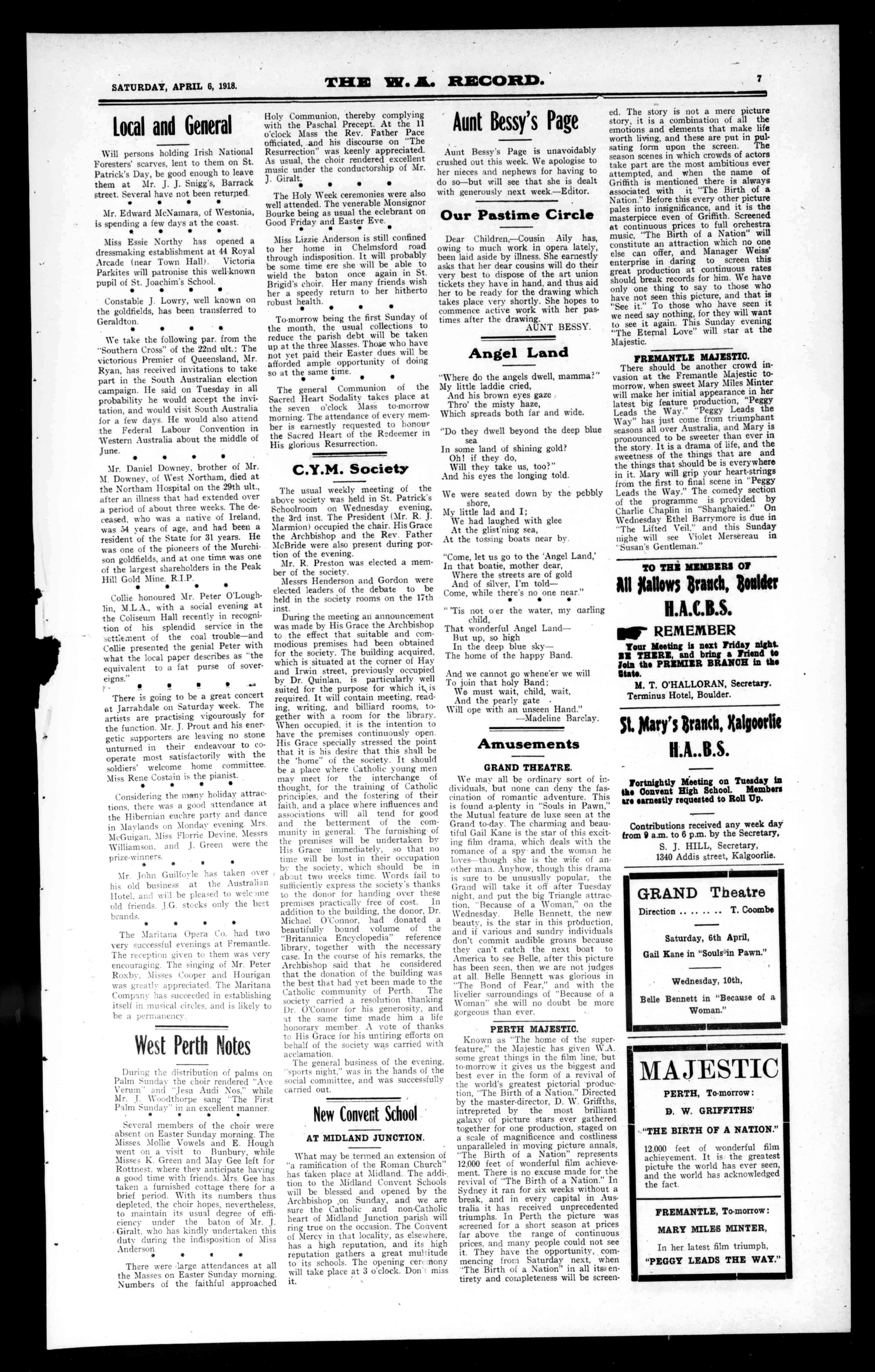 There'sSomethingintheWaythe MelbourneCatholicHoldshisHead. YouhavenotseenaproudCatholic tillyouseetheMelbournearticlethese days.There'ssomethingintheirwalk, inthewaytheyholdtheirhead,in theireyes,thatseemstotellyouthat theyareever-consciousofthefactthat theyfollowtheleadofthemanwhose fearlessfacelooksoutofthebuttonon theircoatordress.Ican'texplainit, butIfeelthesame,too,thoughbarely aweekhaselapsed.Youseemtobe sayingtoeveryoneelsehere"YOU don'townaDr.Mannix!" Thesportsintheafternoonwere scrumptious.Thechildrenfromthe variousconventschools,5000ofthem, patronisedallsortsofthings.Dressed incolours,theygaveustheShamrock, theCross,thePapalFlag.Thispart openedwithaprocessionledbythe Irishpipes-FatherCrowley'swould turngreenwithenvytoseetheleader