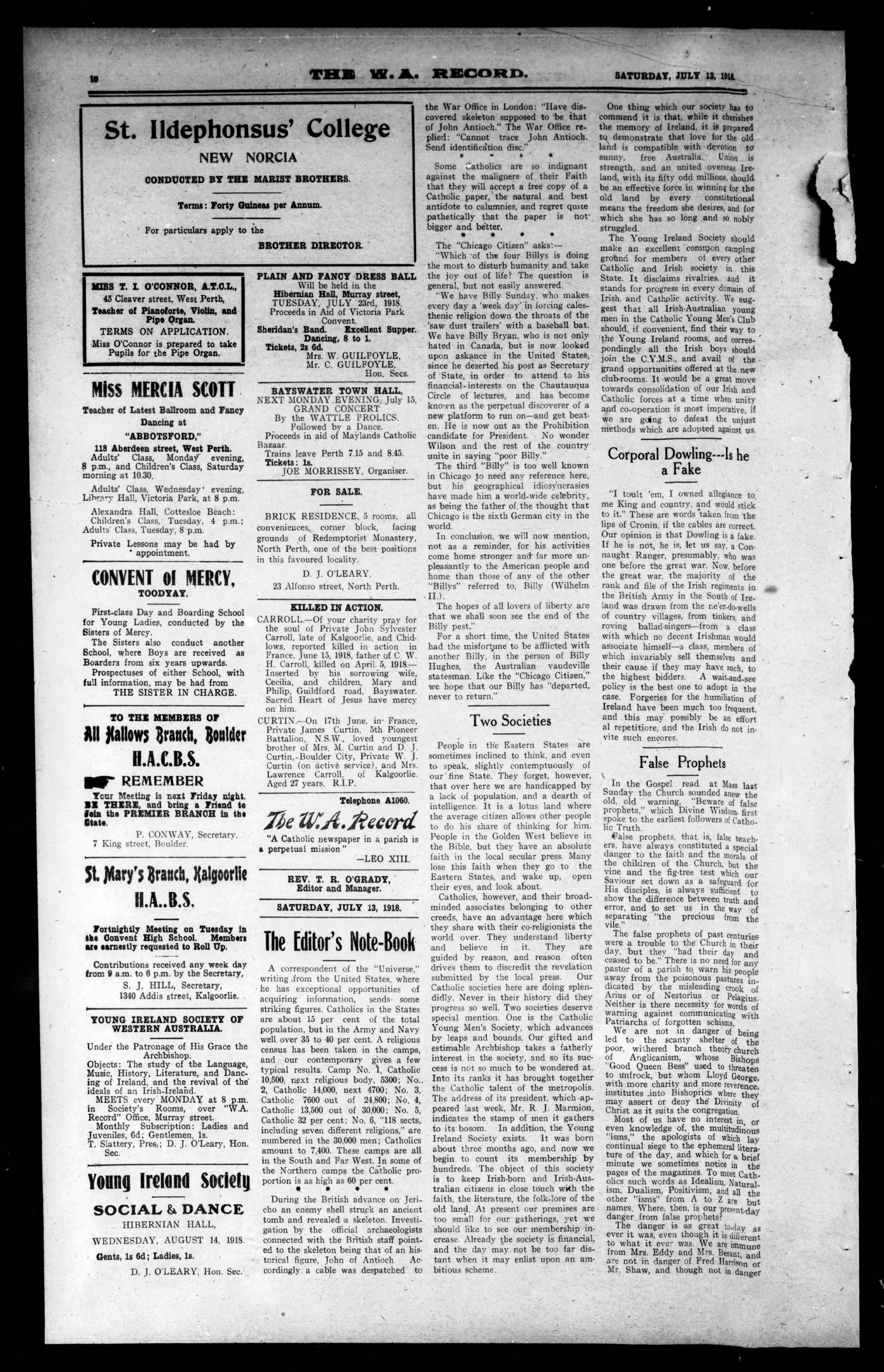 BishopinoneofourgreatChristian churchorganisations,shouldnotonly besuppressedandpreventedfromfurtherdisseminationoftheobnoxious seedofdiscordanddivision,butshould bepunishedtothefulllimitofthe law. Youhadeveryrighttobelieveand expectinyourvastaudienceofinvit gueststherewerethoseoftheCatholc faith.Thisshouldhavebeenmorethan reasonablyexpected,forthereason thatpersonalinvitationshadbeenextendedtothoseofthatfaithwhowere knowntohaveloyalandpatrioticsons marchingandfightingshoulderto shoulderwiththoseoftheProtestant faith,therebyofferingtosacrificetheir livesforDemocracy,Liberty,theFlag aridtheirCountry'sFreedom. Whetheryouintendedtooffend thoseofyourinvitedguests,ofthe Catholicfaithitisnotformetosay. Yetyoumusthaveobservedone thing,andthatwas,thatyoudid offendthem,andthatanumberof themdidleavethechurchhouseand refusedtherebytofurtherstandfor whattheycharacterisedasyourextremelyandhighlyinsultingremarks. Ourclergymen,ourcitizensandour press,membersofyourownChurch andfaith,andthoseofyourvisiting ministers,areopenlydenouncingand conremningyourunwisepolicyin selectingtheoccasionofaserviceflag ceremonytoengenderbybitterand uncalled-forremarks,religiousstrife, andtherebydiscordanddivision amongourcitizensandinourarmy.