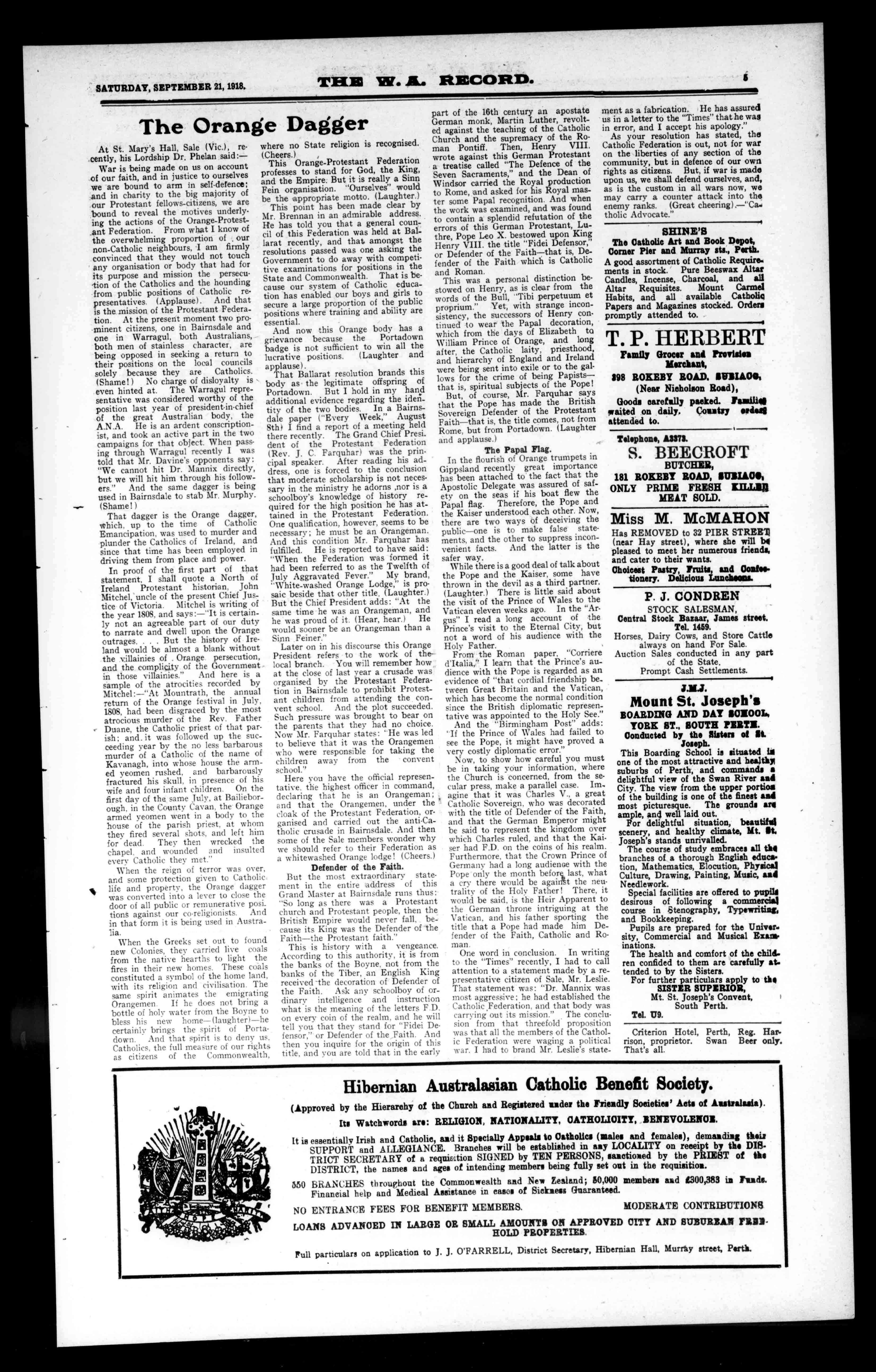 Whenthereignofterrorwasover, andsomeprotectiongiventoCatholic lifeandproperty,theOrangedagger wasconvertedintoalevertoclosethe doorofallpublicorremunerativeposi. tionsagainstourco-religionists.And inthatformitisbeingusedinAustralia.