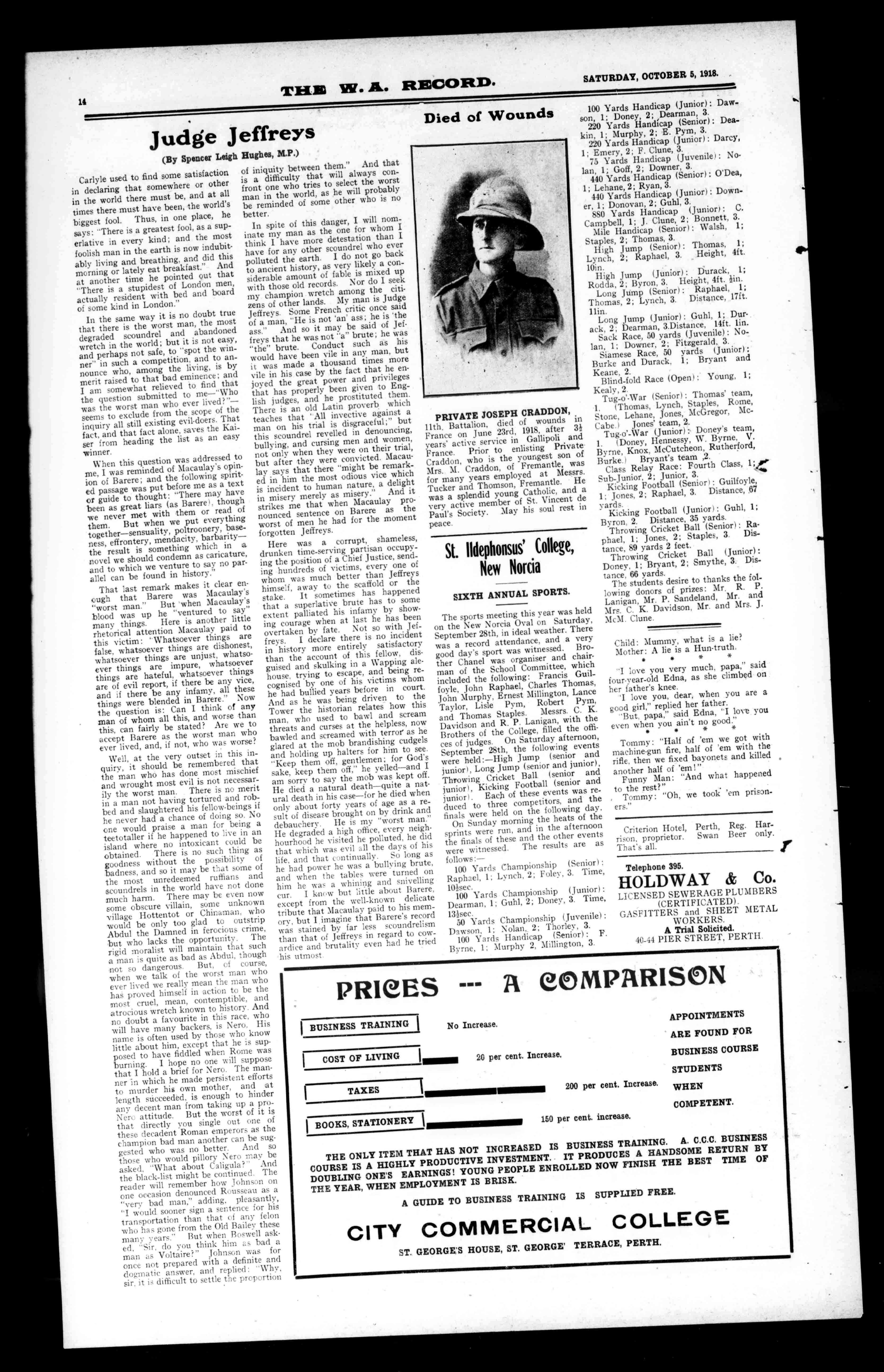 J.SPIGL TobacconistandStationery, Shaving,Haircutting. M,,cleratePrices Hay-street,opp.Foy's,andWellington.BeautifullyAppointedandTastefully street. Served. MOANACAFE HAY-STREET,PERTH. ForAfternoonTeaandSuppers. FORMOTORREPAIRS TRY NOEL \VaAGENTSFOR: SHREWSBURYandCHALLINERTYRES. SOLIDandPNEUMATIC.ENGLISHMADE. 92MURRAYSTREET,PERTH STUARTB.BOOTY ELECTRICALENGINEER&IMPORTER. 99MURRAYSTREET,PERTH SPECIALISTINMAGNETOANDALLIGNITIONREPAIRS. ALLWORKGUARANTEED. RemingtonTypewriters THEMACHINEFORTHEOFFICEANDSCHOOL. WritetousforCataloguesandsamplesofthefamous"Remtico" TypewriterSupplies. CarefullynoteourOnlyLocalAddressE.C.STOTT&Company 46ST.GEORGE'STERRACE,PERTH. MissKyle CorsetSpecialist BairdsArcade STOCKTAKINGSALE NowOn P.D.Corsets,Special,12/6. D.andA.,from5/11apair. Nautilas,4/6,6/6,7/11,8/11,etc. Alsootherlinesgreatlyreduced. Brassieres,front3/11to25/-. J.A.THOMSON,Co.Ltd PERTH,FREMANTLE,KALGOORLIE. SOLEAGENTSFOR: JONES'SEWINGMACHINES,BEALEPIANOS,CORNISHPIANOS andORGANS,andtheCelebratedCORNISHCABINETSINGING MACHINES-nothingtocomparewithitinAustralia. WRITEFORLISTANDTERMSOFPURCHASE.