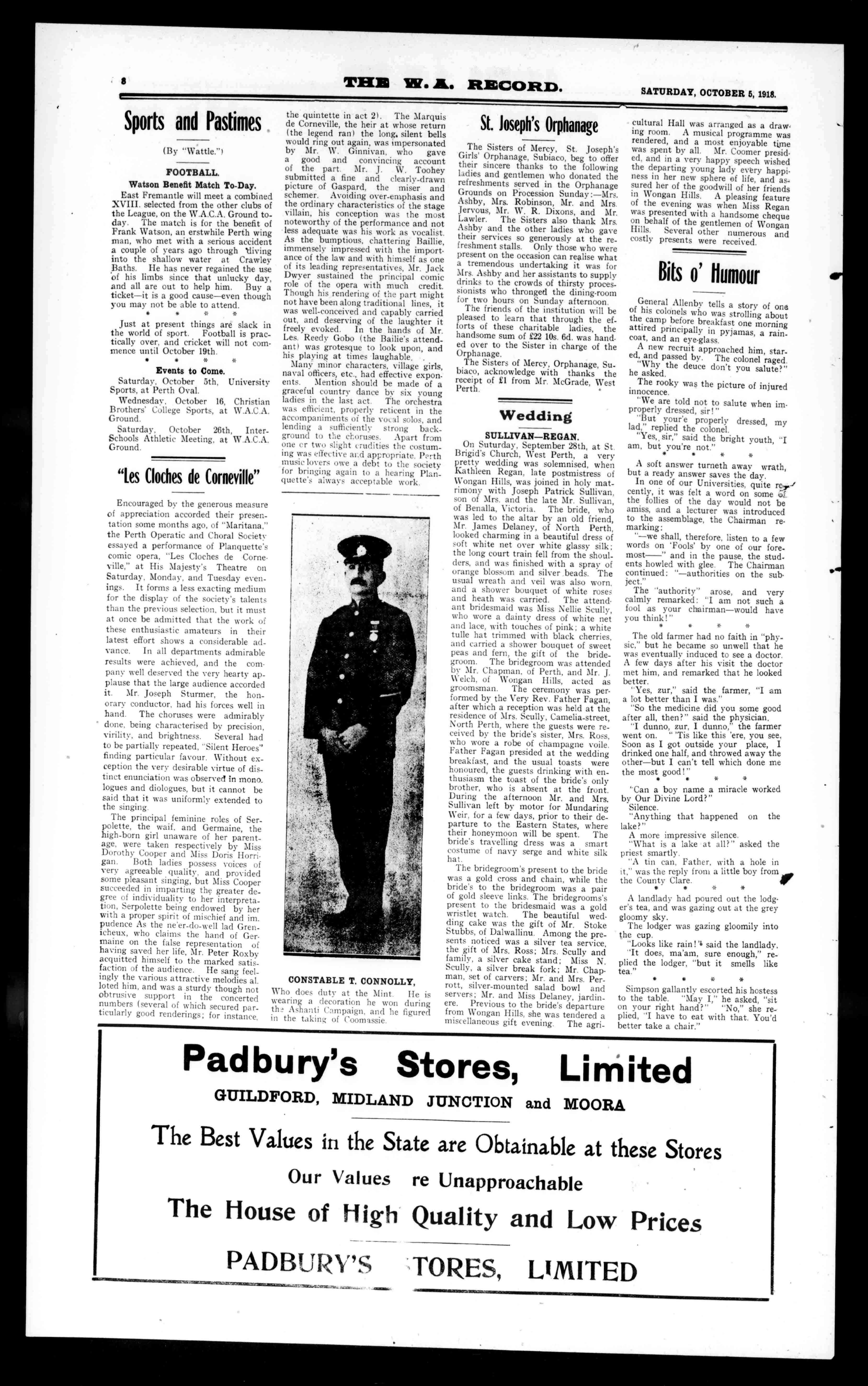 laterUnaChristinahadfoundherfather. Phone1244. WestandGarrett WINDMILLEXPERTS,PLUMBERS, ETC. Windmills,OurSpecialties:PumpingEngine., HydraulicRams,Tanks, BoresandPumps. NotetheAddress: I0LAKESTREET,PERTH. Tel.ACM. TheW.A.Dairy Wanerooroad,OsbornePark, D.KEANE PureMilkdelivered'twiceDailySe anypartofthecity,directfromOKI owncowstocustomers. SupplyingtheOonventsandColleges. SHAMROCK TeoandGrillRooms Wellingtonstreet,Perth. M.SHERIDAN,Proprietress. TheJ.J.BENDONO StiOESTORES 130RIGSSTRUT, PRILMANTLI, PhoneB426, RINGUP TELEPHONEA4625(DayorNight), ForallkindsofPLUMBING,t.1A11 FITTINGS,andGALVANISED IRONWORK. MarkDunn 33F-434WELLINGTONST.,PERTS LicensedPlumberandDrainer TotheMetropolitanWaterSupply, SewerageandDrainageDepartment. DairyingUtensils,Baths,BathHeaters,Tanks,andWindmillsMade, andRepaired. WHENINPERTHCALLOVERTO TOWERHOTEL Charles-st.,WestPerth andyouroldfriendErniehandsoatr welcometoyouall. First-classResidentialHome. OnceaCustomer,Alwaysone. CleanlinessandAttention. E.MoGRADE,Proprletcr WINDSOR HOTEL SOUTHPERTH MRS.A.O'CONNOR, Proprietress. GLENORAN NO,10 SCOTLAND'SBEST PureMaltWhisky AssuppliedundercontracttoOtt W.A.HospitalsandGowernissai MedicalDepartment.AlsoRelive, DiningOarsandtheLeadingKaiak andClubsthroughouttheState. SOLEAGENT: Phil.Coyle MOIR'SCHAMBERS. CriterionHotel,Perth,Reg.Har- rison,proprietor.SwanBeeronly That'sall. PrintedandPublishedfortheProprietorsofthe"WestAustralianRe- cord"byThomasSlattery,23Murray_ street,Perth. tic ticp-/fit it