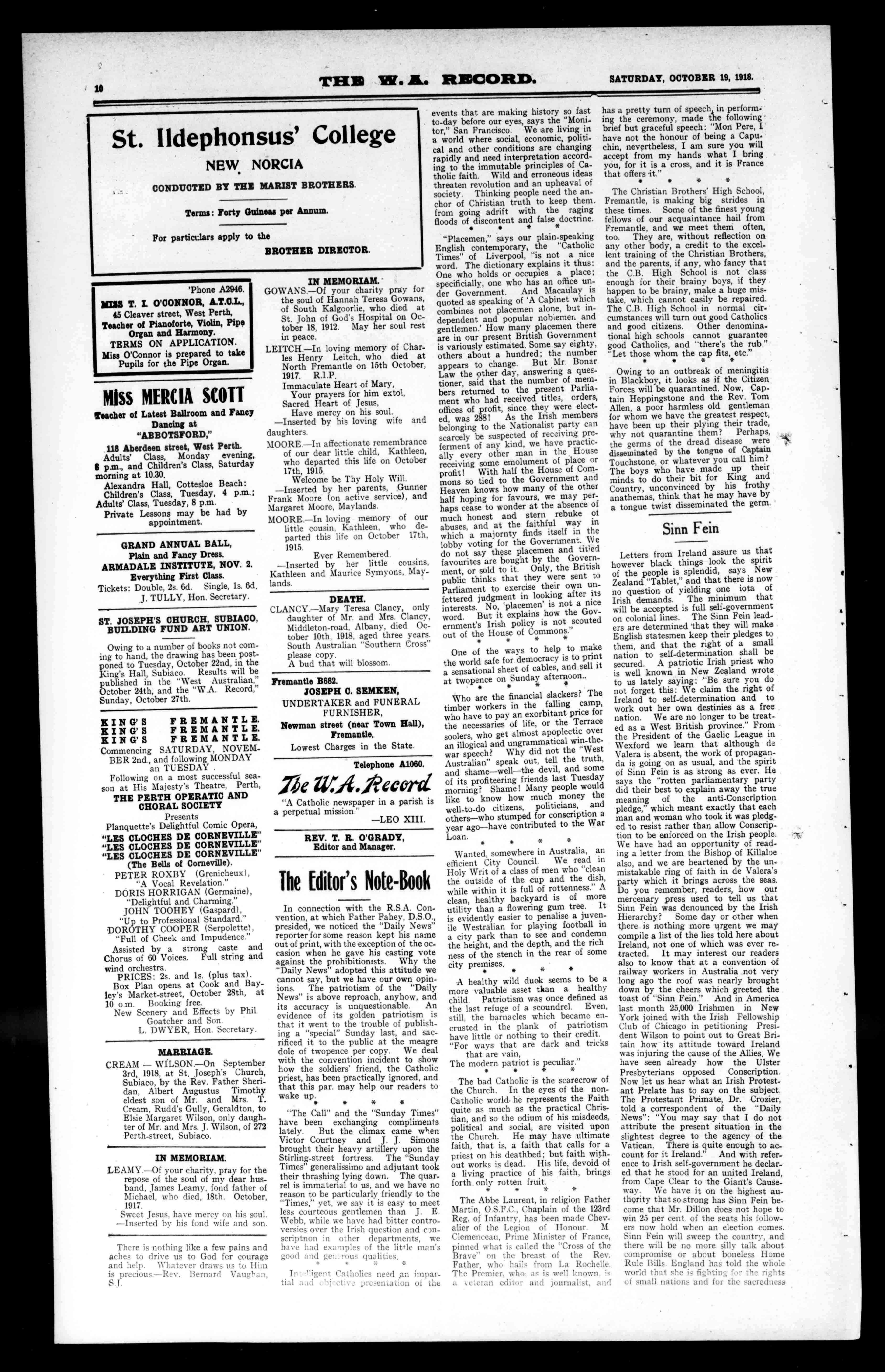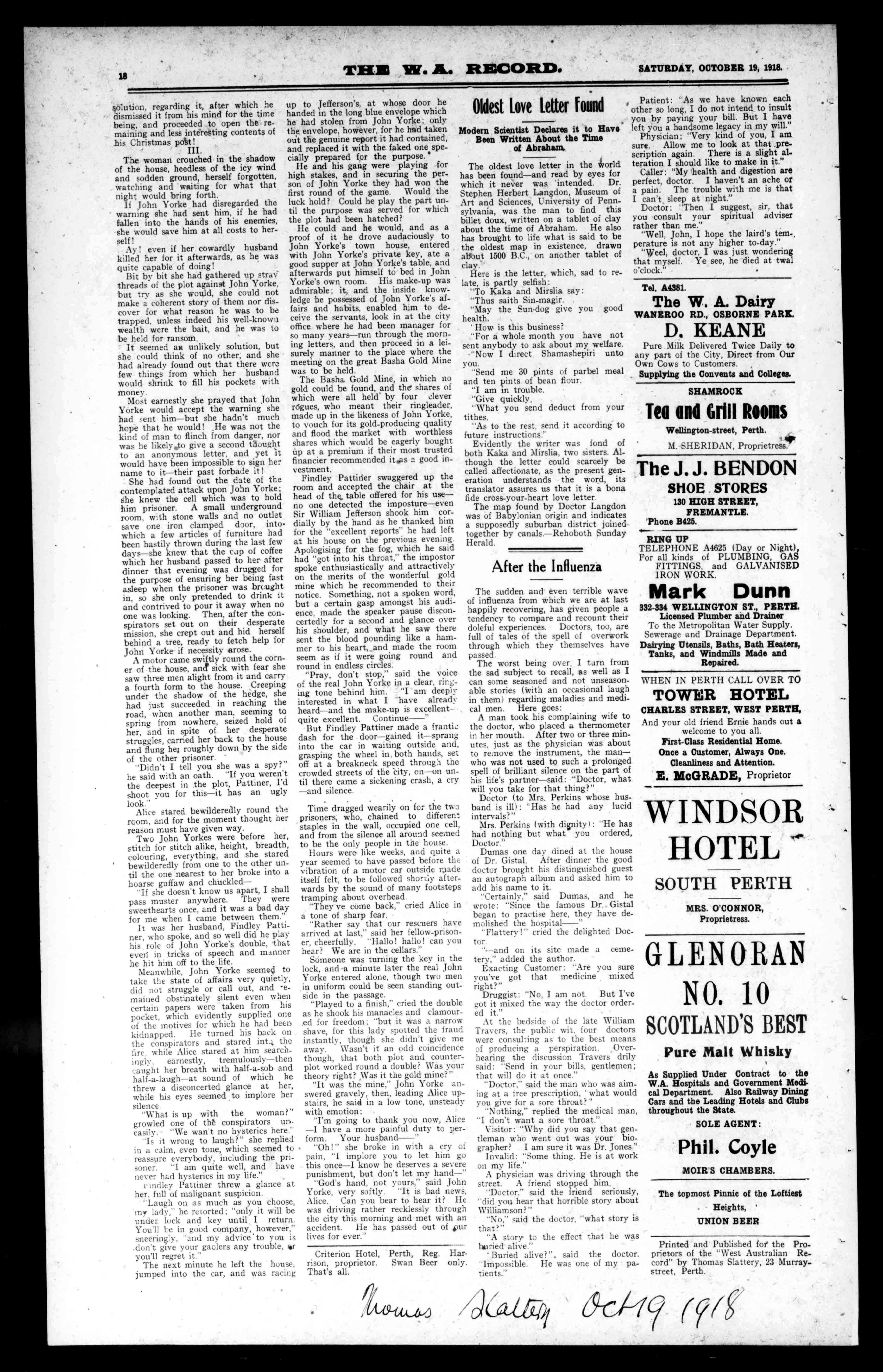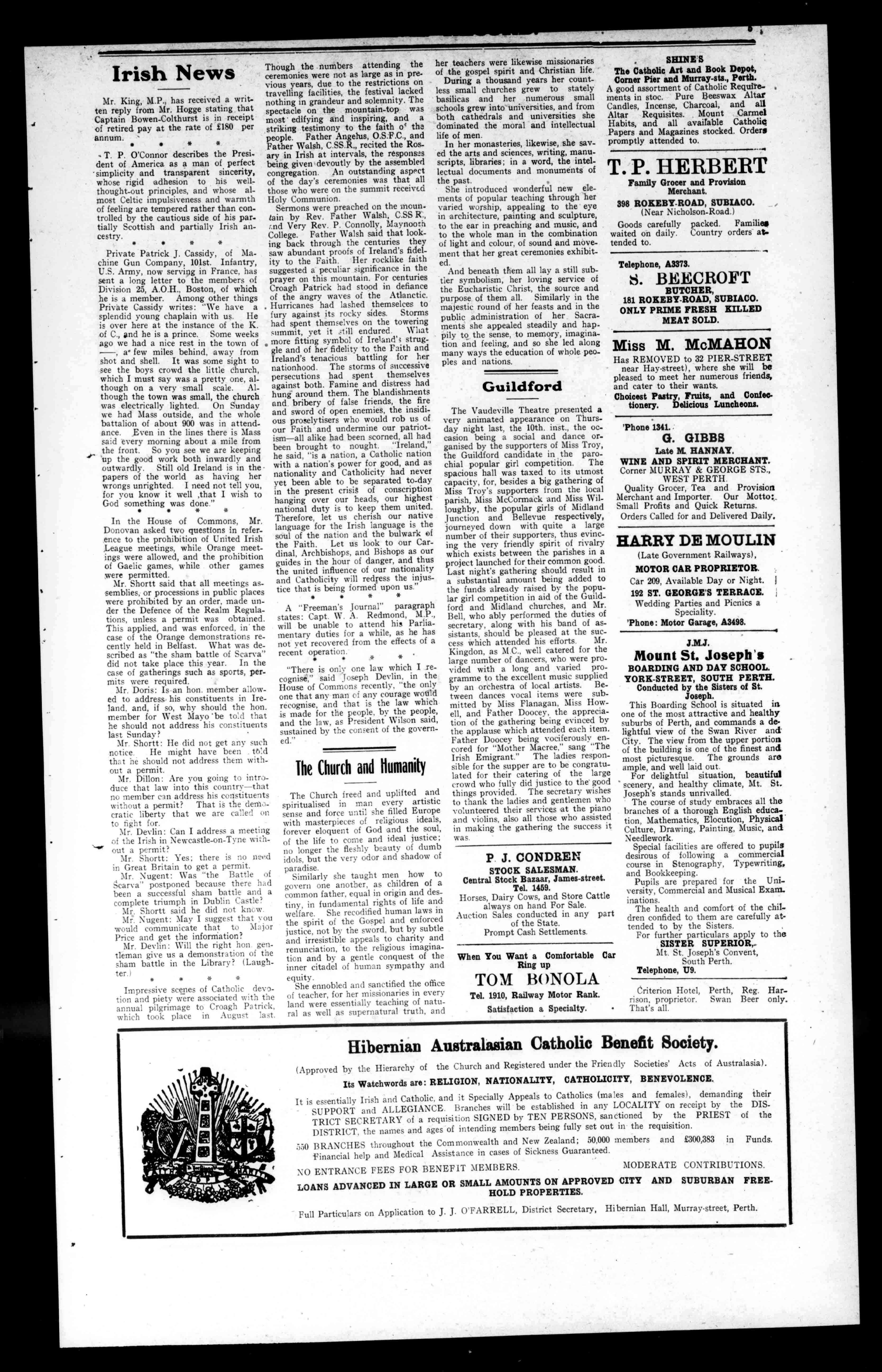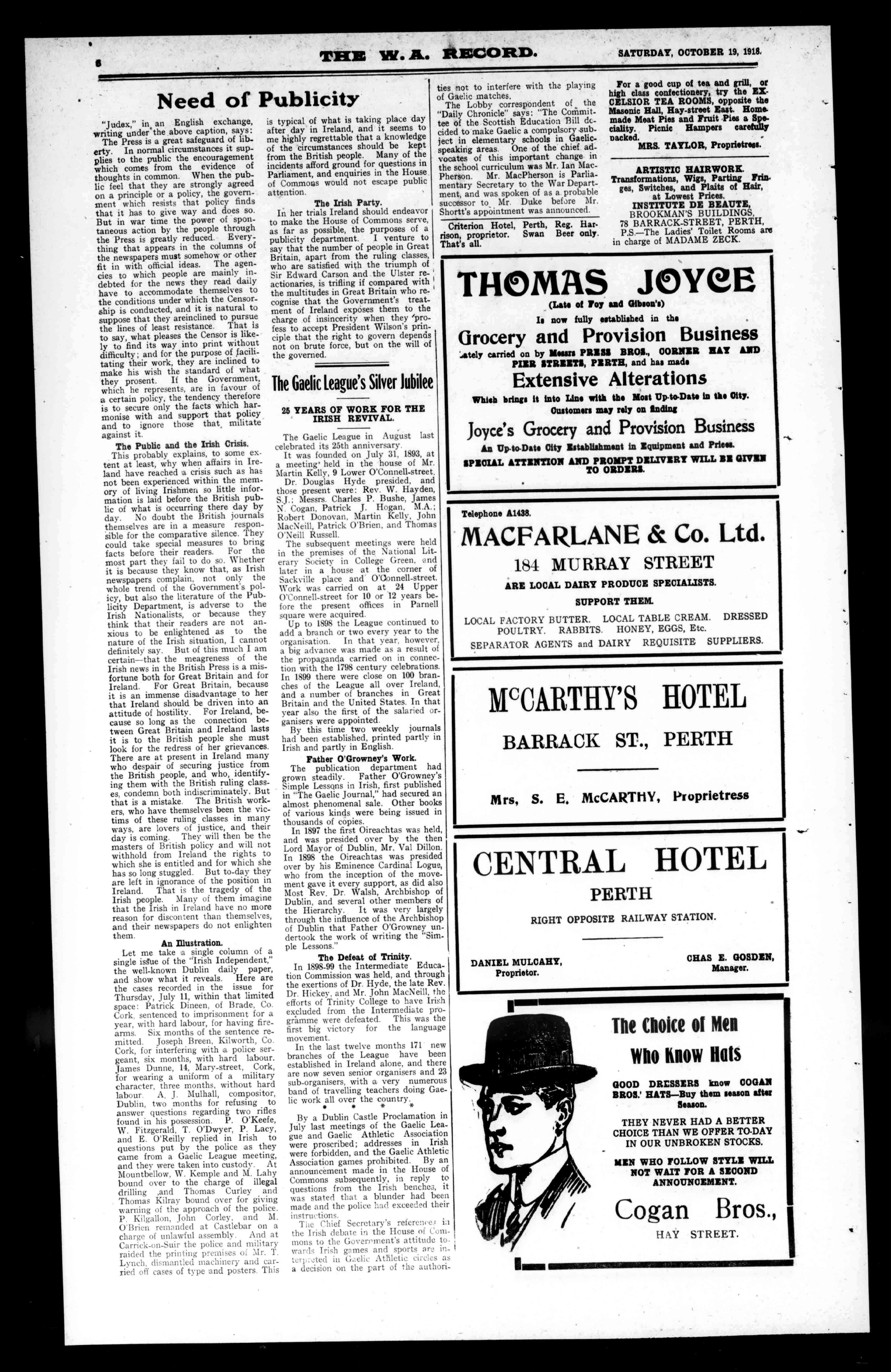 youconsultyourspiritualadviser ratherthanme." "Well,John,Ihopethelaird'stem-, peratureisnotanyhigherto-day." "Weel,doctor,Iwasjustwondering thatmyself.Yesee,hediedattwal o'clock" Tel.A4381. TheW.A.Dairy WANER00RD.,OSBORNEPARK. D.KEANE PureMilkDeliveredTwiceDailyto anypartoftheCity,DirectfromOur OwnCowstoCustomers. SupplyingtheConventsandColleges. SHAMROCK TeaandGrillRooms Wellington-street,Perth, 11 401 ERIDAN.Proprietress. TheJ.J.BENDON SHOESTORES 130HIGHSTREET, FREMANTLE. 'PhoneB425. RINGUP TELEPHONEA4625(DayorNight), ForallkindsofPLUMBING,GAS FITTINGS,andGALVANISED IRONWORK. MarkDunn 332-334WELLINGTONST.,PERTH. LicensedPlumberandDrainer TotheMetropolitanWaterSupply. SewerageandDrainageDepartment. DairyingUtensils,Baths,BathHeaters, Tanks,andWindmillsMadeand Repaired. WHENINPERTHCALLOVERTO TOWERHOTEL CHARLESSTREET,WESTPERTH, AndyouruldfriendErniehandsouta welcometoyouall. First-ClassResidentialHome. OnceaCustomer,AlwaysOne. CleanlinessandAttention. E.MoGRADE,Proprietor WINDSOR HOTEL SOUTHPERTH MRS.O'CONNOR, Proprietress. GLENORAN NO.10 SCOTLAND'SBEST PureMaltWhisky AsSuppliedUnderContracttothe W.A.HospitalsandGovernmentMedicalDepartment.AlsoRailwayDining CarsandtheLeadingHotelsandClubs throughouttheState. SOLEAGENT Phil.Coyle MOIRSCHAMBERS. ThetopmostPinnicoftheLoftiest Heights, UNIONBEER PrintedandPublishedfoftheProprietorsofthe"WestAustralianRecord"byThomasSlattery,23Murraystreet,Perth. ftzLt 46LL6-24 (7(f
