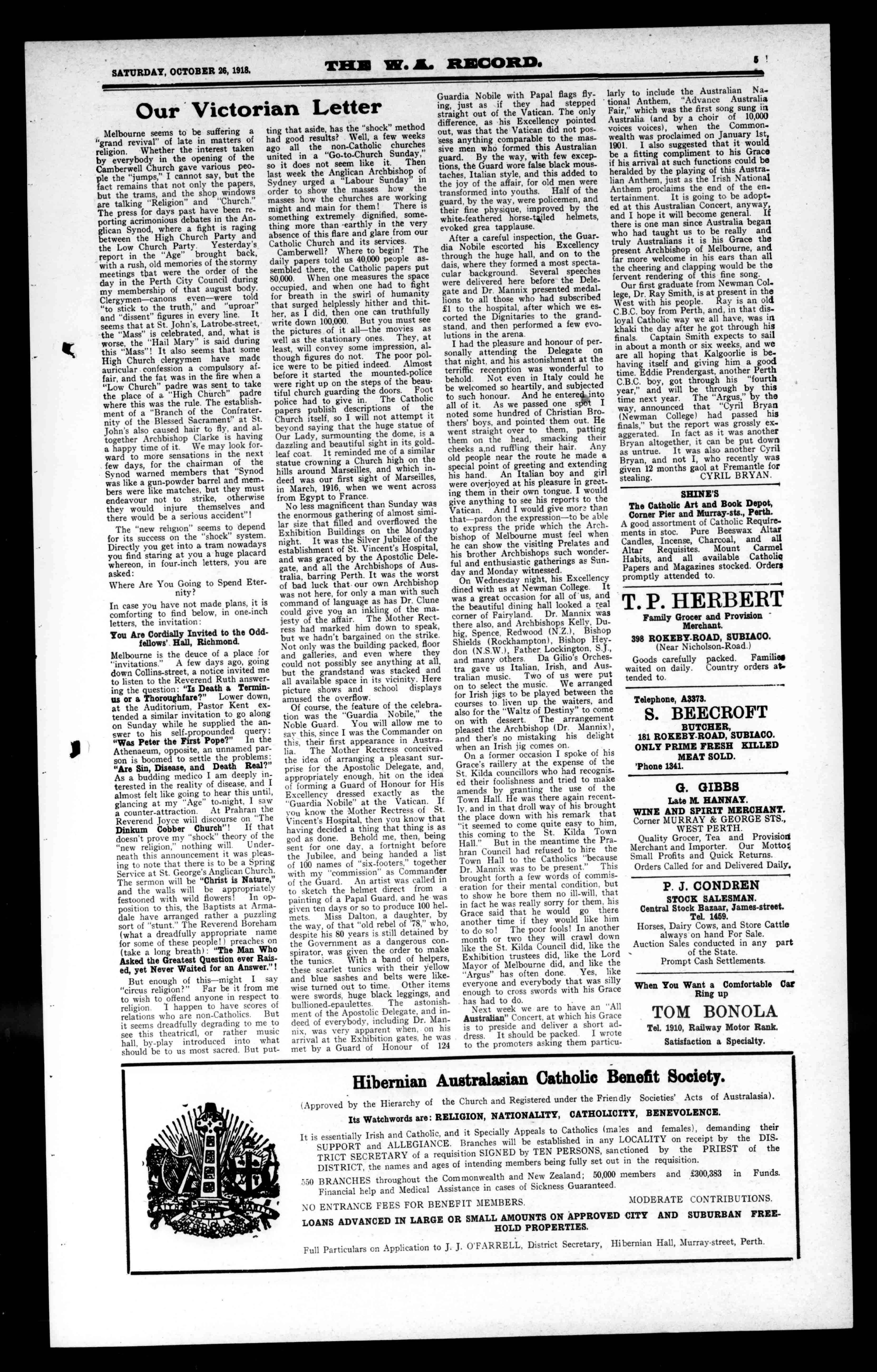 SundaylastwasanimportantoccasionatKellerberrin,foronthatoccasiontheenterpriselaunchedoneyear agowasbroughtnearerrealisationby theopeningofthemagnificentnew BoardingSchool.Therewasalarge gatheringfromthetownandsurroundingdistrict,andhisGraceblessedand insertedthefoundationtablet,after whichalladjournedtotheChurch, wheretheArchbishopaddressedthe peopleinhisusualeloquentway,congratulatingpriestandpeopleonthe excellentresultstheyhadachievedin thecourseofthepastthreeyears,and hewasallthemoreimpressedand gratifiedwhenheconsideredthatonly afewshortyearsagotherewasnota singleChurchthroughouttheextentof thatenormousdistrict.Onthatday hewaspleasedtoseethatKellerberrin wasequippedaswell,ifnotbetter,than mostparishesintheArchdiocese,a beautifulChurch,aschoolandconvent,andtodaytheycrownedallwith theopeningofthenewboarding school,wherethechildrenoftheoutbacksettlerscouldsecurethateducationalandreligioustrainingwhichthe SistersofSt.Josephcansoefficiently impart.Healsocongratulatedthe Sistersonthegreatworktheyhad achievedduringtheirtwelvemonthsin thedistrict.Aftertheaddressacollectionwastakenuptowardsthebuildingfund,and£46wasnetted.BenedictionoftheBlessedSacramentbrought AfternoonteawasprovidedbytheCathefunctiontoanappropriateclose. tholicladiesintheschoolroom,and thevisitorswereshownthroughthe newbuilding.