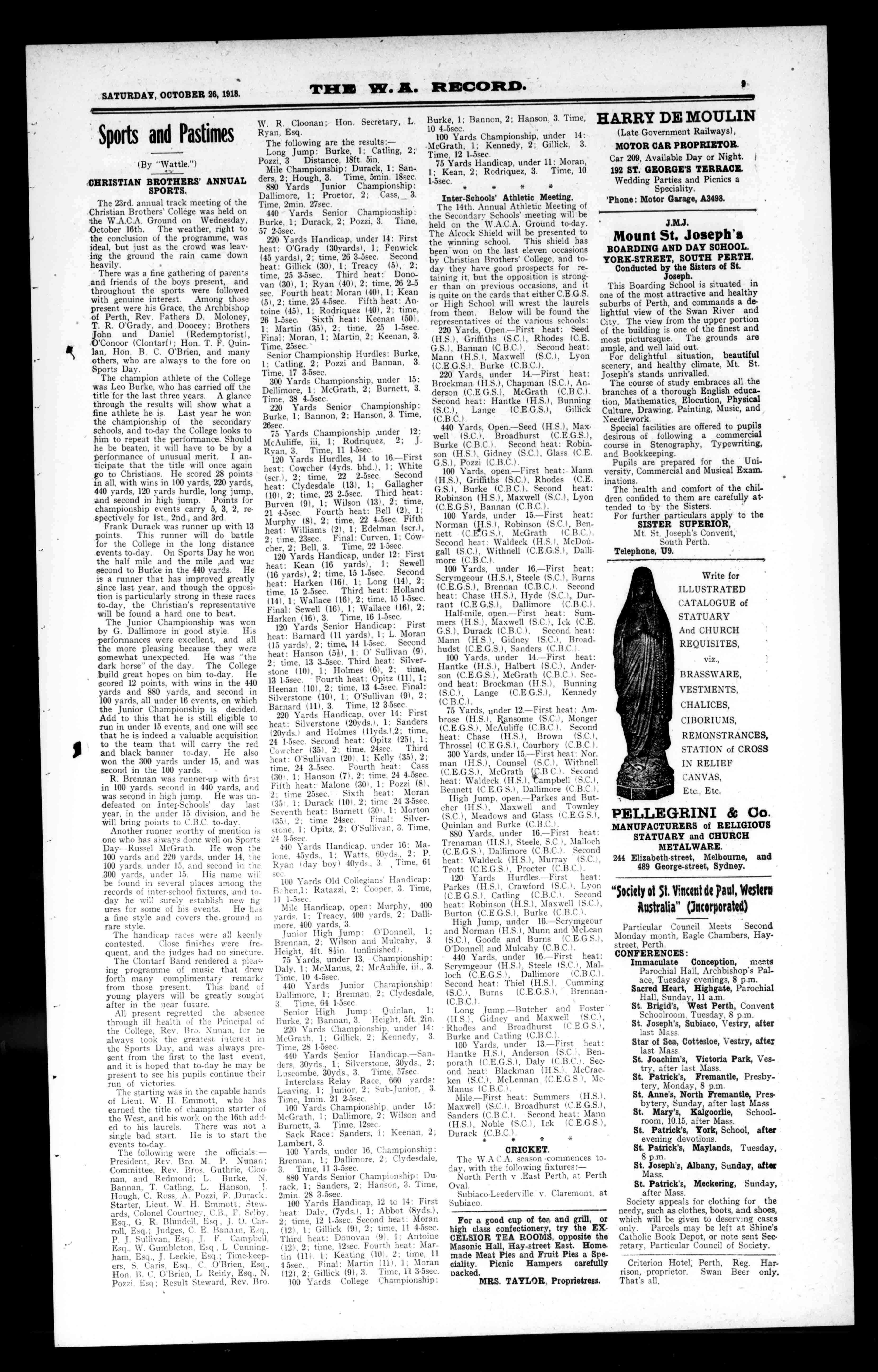 Thefollowingaretheresults:- 100YardsChampionship,under14: LongJump:Burke,1;Catling,2;McGrath,1;Kennedy,2;Gillick,3. Pozzi,3Distance,18ft.Sin. Time,121-5sec. 75YardsHandicap,under11:Moran, MileChampionship:Durack,1;Sept. ders,2;Hough,3.Time,5min.18sec.1;Kean,2;Rodriquez,3.Time,10 880YardsJuniorChampionship:1-5sec. * * Dallimore,1;Proctor,2;Cass,3. Inter-Schools'AthleticMeeting. Time,2min.27sec. The14th.AnnualAthleticMeetingof 440YardsSeniorChampionship:theSecondarySchools'meetingwillbe Burke,1;Durack,2;Pozzi,3.Time,heldontheW.A.C.A.Groundto-day. 572-5sec. TheAlcockShieldwillbepresentedto 220YardsHandicap,under14:Firstthewinningschool.Thisshieldhas heat:O'Grady(30yards),1;Fenwickbeenwononthelastelevenoccasions (45yards),2;time,263-5sec.SecondbyChristianBrothers'College,andtoheat:Gillick(30),1;Treacy(5),2;daytheyhavegoodprospectsforretime,253-5sec.Thirdheat:Dono-tamingit,buttheoppositionisstrongvan(301,1;Ryan(40),2;time,262-5erthanonpreviousoccasions,andit sec.Fourthheat:Moran(40),1;KeanisquiteonthecardsthateitherC.E.G.S. (51,2;time,254-5sec.Fifthheat:AnorHighSchoolwillwrestthelaurels tome(45),1;Rodriquez(40),2;time,fromthem.Belowwillbefoundthe 261-5sec.Sixthheat:Keenan(50),representativesofthevariousschools: 1;Martin(35),2;time,251-5sec. 220Yards,Open.-Firstheat:Seed