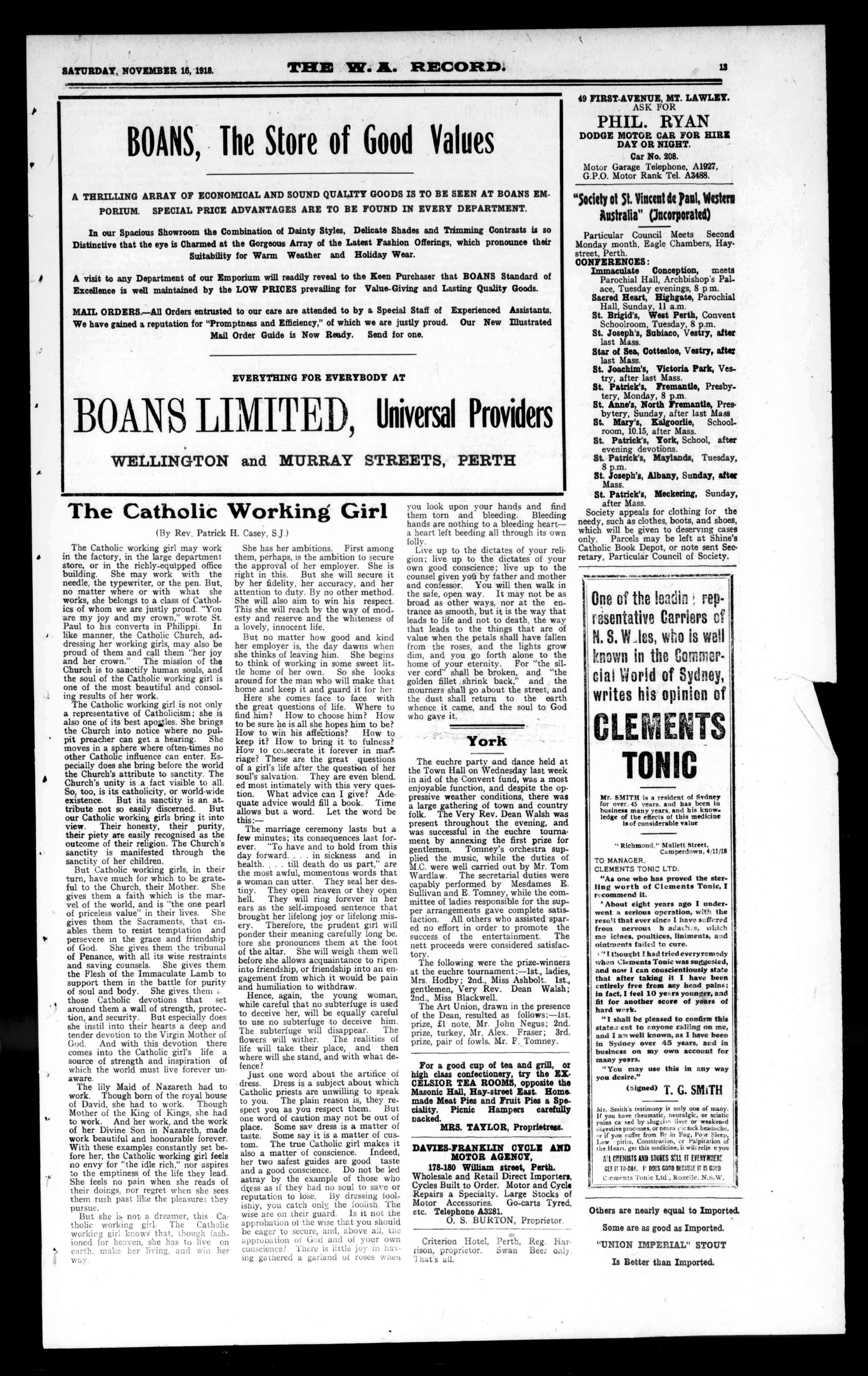 SATURDAY,NOVEMBER16,1918. THEW.A.RECORD. 13 fr BOANS,TheStoreofGoodValues ATHRILLINGARRAYOFECONOMICALANDSOUNDQUALITYGOODSISTOBESEENATBOANSEMPORIUM.SPECIALPRICEADVANTAGESARETOBEFOUNDINEVERYDEPARTMENT. InourSpaciousShowroomtheCombinationofDaintyStyles,DelicateShadesandTrimmingContrastsisso DistinctivethattheeyeisCharmedattheGorgeousArrayoftheLatestFashionOfferings,whichpronouncetheir SuitabilityforWarmWeatherandHolidayWear. I AvisittoanyDepartmentofourEmporiumwillreadilyrevealtotheKeenPurchaserthatBOANSStandardof ExcellenceiswellmaintainedbytheLOWPRICESprevailingforValue-GivingandLastingQualityGoods. A 6 MAILORDERS.-AllOrdersentrustedtoourcareareattendedtobyaSpecialStaffofExperiencedAssistants. Wehavegainedareputationfor"PromptnessandEfficiency,"ofwhichwearejustlyproud.OurNewIllustrated MailOrderGuideisNowReady.Sendforone. EVERYTHINGFOREVERYBODYAT BOANSLIMITED,UniversalProviders dIM=M11111=1111, WELLINGTONandMURRAYSTREETS,PERTH TheCatholicWorkingGirl