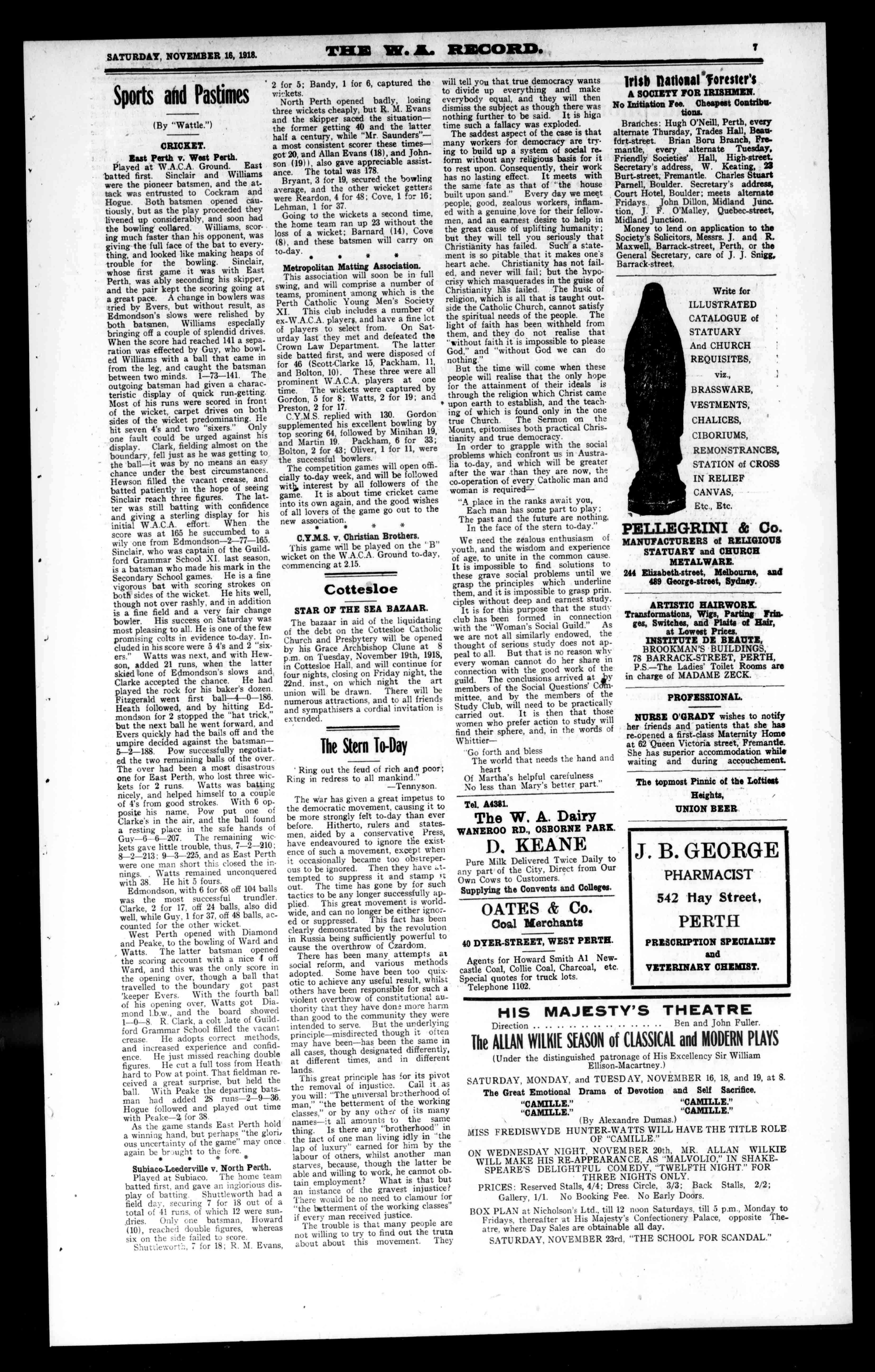 SUBIACOHOTEL ROKEBY-ROAD,SUBIACO. EmuBeerAlwaysonTap. GoodAccommodationforCountry Visitors, WALTERWING,Proprietor. WhenYouWantaComfortableOar Ringup TOMBONOLA Tel.1910,RailwayMotorRank. SatisfactionaSpecialty. P.J.CONDREN STOCKSALESMAN. CentralStockBazaar,James-street. TeL1469. Horses,DairyCows,andStoreCattle alwaysonhandForSale. AuctionSalesconductedinanypart oftheState. PromptCashSettlements. G.GIBBS LateKHANNAY. WINEANDSPIRITMERCHANT. CornerMURRAY&GEORGESTS., WESTPERTH. QualityGrocer,TeaandProvision MerchantandImporter.OurMotto: SmallProfitsandQuickReturns. OrdersCalledforandDeliveredDaily. 'Phone1244. WestandGarrett WINDMILLEXPERTS,PLUMBERS, ETC. OurSpecialties:PumpingEngines, Windmills,HydraulicRams,Tanks, BoresandPumps. NotetheAddress: 10LAKESTREET,PERTH. HARRYDEMOULIN (LateGovernmentRailways), MOTOROARPROPRIETOR. Car209,AvailableDayorNight. 192ST.GEORGE'STERRACE. WeddingPartiesandPicnicsa Speciality. 'Phone:MotorGarage,A3498. SAVOYCAFE HAY-STREET(nextMetropoleHotel), BasementJ.W.Barnard's,Ltd. MEALSATALLHOURS. G.STACK. Mr.B. THEOPTICIAN,Means BUCKERIDGE, 1.1.0.,FAME.,D.P.O.A., FreedomofCityofLondon. THE HIGHESTQUALIFICATIONS INTHESTATE. ByExam.,London, AskForMr,B. inthe ROYALAROADL OppositeTownHall. BRENNAN'S ForFashionableGoodsattheTradesKeenestPrices EvertotheForewiththeBestandNewestintheWorld'sProduction MailOrdersReceiveExpertAttentionatBrennan's SATISFACTIONGUARANTEED,ORYOURMONEYBACK. THEHOUSEOFBRENNAN,Hay-stPerth,and Hannan-st.,Kalgoorlie 6 4 14
