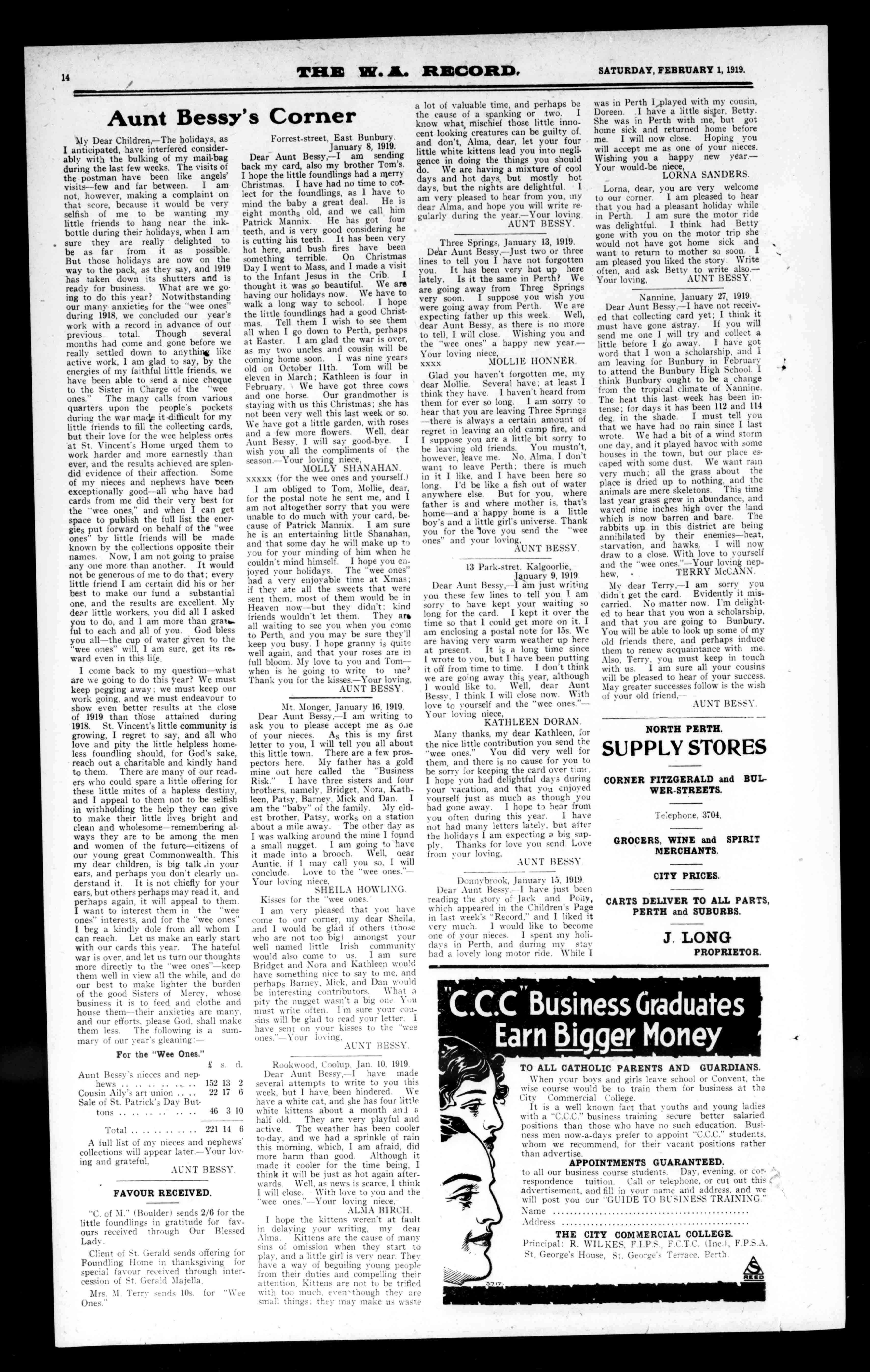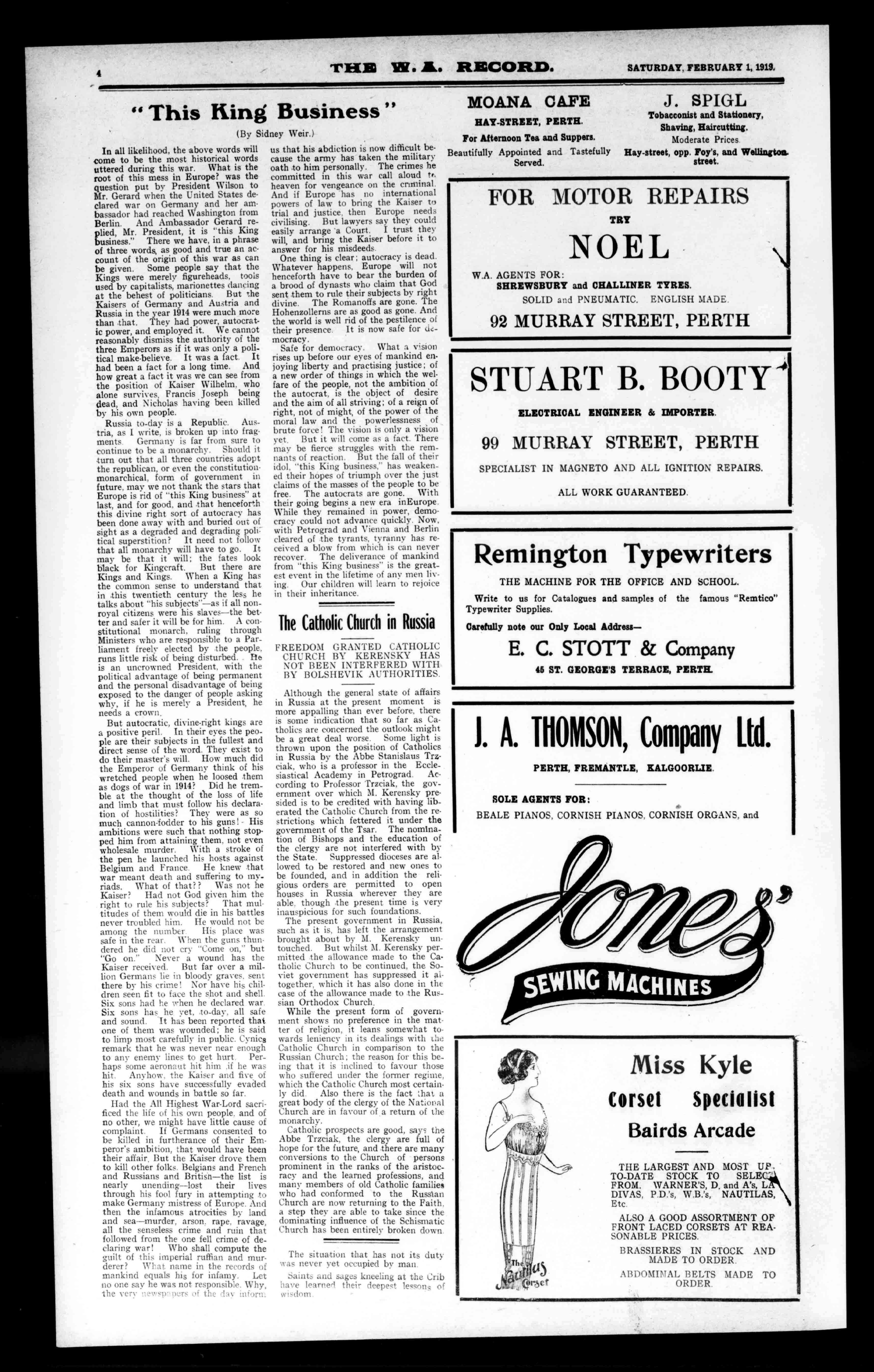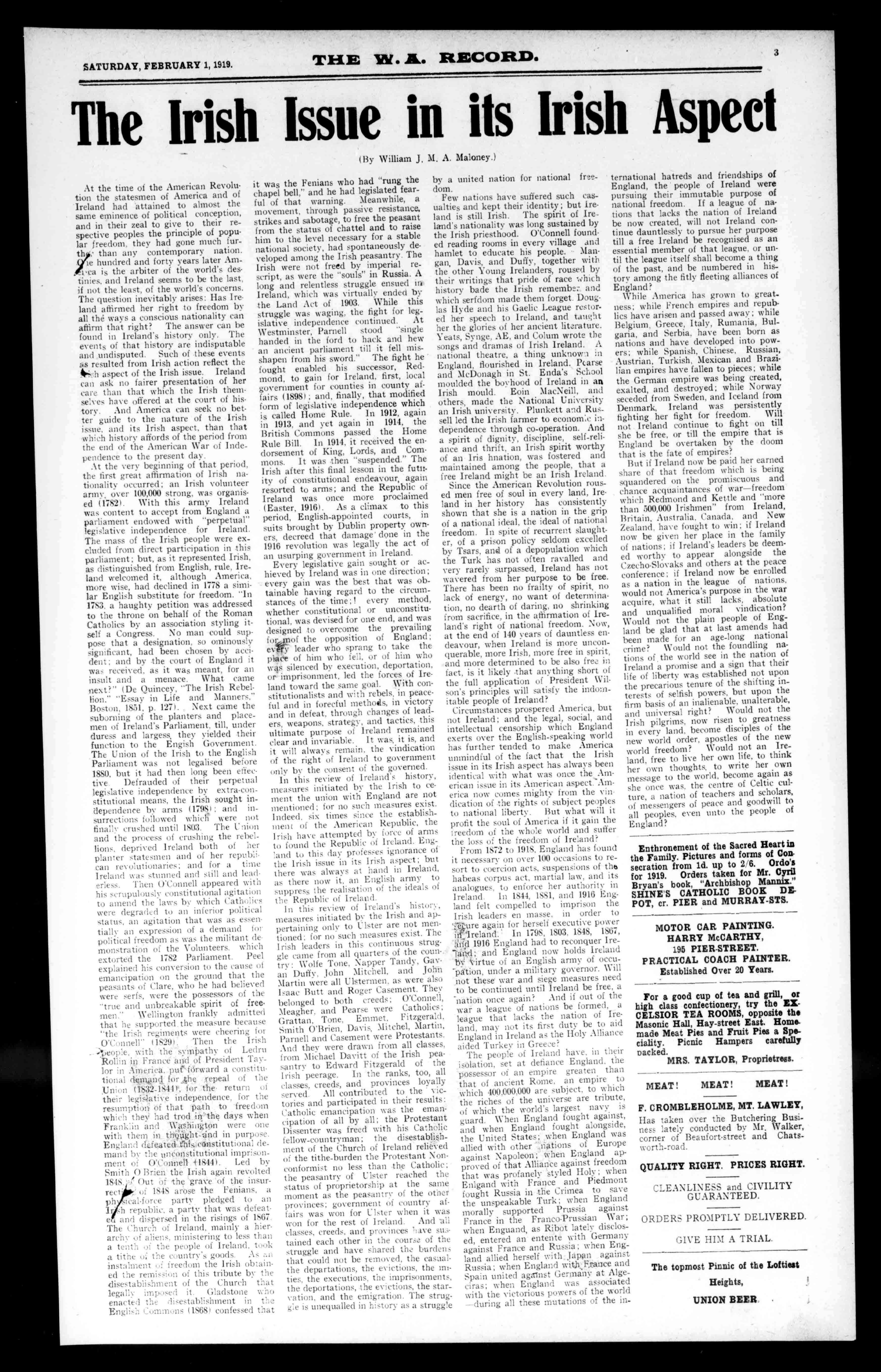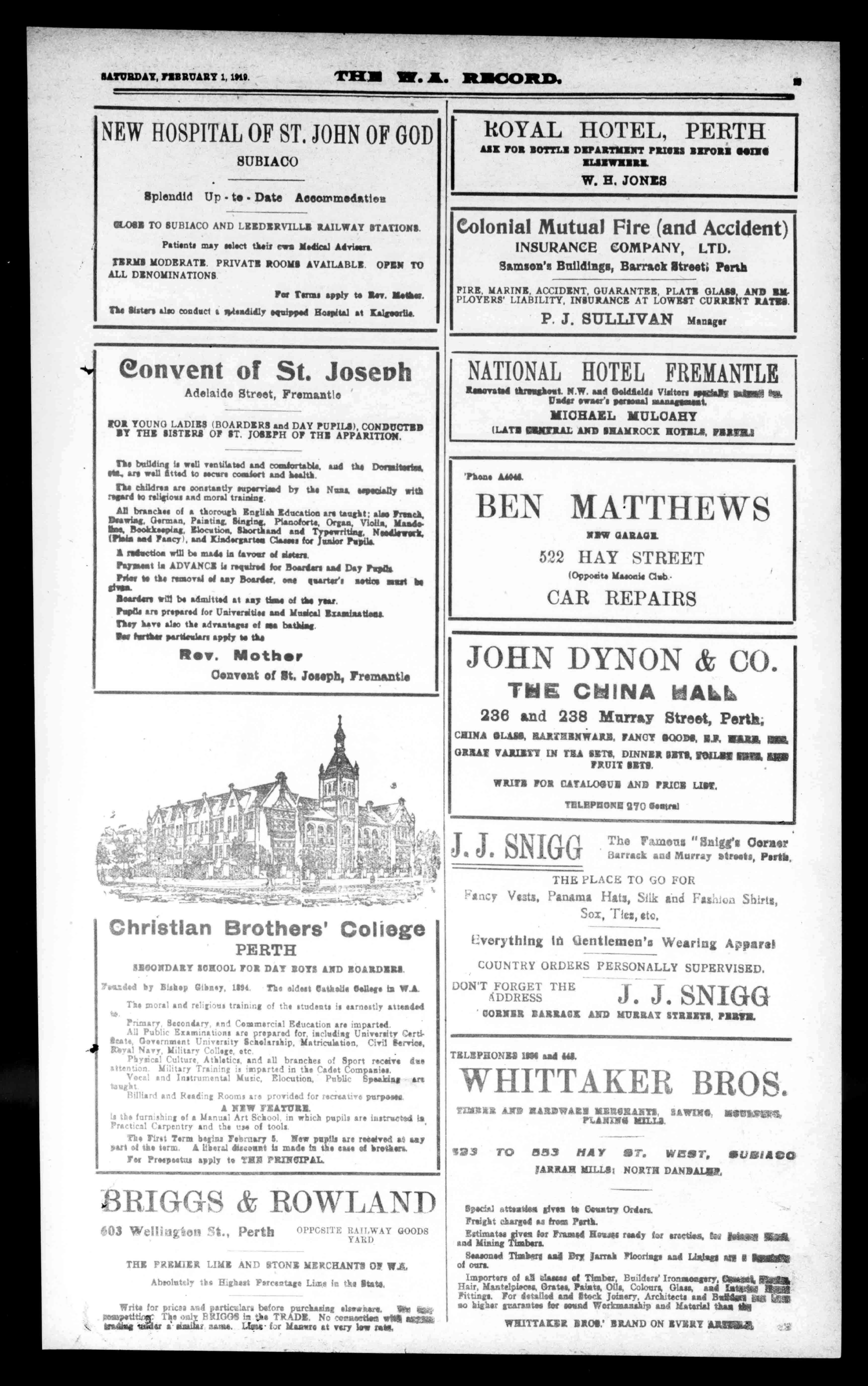 1814. Theeldest(lathalloSoliegeisW.A Themoralandreligioustrainingofthestudentsisearnestly&itemisd Primary,Secondary,andCommercialEducationareimparted. AllPublicExaminationsarepreparedfor,includingUniversityCartiSeat*,GovernmentUniversityScsolsrship,Matriculation,CivilService, LoyalNavy,MilitaryCollege,etc PhysicalCulture,Athletics,andallbranchesofSportreceivedue attention.MilitaryTrainingisimpartedintheCadetCompanies. VocalandInstrumentalMusic,Elocution,PublicEyes/dna,are tengla BilliardandReadingRoomsareprovidedforrecreativepurees* ANEWFIATURI isthefurnishingofaManualArtSChool,inwhichpupilsareinstructedla. PracticalCarpentryandthetiesoftools. ThePiratTermbeginsTelernary5.Newpupilsarereceivedatsay parteltheterm.Aliberaldiscountismadeintheeaseofbrothers. TorPreepostusapplytoTENram:17AL BRIGGS&ROWLAND 603WellingtonSt.,Perth OPPOSITERAILWAYGOODS YARD. THEPREMIERLIMEANDSTONEMERCHANTSOPWit., AbeoluttlytheB.ghastPercentageLimeinticslite* Writsforpliassodparticulars,Worepurchasingelswastors. S tax020114.satting:TheonlyBRIGGSintheTRADE.No',eraeetiorsvagalw Mao a'Atatihsname.Liata-faMalmoatvarylowraft. ROYALHOTEL,PERTH ABEFOEBOTTLEDEPARTMENTPRIMSWOREHMIS ELSEWHERE. W.H.JONIS ColonialMutualFire(andAccident) INSURANCECOMPANY,LTD. Samsea'sBuildiaga,Berm*Street;Perth FIRE,MARINE,ACCIDENT,GUARANTEE,PLATEGLAD'',ANDBJE PLOYERS'LIABILITY,INSURANCEATLOWESTCUR1UBNT P.J.SULLIVANManager NATIONALHOTELFREMANTLE ItimewatedtknsegbievatN.W.sadillegilleldsVisits* "al"II Underinvadeyeresnalmaisaggentegra MIOHAZLilLIILOAHY (LATEWEALANDSHAMROCKKOMI,WWI 'Please BENMATTHEWS NEWGARAGE. 522HAYSTREET (OppositeMaI101114ClubCARREPAIRS JOHNDYNON&CO. THECHINAHALL 236and238MurrayStreet,Perth, CIINA*LASE,EARIn3NWARIS.FANCY*GODS,EAMIAEEL GREATTARIMIN14ASETS,DINNERSITE.FOILmISMIMO FRUITSITS. WRITEFORCATALOGUEANDPRICELIST. TBLEI1SIONE290SeltUlti J.SNIGGTheFamous"Snit('Corner BarrackandMurraystraits,Perak, THEPLACETOGOFOR "*:icyVesta,PanamaHats,SilkandFas.lioaShirts, Sox,'Tics,etc, EverythingIiiGentlemen'sWearingApparel COUNTRYORDERSPERSONALLYSUPERVISED. DON'TFORGETTHE 4DDRESS J.J.SNIGG 001111BARRAGEANDMURRAYSTREETS,PEREZ. TELEPHONESISMsadMS. WHITTAKERBROS. 711113IiikANDRAREWAISILEISIRANTISAWING11110133M6W/t, PLANING=LB C23TO853HAYST.WEST,11001Itiela ARRANMILLS;NORTHDANDALSE, SpodAliittsattesgive*CountryOrders. FreightchargedasfromPerth. EstimatesgivesforFramedBozosreadyforercctias,EwePAWSMa andMiningTimbers. SeasonedTissioecoandDTI)SaabFlooringssad11/41allUPIWORE ofours. Importer,ofaldamsetTimber,Builders'Irortmostan(1.51114111. Hair,Mantelpieces,Grates.Pais*,Oils,Colours,Glass,andWON Fittings.FordetailedandStockJoinery,ArchitectssadBaffinflitt!Air nohigherguaranteeforsoundWorkmanshipandMaterialtheftIII WAITTAINEBROS.'BRANDONEVERT