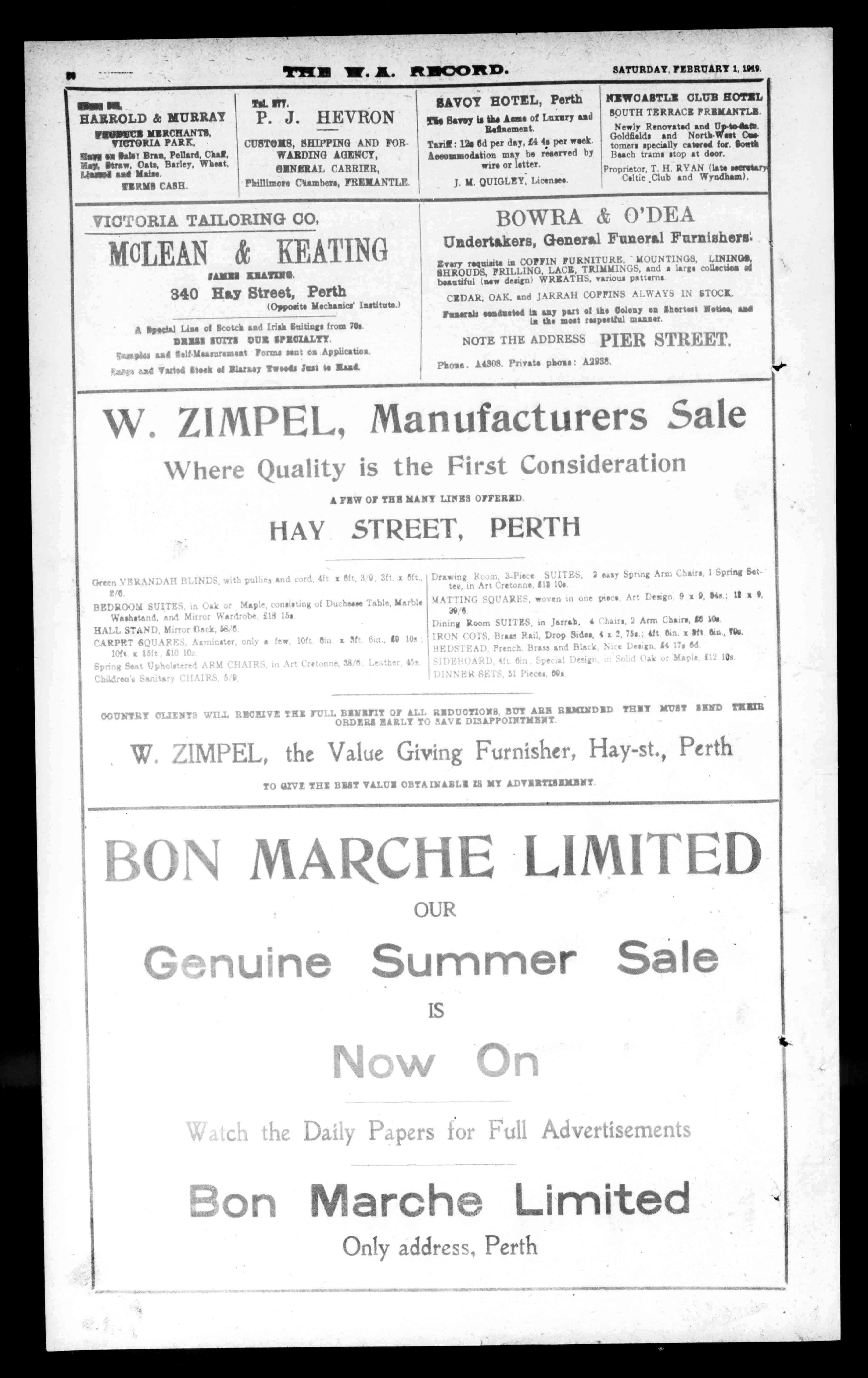 DrawingRoom,3-PieceSUITES,2easySpringArmChairs,1SpringSettee,inArtCretonne,11$10s. MATTINGSQUARES,woveninonepiece.ArtDesign9a9,114e.;11s9, 39,15 DiningRoomSUITES,inJarrell.4Chairs,2ArmChairs,U101. IRONCOTS,BrassRail,DropSides,4x2,Tbs.;eftBin.aeft&aHO. BEDSTEAD,FrenchBrassandBlack.NiTeDesign,1417e6d SIDEBOARD,41;bin .1Oak Maplefl219s. DINNERSETS,51Pieces.091 0017MTRYCLIENTSWILLRlICHIVETHETULLMINIM03ALLREDUCTIONS,BUTARERIURINDIDTHEYMISTSENDTIM ORDERSEARLYTOSAVEDISAPPOINTMENT. W.ZIMPEL,theValueGivingFurnisher,Hay-st.,Perth TOGIVETHEBESTVALUEOBTAINABLEISMTADINIRTESLILINT BONMARCHELIMITED OUR GenuineSummerSale IS NowOn WatchtheDailyPapersforFullAdvertisements BonMarcheLimited Onlyaddress,Perth . ....1,11,44.11111.lNO0111..a
