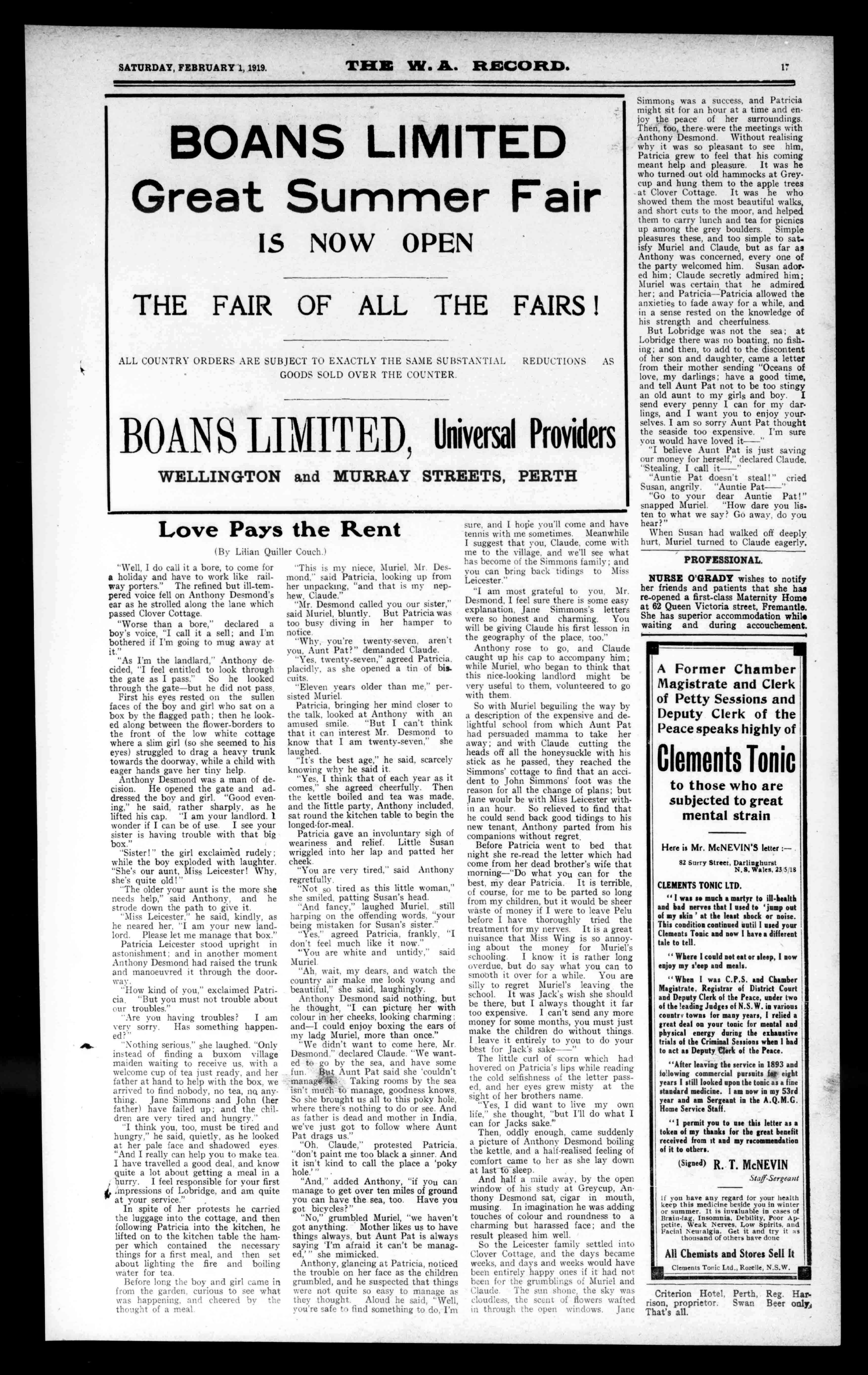 OATES&CO. CoalMerchants 40DYER-STREET,WESTPERTH. AgentsforHowardSmithAlNew. castleCoal,CollieCoal,Charcoal,etc. Specialquotesfortrucklots. Telephone1102. 'Phone1244. WestandWren WINDMILLEXPERTS,PLUMBERS, ETC. OurSpecialties:PumpingEng:nes, Windmills,HydraulicRams,Tanks, BoresandPumps. NotetheAddress 10LAKESTREET,PERTH WHENINPERTHCALLOVERTO TOWERHOTEL CHARLESSTREET,WESTPERTH, AndyouroldfriendErniehandsJuta welcometoyouall. First-ClassResidentialHome OnceaCustomer,AlwaysOne CleanlinessandAttention. E.McGRADE,ProPrie: RINGUP TELEPHONEA-1265WayorNight), ForallkindsofPLUMBING.GAS FITTING,andGALVANISED IRONWORK. MarkDunn 332-334WELLINGTON-ST.,PERTH. LicensedPlumberandDrainer. TotheMetropolitanWaterSupply. SewerageandDrainageDepartment. DairyingUtensils,Baths,BathHeaters, Tanks,andWindmillsMadeand Repaired. GLENORAN NU.10 SCOTLAND'SBEST PureMaltWhisky AsSuppliedUnderContracttothe W.A,HospitalsandGovernmentMedicalDepartment.AlsoRailwayDining CarsandtheLeadingHotelsandClubs throughouttheState. SOLEAGENT Phil.Coyle MOIR'SCHAMBERS. J.B.GEORGE PHARMACIST 542HayStreet, PERTH PRESCRIPTIONSPECIALIST and VETERINARYCHEMIST. HIGHESTQUALIFICATIONS. INTHESTATE. Mr.B. THEOPTICIAN,Means BUCKERIDGE, 7.1.11.0.,D.11.0.A.. FreedomofCityofLoads*. THE ByExam.,London, AskForMr,B. inthe ROYALARCADE OppositeTownHall. --PrintedandPublishedfortheProprietorsofthe"WestAustralianRecord"byThomasSlattery,23Murray. street,Perth. /