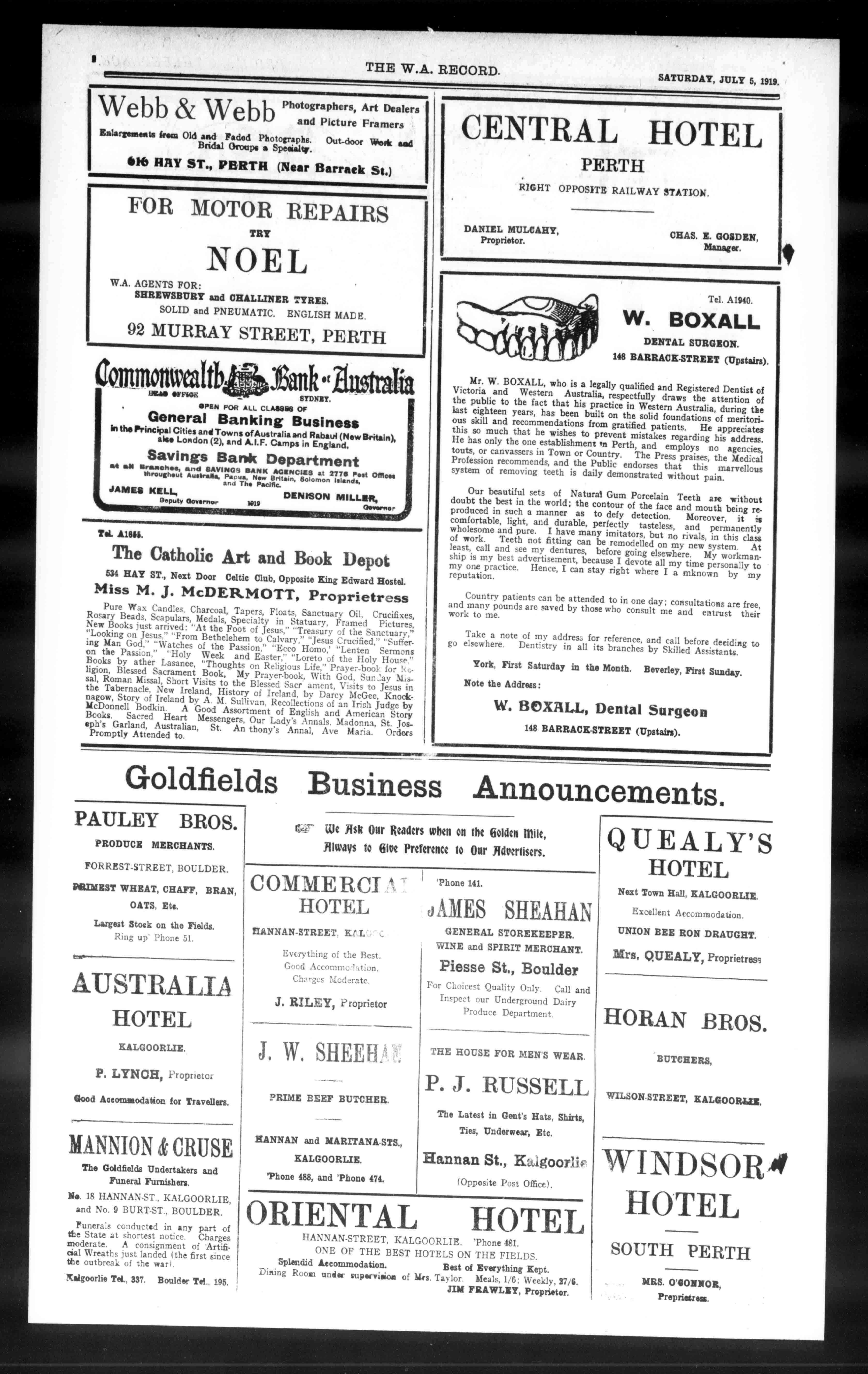 York,FirstSaturdayintheMonth.Beverley,FirstSunday. NotetheAddress: W.BOXALL,DentalSurgeon 148BARRACK-STREET(Upstairs). GoldfieldsBusinessAnnouncements. PAULEYBROS. PRODUCEMERCHANTS. FORREST-STREET,BOULDER. MMUSWHEAT,CHAFF,BRAN, OATS,Etc. LargestStockontheFields. Ringup'Phone31 AUSTRALIA HOTEL KALGOORLIE. P.LYNCH,froprieto: GoodAccommodationforTravellers. MANNIONICRUSE TheGoldfieldsUndertakersand FuneralFurnishers. MD.18HANNAN-ST.,KALGOORLIE, andNo.9BURT-ST..BOULDER. Funeralsconductedinanypartof theStateatshortestnotice.Charges moderate. AconsignmentofArtifi- cialWreathsjustlanded(thefirstsince theoutbreakofthewar). KalgoorlieTel.,337,BoulderTel..195. WeAskOurReaderswhenontheGolden AlwaystoWoePreferencetoOurAdozriisers. COMMERCI HOTEL flANNAN-STREET.KtL EverythingoftheBest. GoodAccommo,1%tion. Cliv.rgcsModerate. J.RILEY,Proprietor J.W.SHEEH. PRIMEBEEFBUTCHER. HANNANandMARITANASTS., KALGOORLIE. 'Phone488,and'Phone474. 'Phone141. dAMESSHEAHAN GENERALSTOREKEEPER. WINEandSPIRITMERCHANT. PiesseSt.,Boulder ForChoicestQualityOnly.Calland InspectourUndergroundDairy ProduceDepartment. THEHOUSEFORMEN'SWEAR. P.J.RUSSELL TheLatestinGent'sHats,Shirts, Ties,Underwear,Etc. HannanSt.,Haigoorlis (OppositePostOffice). ORIENTALHOTEL HANNAN-STREET,KALGOORLIE.'Phone481. ONEOFTHEBESTHOTELSONTHEFIELDS. SplendidAccommodation. BestofEverythingKept. DiningRoostundersupervisionofMrs.Taylor.Meals,1/6;Weekly,27/6. JIMFRAWLEY,Proprietor. QUEALY'S HOTEL NextTownHall,KALGOORLIE. ExcellentAccommodation. UNIONBEERONDRAUGHT. Mrs,QUEALY,Proprietress HORANBROS. BUTCHERS, WILSON-STREET,KALGOORIII. WINDSOM HOTEL SOUTHPERTH MRS.0'4101010R, Proprietress.