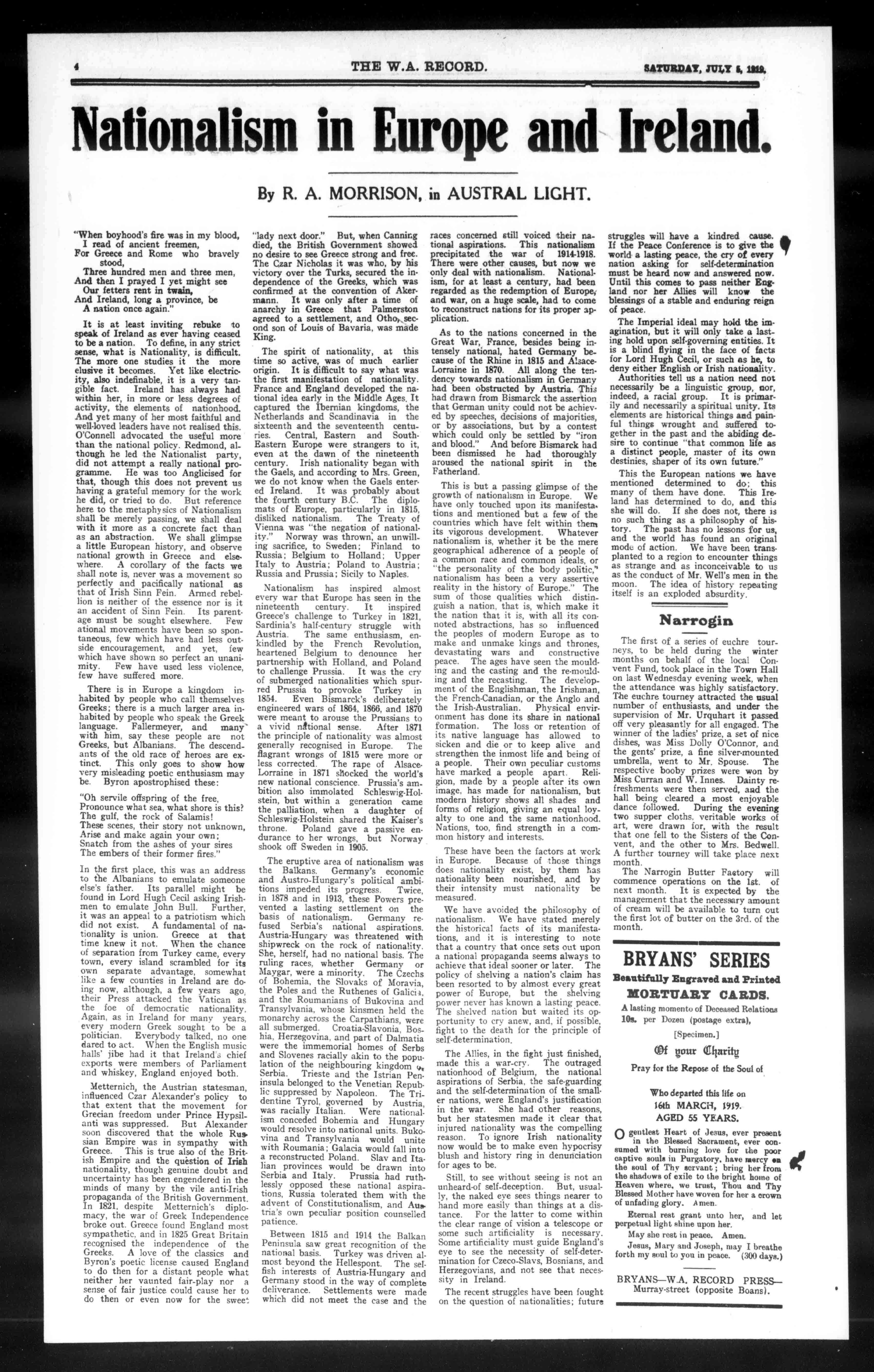 Itisatleastinvitingrebuketo speakofIrelandaseverhavingceased tobeanation.Todefine,inanystrict sense,whatisNationality,isdifficult. Themoreonestudiesitthemore elusiveitbecomes.Yetlikeelectric. ity,alsoindefinable,itisaverytangiblefact.Irelandhasalwayshad withinher,inmoreorlessdegreesof activity,theelementsofnationhood. Andyetmanyofhermostfaithfuland well-lovedleadershavenotrealisedthis. O'Connelladvocatedtheusefulmore thanthenationalpolicy.Redmond,althoughheledtheNationalistparty, didnotattemptareallynationalprogramme.HewastooAnglicisedfor that,thoughthisdoesnotpreventus havingagratefulmemoryforthework hedid,ortriedtodo.Butreference heretothemetaphysicsofNationalism shallbemerelypassing,weshalldeal withitmoreasaconcretefactthan asanabstraction.Weshallglimpse alittleEuropeanhistory,andobserve nationalgrowthinGreeceandelsewhere.Acorollaryofthefactswe shallnoteis,neverwasamovementso perfectlyandpacificallynationalas thatofIrishSinnFein.Armedrebellionisneitheroftheessencenorisit anaccidentofSinnFein.Itsparent. agemustbesoughtelsewhere.Few ationalmovementshavebeensospontaneous,fewwhichhavehadlessoutsideencouragement,andyet,few whichhaveshownsoperfectanunanimity.Fewhaveusedlessviolence, fewhavesufferedmore.