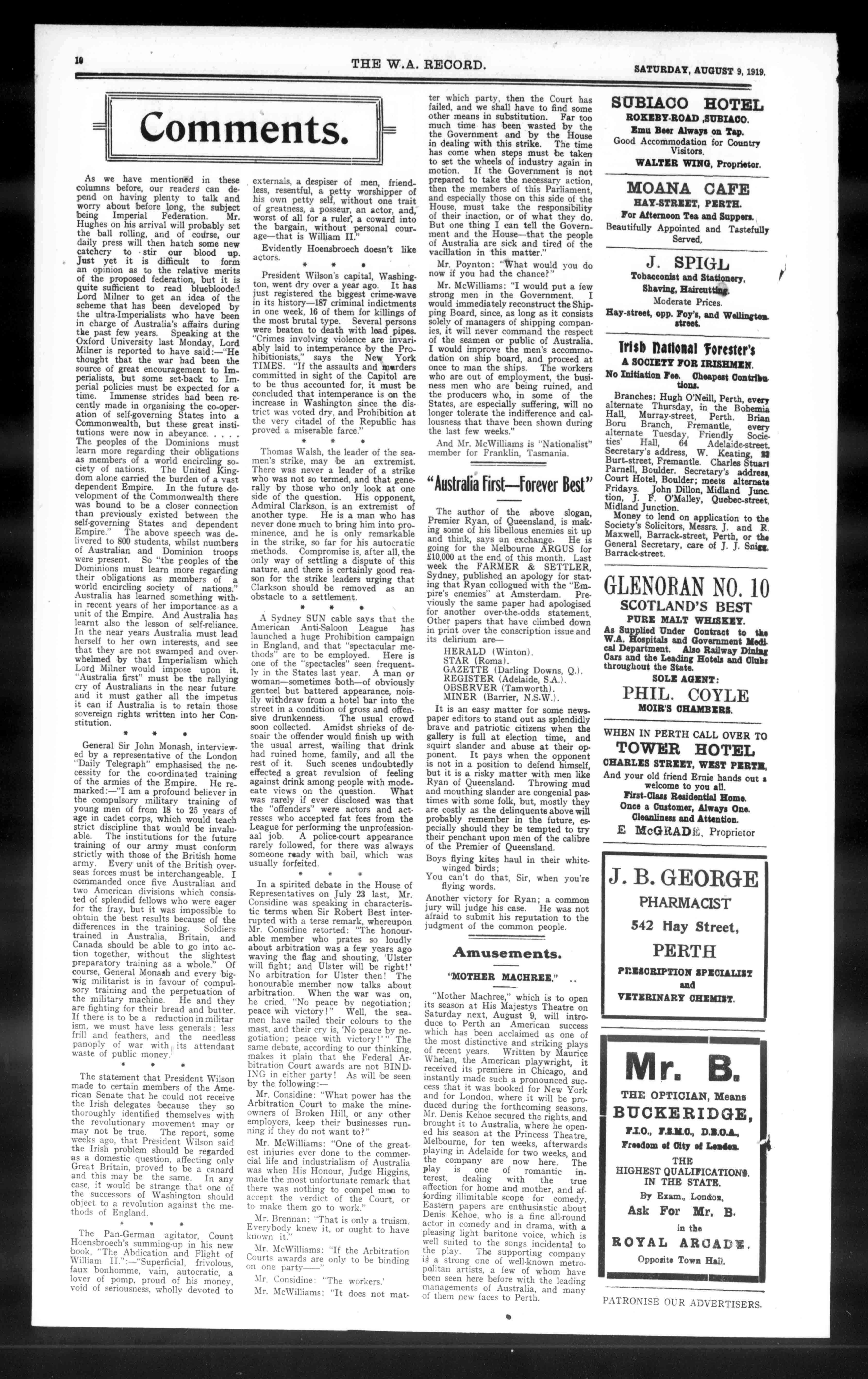 PRICE: THREEPENCE. RegisteredattheG.P.O..Perth,firTransmissionbyPestesaNewspaper. THEORGANOFTHEARCHDIOCESEOFPERTH. No.1933(NewSeries). SATUIRDAY,AUGUST9,1919. VOL.XLW. "GIBSONIA"UNDERWEAR ForLADIES,GENTLEMEN andCHILDREN IsHygienic,Serviceable,Comfortable,ReasonableinPrice andisManufacturedinAustraliaby FOY&GIBSONPty.Ltd. UNIVERSALPROVIDERS,PERTH. 111 Over3,000,000since1876. ThatistheMagnificentSalesRecordoftheWorldFamous WHITESEWINGMACHINES. EachoftheseMachinesisBuilttoLastaLifetime. NotetheSpecialFeatures.,-, DustProofNeedleandPresserEar. BallBearingsThroughout. SelfThreadingShuttle. AlwaysabsolutelySilentandSmoothRunnilig. AutomaticRelease. BeltDoesNorSlipOff. ASKVSTORADEMONSTRATION. FULLPARTICULARSMrs&FbRICIESGLADLYSUPPLIED. WILLIAMSANDOVER&CO.,HaySt.,PERTH YOUCANNOT Butthereisnoreasonwhyyoucannothavethehest glasses,andthemostexperteyeadvice. HAVE BecauseofourPhysiologicalReadings,weareableto explainjustwhatiscausingyourtrouble. DRYIHING.ASSOCIATEDOPTICIANSCO. W.J.FIST, PnysiologistandConsultingOptician.Manager. 20-23BAIRD'SARCADE,PERTH. Phone-3861Healy's TailorsandMen'sFurnishers 028HayStreet,Perth AND Phone TO Healy'sCorner,Fremantle