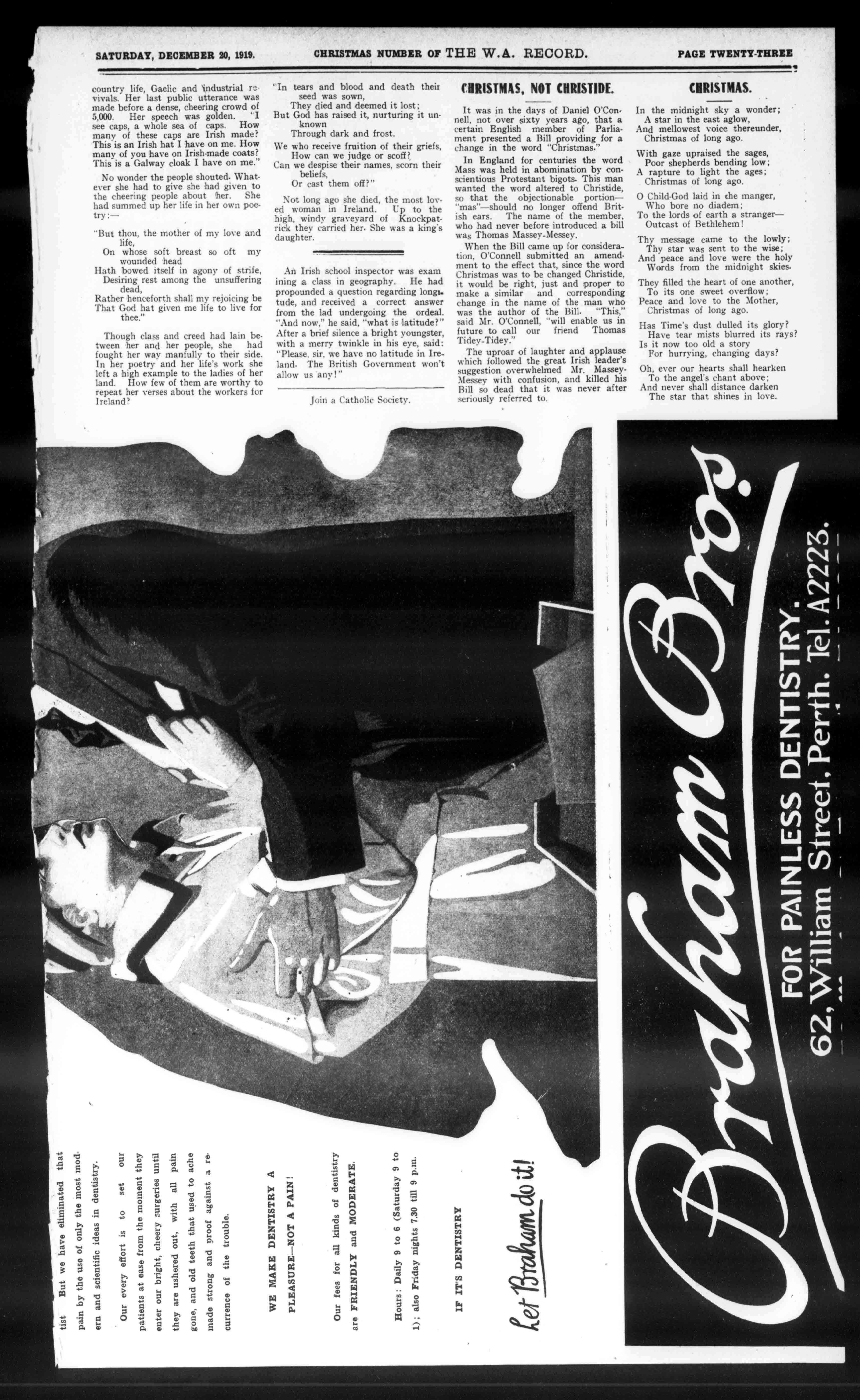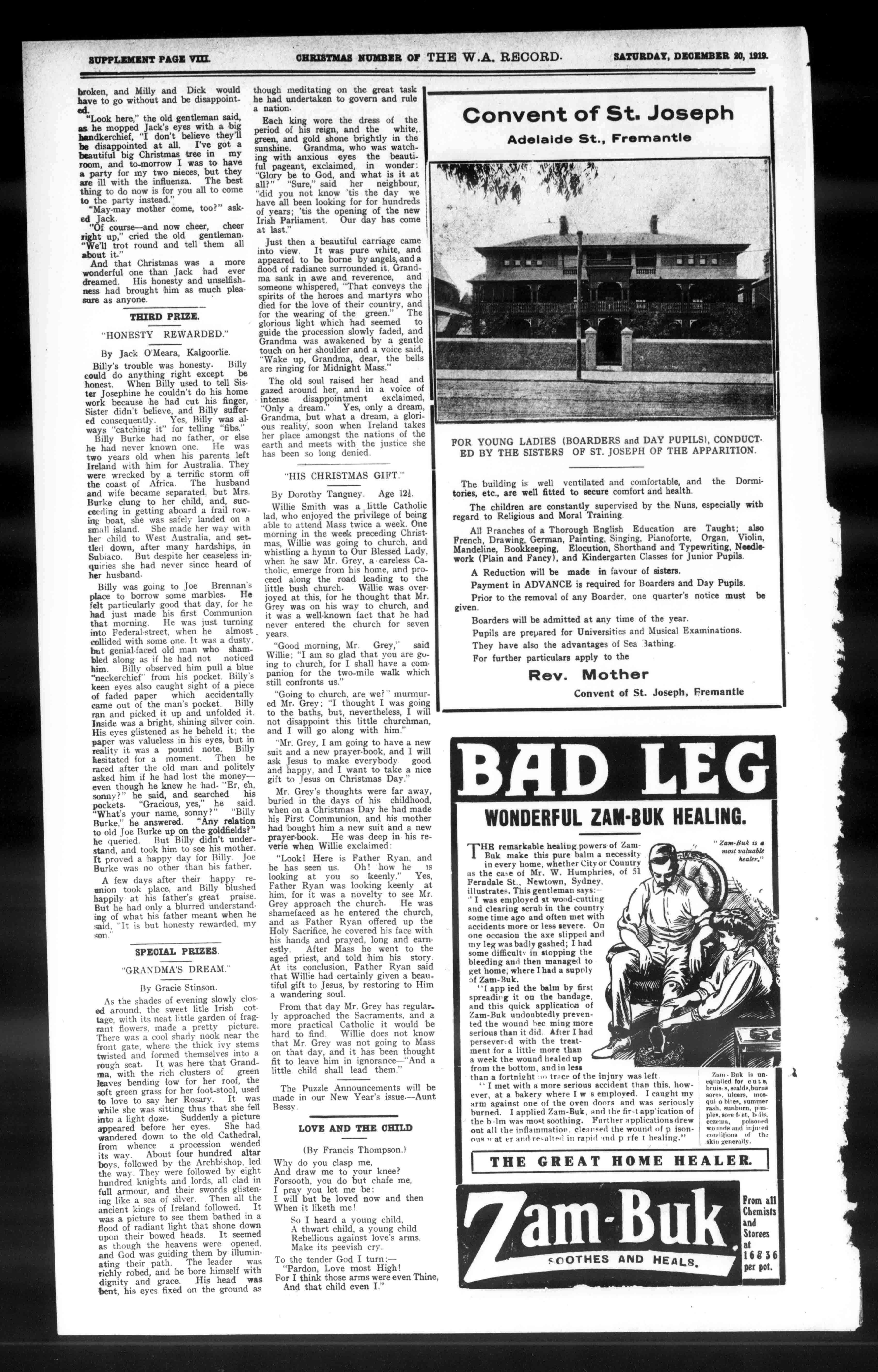 SATURDAY,DECEMBER20,1919. CHRISTMASNUMBERorTHEW.A.RECORD. SUPPLEMENTPAGEM. FOY&GIBSON'S XmasToyFair. OurTOYFESTIVALisNOWOPEN.ItisaFairylandforChildren DOLLS,TOYS,GAMES,andNOVELTIESareDisplayedinLavishProfusion WeareSpeciallyFeaturingAUSTRALIAN-MADETOYS.Theyare StronglyMade,andincludemanyUsefulaswellasAttractiveNovelties. ALargeVarietyofPRIZEandPRESENTATIONBOOKS, XMAS CARDSandCALENDARSarejusttohand,Thesearebeingofferedat XmasToyFairPrices. OurNumerousDepartmentsareTeemingwithSeasonableandUseful PRESENTS,atPriceswhicharewithinReachofAll. OurIllustratedXmasPriceListofTOYS,BOOKS,FANCYGOODS, Etc..willhePostedFreetoanyAddress. HogstreetandSt.George'sTerrace, PERTH. *EVERYPERSONINAUSTRALIA isaskedtoassistinthegreatcausebyspecifyingAUSTRALIAN - MADE withtheirorders. ReadersofItIfW.A.RECORD arespeciallyaskedtostudytheBusinessAnnouncementsonthisPage,and toPatroniseourAdvertisersAccordingly sirWhenwritingmentionyou sawtheAdvt.intheRECORD please. LOP GARDEN HOSE HoseEconomy. ThereisnoGardenHosethat givessuchserviceasthe "Dunlop."Yearsofwearand satisfaction,withoutbursts andkinking,havegainedthis hoseanenviablereputation foreconomyanddependability.It'sthefinequalityof materialsandworkmanship putintoitthatensuressuch results.Whenyouwanthose forhardservice,buy"Dunlop,' it'seasilythemosteconomical anddurablethatyoucanbuy. ObtainableallLeadingStores. ** DUNLOPRUBBERCO. ALLSTATES ANONN.Z. SAYERS&MthOY, HouseFurnishers, 96and98WilliamStreet, DOUBLEBEDSTEADS,from £3150 OAKSIDEBOARDS,from £7100 OAKDININGSUITES,6Pieces £8100 (Drop-in-Seats) COMBINATIONBEDSTEADS(2ft.6in.r £2100 Oft. £2150 KITCHENDRESSES £450 KITCHENSAFES £126 KITCHENTABLES(4ft.6in.x2ft.6in 76 JUSTLANDEDSHIPMENTOFBAMBOOBLINDS,ALLSIZES. CanvasBlindsmadeto Order. SendSizeforQuotation. TelephoneA4460. IfyouwereaChild you'dwant Mills6ware's MKARROWROOTBISCUITS ThenOrderaPackageforyourlittleonesnow. PureMilk,FreshDaily,fromalocaldairy,isusedinMILLSand WARE'SMILKARROWROOTBISCUITS. Trythemyourself. GiftCouponineachPackage.Twenty-fiveexchangedforaHandsome Present. AllGrocers.