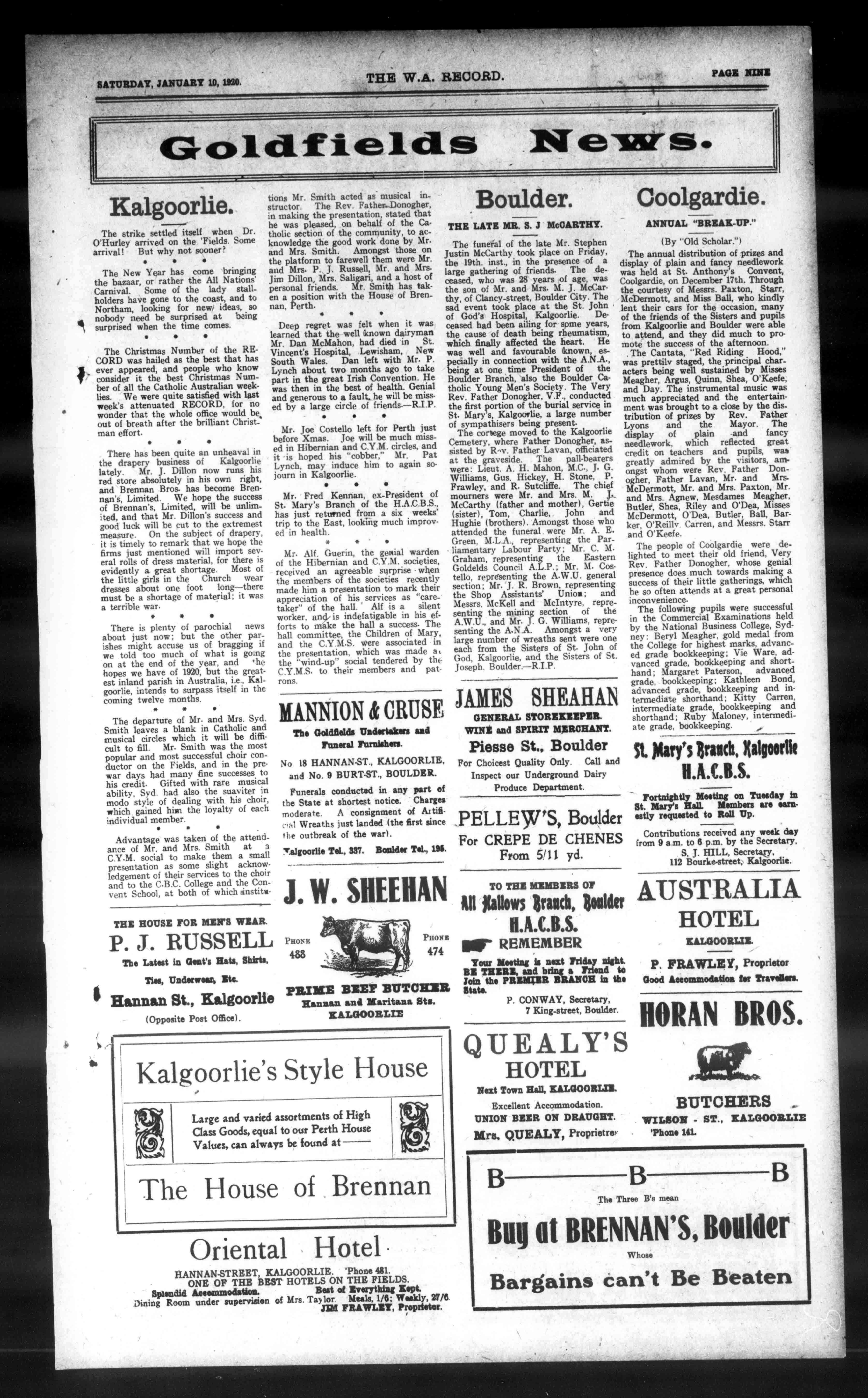 Irishpaperstohandreportthe deathandfuneralofthelateMr.BernardFinnigan.TheCeltwrites:"It iswithsincereregretwehavetoannouncetheabovesadevent,which tookplaceathisresidenceonOctober 22nd.ThedeceasedpassedawayfortifiedbytheritesofourHolyMother Church.TheRev.P.Lynch,P.P., andRev.FatherKelly,CC.,werein constantattendanceuntiltheend. Thefuneraltothefamilyburial. ground,Ballinagh,wasoneofthelargestwitnessedinthelocalityformany years,andwasindeedastrikingtestimonyofthehighesteemandgreatrespectinwhichdeceasedwasheld.The CavanUrbanCouncil,theO'Rahilly MemorialCommittee,CumannnaM Bann,andDistrictCouncilpassedresolutionsofsympathywiththerelativesofthelateMr.Finnigan.The chairmanoftheCavanUrbanCouncil referredtothedeceasedasamost conscientiousandamostuprightman, andMr.McGuinesssaidhehadknown thelateMr.Finniganfortwentyyears, andamoreuprightmanhehadnever comeincontactwith.Hewasabsolutelystraight-forward,andaboveall thingsindependent.Nomancould "touch"him.Messrs.McEatee,McCarren,O'Reilly,Flynn,andSmithassociatedthemselveswiththeresolution,whichwaspassedinsilence.DeceasedwasfatheroftheRev.P.P. Finnigan,Dardanup,WA.,andbrother-in-lawofthelateRevs.P.O'Connell,P.P.,Corlough,andDanielO'Connell,UshawCollege.Ninerelatives besidestheabovementionedwereordainedtothepriesthood,fourfor homeandfiveforforeignmissions. Thechiefmournersatthefuneral wereMr.J.Finnigan(Yarrymore), brother;PeterJamesRoland,Peter andCharlesFinnigan;C.andP.Fitzpatrick,Dr.J.Magauran(nephews); Revd.C.Finnigan,C.C.,Dr.LouisFinnigan,Rev,P.Lynch,P.P.,Rev.F. Lynch,C.C.,Rev.P.O'Reilly,BA., etc.-R.I.P.