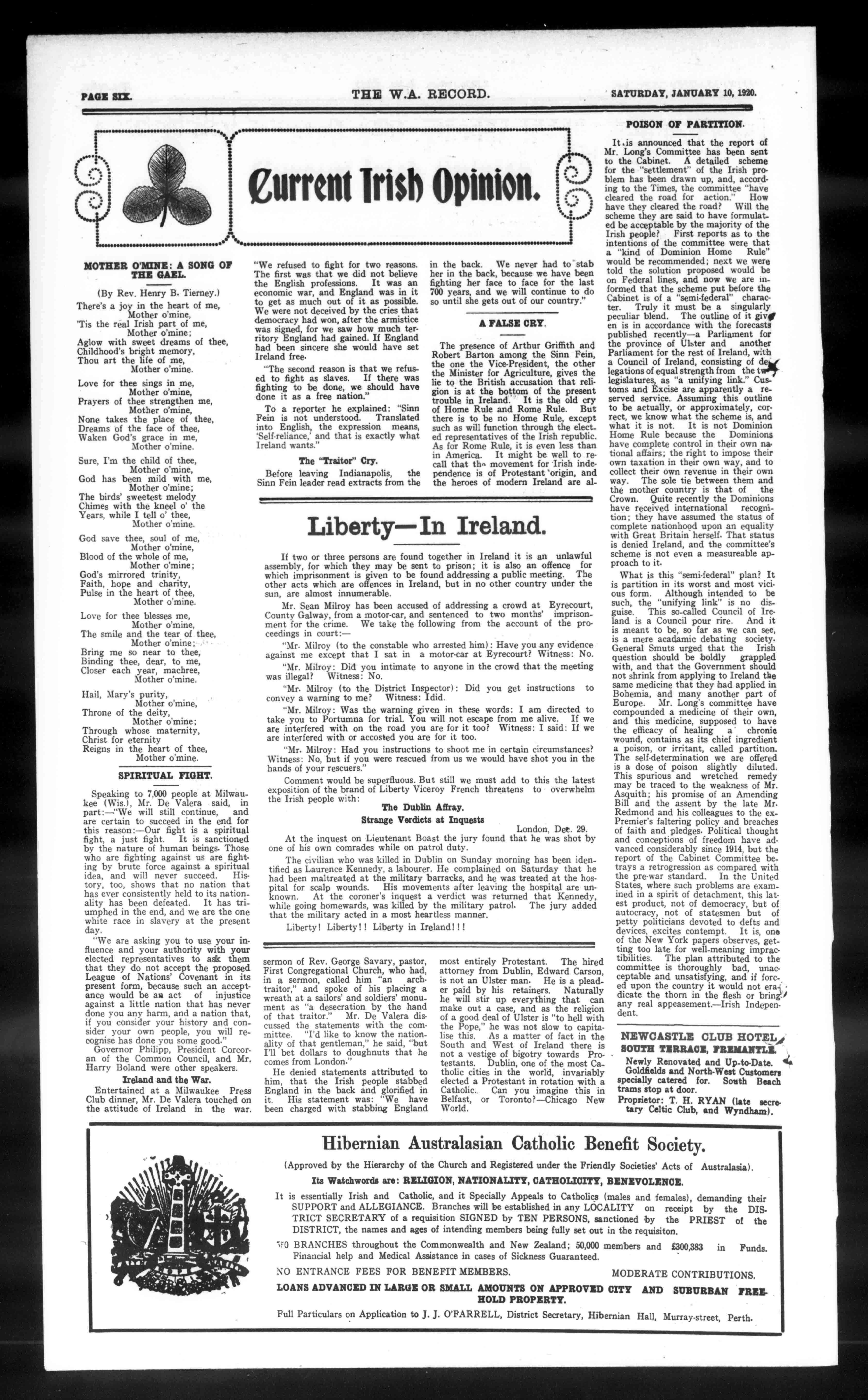 SenttoIrelandtopersuadetheIrishpeopletoenlistintheBritish ArmyandgofighttheGermans,hefindsDublinfullofBritishtroops.and says:Whythe-well,whydon'ttheseBritishsoldiersgoandfightthe Germans?Isupposehefelttheridiculousnessofhiserrand;hewastoask Irishmentogo.fightforself-determinationforsmallnationsontheContinent,whileBritishtroopswerebeingkeptamongIrishmentopreventthem fromsecuringself-determinationforIreland!Thesituation,inaword,was quiteChestertonian.Hehadtheotherendofthemattershovedinto hisowneyes.And,likeawiseman,hemadethebestofit.Heeven writesabookaboutit.AndinthatbookhetellsEnglishmensomethings whichitistheirdutytoknow.Ofourpoliticianshesays:"TheydiscussedtheIrishQuestion;buttheyneverseriouslycontemplatedtheIrishAnswer."Andheremarks:"ItisnotmerelythatEnglandoughtnottorule Ireland,butthatEnglandcannot."Thathasbeentrue,behistorywitness, forhundredsofyears. Itistruernowthanatanytimeinthepast,becauseIrishmen,with completejustice,nolongerbelieveEngland'sword,beitgivenneversosol- emnly.Theydonottrustus.AndonthedaythatMr.Asquithhungup theHomeRuleAct-hangeditupindeedtillitwasdead-onthatdayall IrishmenfeltthatnoconfidencecouldbeplacedinanyEnglishpledge. HearMr.Chesterton:"Inthepoliticalbargain.withtheEnglish,theIrish simplythinktheyhavebeencheated.TheythinkHomeRulewasstolen fromthemafterthecontractwassealed;anditwillbehardforanyoneto contradictthem.If'leroileveult'isnotasacredsealonacontract,what it?"WhocanthinkofthatfatalblunderofpoorMr.Asquithwithouta feelingofpityforIreland--andperhapsforhim?Hewalksaboutourland lonely,hewhowasoncetheleaderoffollowers,andwearsroundhisnecka scroll,whichmen"Willhangon scrollbearingjustthree words:HeBetrayedIreland. TheIrishpeopleweretaughttotrustMr.Asquith,tohopeintheLib- erals.Thattrustandhopearedead.AnddeadisalltrustinEngland."I willsayhere,onceforall,"saysMr.Chesterton,"thehardestthingthatan EnglishmanhastosayofhisimpressionsofanothergreatEuropeanpeo- ple;thatoverallthose(Irish)hillsandvalleysourwordiswind,andour bondiswastepaper."Andhesaysfurther:"Itisuponanyargument,an astoundingthingthatKing,Lords,andCommonsofagreatnation shouldrecordinitsstatute-bookthatalawexists,andthenillegallyreverse itinanswertothepressureofprivatepersons.Itis,andmustbe,forthe peoplebenefitedbythelaw,anactoftreason,eveninthesenseoftreachery andtrickery.Wheretheywerewrong,Iregrettosay,wasintalkingofit asifitweretheonesupremesolitaryexamleofsuchtrickery;whenthe wholeofourpoliticswerefullofsuchtrioks."AndiftheIrishpeople,after allourtreacherytowardsthem,havenotcalledusBolshevists-thelast andfashionableandfoolishtermofabuse-itisbecausetheyareagenerous peopleanddonotwanttohurtthefeelingsoftheBolshevists.ButImust endmynoticeofthisnoteworthybook.SofarasIcangatherfromhis pages,Mr.ChestertonmadenorecruitsinIreland.Ihopehewillmake someinEngland.HisbookmayopentheeyesofmanyEnglishmen,born blindwhereIrelandisconcerned-asI.was.SometimesIthinkthatifIre- landhadunderstoodEnglandbetter,itwouldhavebeenforhergood.We areapeopleofcompromiseandgivebyinstalments.ToIrelandIwould say:TakeallyoucangetfromEnglandandtellheritisaninstalment andameresteptowardsmore,untilyouobtaineverything.Andbearin mindthatthemenwhowillnotwillinglygiveIrelandjusticearethemen whodreadthatEnglandwilldemandjustice.Theyarethefolkwhofear libertyeverywhere,becauselibertyforotherswouldcurtailprivilegesfor themselves.Andinwhatcountryisthegoverningclassunselfish? --PETERX.WILDE. TelephoneA4395. HOLDWAYcFCo.