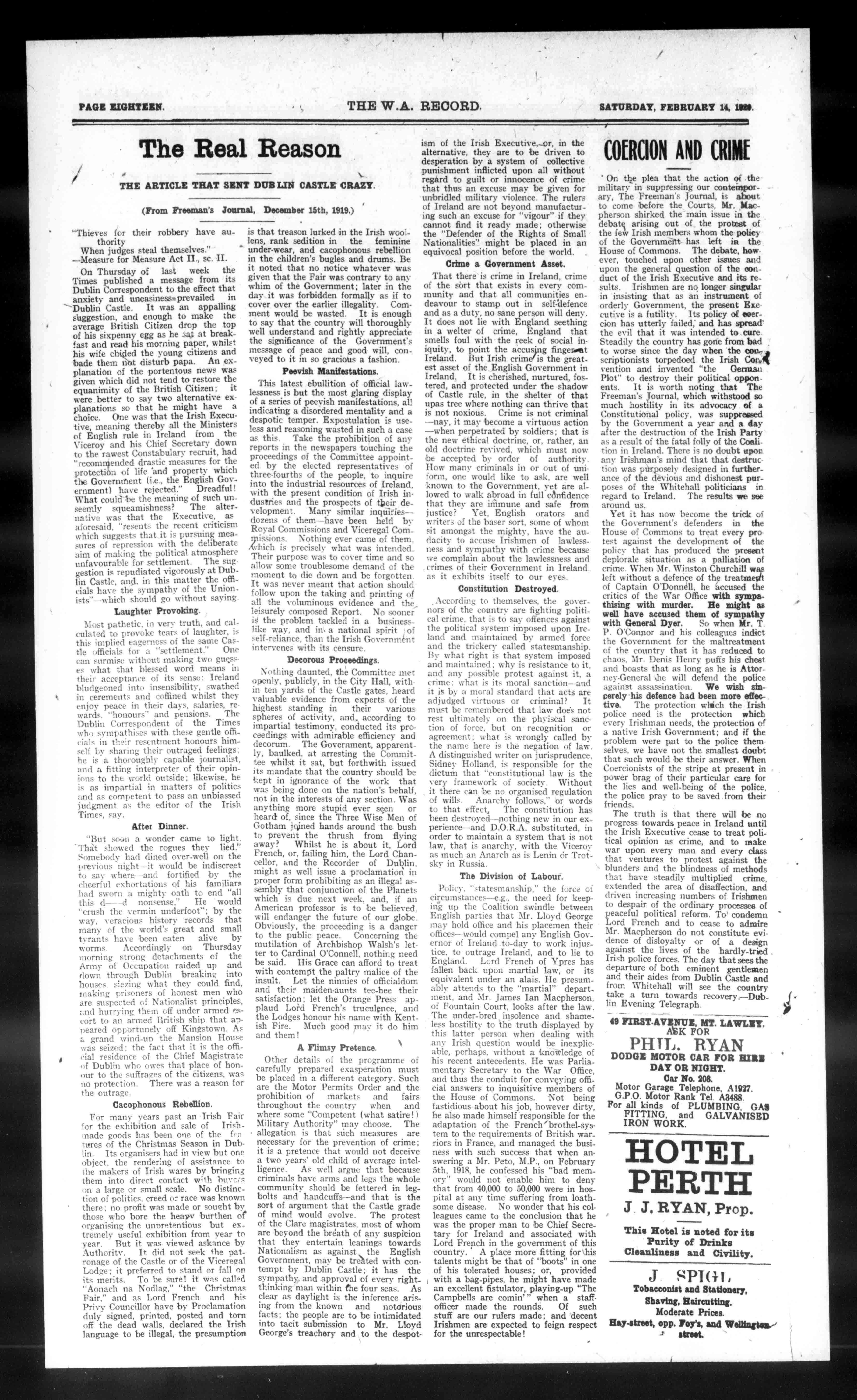 "Overextensivedistrictsofthe SouthandWestfairsandmarketsare prohibitedandeconomiclifecrippled. AnorderwhichcameintoforceonNovember15th,prohibitsthepossession ofmotor-carsandmotor-cycleswithoutapolicepermit.On.theother hand,driversofmilitaryvehicleshave beeninstructed(soitwasannounced inaDublinPoliceCourtinNovember) nottostopiftheyranovera'civilian. Theinevitableeffectofsuch aregimeistoprovokeacertainnumberofseriouscrimesofviolence,a numberonlylimitedbytheself-restraintofapeoplewithwhomreligioussanctionsarepeculiarlystrong.Itamountstothis,thattheGovernmentmakeswaruponthepeople-a dastardlymilitaryforceagainstacivilianpopulation.""Itisnousetalkingaboutlibertywith"-thoseresponsibleforsuchawar.Trulyitisnot. "LetGodariseandletHisenemiesbe scattered."-LondonCatholicTimes.