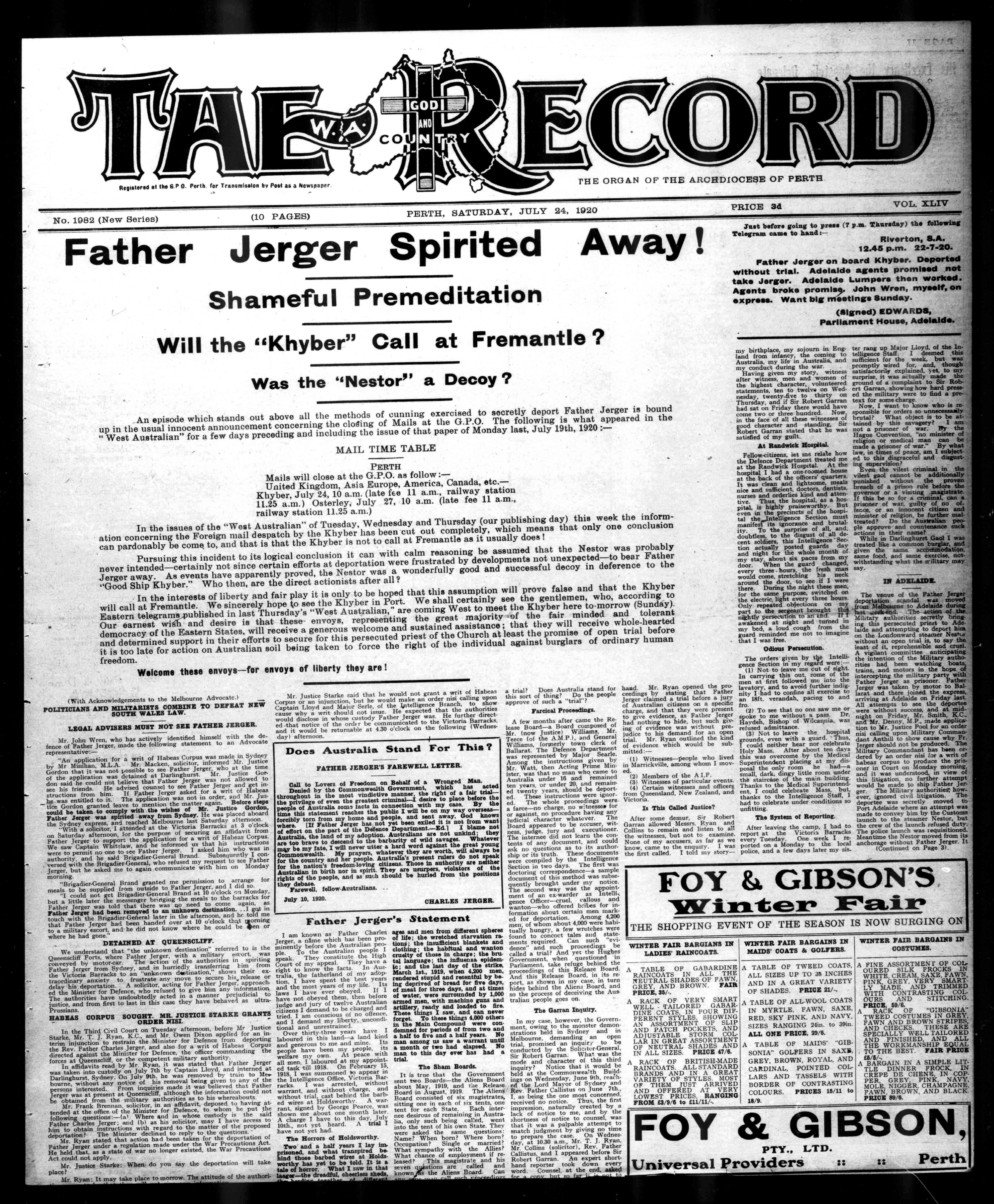 AnepisodewhichstandsoutaboveallthemethodsofcunningexercisedtosecretlydeportFatherJergerisbound upintheusualinnocentannouncementconcerningtheclogingofMailsattheG.P.O.Thefollowingiswhatappearedinthe "WestAustralian"forafewdaysprecedingandincludingtheissueofthatpaperofMondaylast,July19th,1920:MAILTIMETABLE