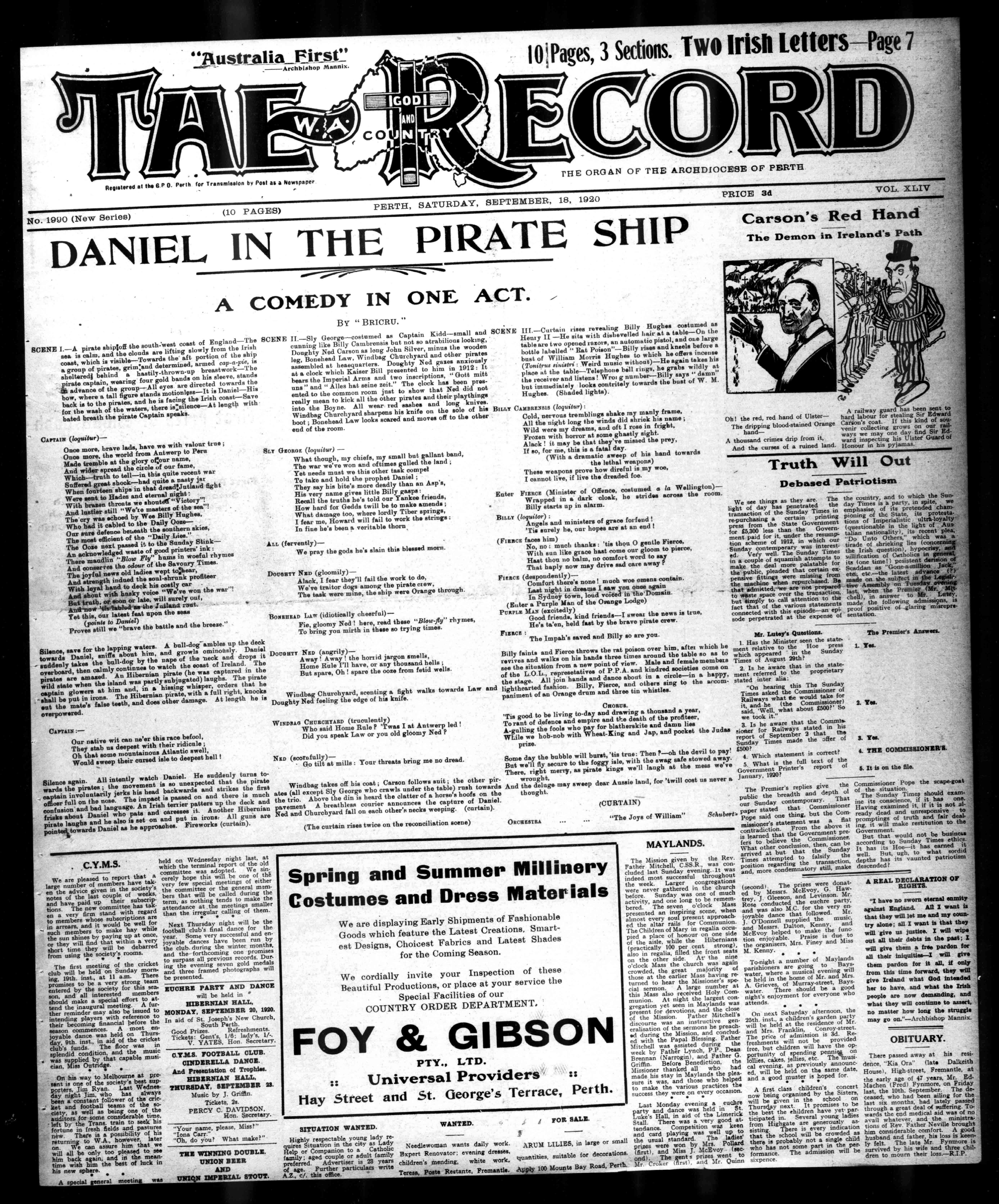 aspiratekingswe'lllaughatthemesswe've wrought, AndthedelugemaysweepdearAussieland,for'twillcostusnevera thought. ORCHESTRA (CURTAIN) "TheJoysofWilliam" Schubert C.Y.M.S. Wearepleasedtoreportthata largenumberofmembershavetakentheadvicegiveninthesociety's notesofthelastcoupleofweeks, andhavepaiduptheirsubscriptions.Thenewcommitteehastakenaveryfirmstandwithregard tomemberswhosesubscriptionsare inarrears,anditwouldbewellfor suchmemberstomakehaywhile thesunshinesbypayingupatonce, ortheywillfindthatwithinavery shorttimetheywillbedebarred fromusingthesociety'srooms. Thefirstmeetingofthecricket clubwillbeheldonSundaymorn. ing,19th.inst.,at11a.m.There promisestobeaverystrongteam enteredbythesocietyforthissea. son,andallinterestedmembers shouldmakeaspecialefforttoattendtheinauguralmeeting.Afurtherremindermayalsobeissuedto intendingplayerswithreferenceto theirbecomingfinancialbeforethe seasoncommences.AmostenjoyabledancewasheldonThursday,9th.inst.,inaidofthecricket club'sfunds.Thefloorwasin splendidcondition,andthemusic wassuppliedbythatcapablemusician,MissOlitridge. OnhiswaytoMelbourneatpresentisoneofthesociety'sbestsupporters,JimRyan.LastWednesdaynightJim,whohasalways beenaconstantfollowerofthecricketandfootballteamsofthesociety,aswellasbeingoneofthe auditorsforsomeconsiderabletime, -leftbytheTrans.traintoseekhis fortuneinfreshfieldsandpastures new.Thereisapossibilityofhis returningtoW.A.,however,later on.Wecanassurehimthatwe willallbeonlytoopleasedtosee himbackagain,andinthemeantimewishhimthebestofluckin hisnewsphere. Aspecialgeneralmeetingwas heldonWednesdaynightlast,at whichtheterminalreportoftheold committeewasadopted.Wesincerelyhopethiswillbeoneofthe veryfewspecialmeetingsofeither thecommitteeorthegeneralmembersthatwillbecalledduringthe term,asnothingtendstomakethe attendanceatthemeetingssmaller thantheirregularcallingofthem. NextThursdaynightwillbethe footballclub'sfinaldanceforthe year.Someverysuccessfulandenjoyabledanceshavebeenrunby theclub,duringthewintermonths, andtheforthcomingonepromises tosurpassallpreviousrecords.Duringtheeveningsevengoldmedalsandthreeframedphotographswill bepresented. EUCHREPARTYANDDANCE willbeheldin HIBERNIANHALL, MONDAY,SEPTEMBER20,1920. InaidofSt.Joseph'sNewChurch, SouthPerth. GoodPrizes. Refreshments. Tickets:Gent's,1/6:lady's,1/-. V.YATES,Hon.Secretary. C.Y.M.S.FOOTBALLCLUB. CINDERELLADANCE. AndPresentationofTrophies. HIBERNIANHALL, THURSDAY,SEPTEMBER23. MusicbyJ.Griffin. Tickets,2s. PERCYC.DAVIDSON, Hon.Secretary. "Yourname,please,Miss?" "IonaCarr." "Oh,doyou?Whatmake?" THEWINNINGDOUBLE. UNIONBEER AND UlmNIMPERIALSTOUT. SpringandSummerMillinery CostumesandDressMaterials WearedisplayingEarlyShipmentsofFashionable GoodswhichfeaturetheLatestCreations,SmartestDesigns,ChoicestFabricsandLatestShades fortheComingSeason. WecordiallyinviteyourInspectionofthese BeautifulProductions,orplaceatyourservicethe SpecialFacilitiesofour COUNTRYORDERDEPARTMENT. FOY&GIBSON PTY.,LTD. UniversalProviders hayStreetandSt.George'sTerrace,Perth. SITUATIONWANTED. WANTED. HighlyrespectableyoungladyrequiresSituationinthecityasLady HelporCompaniontoaCatholic family;agedcoupleoradultfamily preferred.Advertiseris23years ofage.Furtherparticularswrite A.Z.,c/.thisoffice. Needlewomanwantsdailywork. BxpertRenovator;eveningdresses, children'smending,whitework, Teresa,PosteRestante,Fremantle. FORSALE. I ARCMLILIES,inlargeorsmall quantities,suitablefordecorations. Apply100MountsBayRoad,Perth. MAYLANDS. TheMissiongivenbytheRev. FatherMitchell,C.SS.RwasconcludedlastSundayevening.Itwas indeedmostsuccessfulthroughout theweek.Largercongregations werenevergatheredinthechurch before.Sundaywasoneofmuch activity,andonelongtoberemembered.Theseveno'clockMass presentedaninspiringscene,when almosteverysoulpresentapproach. edthealtarrailsforCommunion. TheChildrenofMaryinregaliaoccupiedaplaceofhonourononeside oftheaisle,whiletheHibernians (practically100percentstrong), alsoinregalia,filledthefrontseats ontheotherside.At'thenine o'clockMassthechurchwasagain crowded,thegreatmajorityof thoseattheearlierMasshavingreturnedtoheartheMissioner'sspecialsermon.Alargenumberat thisMassalsoreceivedHolyCommunion.AtnightthelargestcongregationyetseeninMaylandswas presentfordevotions,andtheclose oftheMission.FatherMitchell's discoursewasaninstructivegeneralisationofthesermonshepreachedduringtheMission,andconcludedwiththePapalBlessing.Father Mitchellwasassistedduringthe weekbyFatherLynch,P.P.,Dean Brennan(NarrogineandFatherG. Griffin.BeforeBenediction,the Missionerthankedallwhohad madehisstayinMaylandsthepleasureitwas,andthosewhohelped tomakethevariouspracticesthe 'uccesstheywereoneveryoccasion. LastMondayeveningaeuchre partyanddancewasheldinSt. Luke'sHall,inaidoftheLimerick Stall.Therewasaverygoodattendance.Competitionwaskeen andcardplayingwaswellupto theusualstandard.Theladies' prizeswerewonbyMrs.Pollard (first),andMissJ.McEvoy(second).Thegentsprizeswentto MrCroker(firstendMr.Quinn Carson'sRedHand TheDemoninIreland'sPath Arailwayguardhasbeensentto Oh!thered,redhandofUlster-hardlabourforstealingSirEdward Thedrippingblood-stainedOrangeCarson'scoat.Ifthiskindofsouhand- venircollectinggrowsonourrailAthousandcrimesdripfromit, wayswemayonedayfindSirEdwardinspectinghisUlstetGuardof Andthecursesofaruinedland.Honourinhispyjamas. TruthWillOut DebasedPatriotism Weseethingsastheyare.The lightofdayhaspenetratedthe transactionoftheSundayTimesin repurchasingacertainprinting pressfromtheStateGovernment for£5,300lessthantheGovernmentpaidforit,undertheresumptionschemeof1912,inwhichour Sundaycontemporarywasinterested.Veiywell.TheSundayTimes inacoupleofsquamishattemptsto makethedealmorepalatablefor thepublic,pleadedthatcertainexpensivefittingsweremissingfrom themachinewhenrepurchased.Be thatadmitted,wearenotprepared towastespaceoverthetraosactiou, butsimplytocallattentiontothe factthatofthevariousstatements connectedwiththisepisode-anepisodeperpetratedattheexpenseof thecountry,andtowhichtheSundayTimesisaparty,inspite,we emphasise,ofitspretendedcha